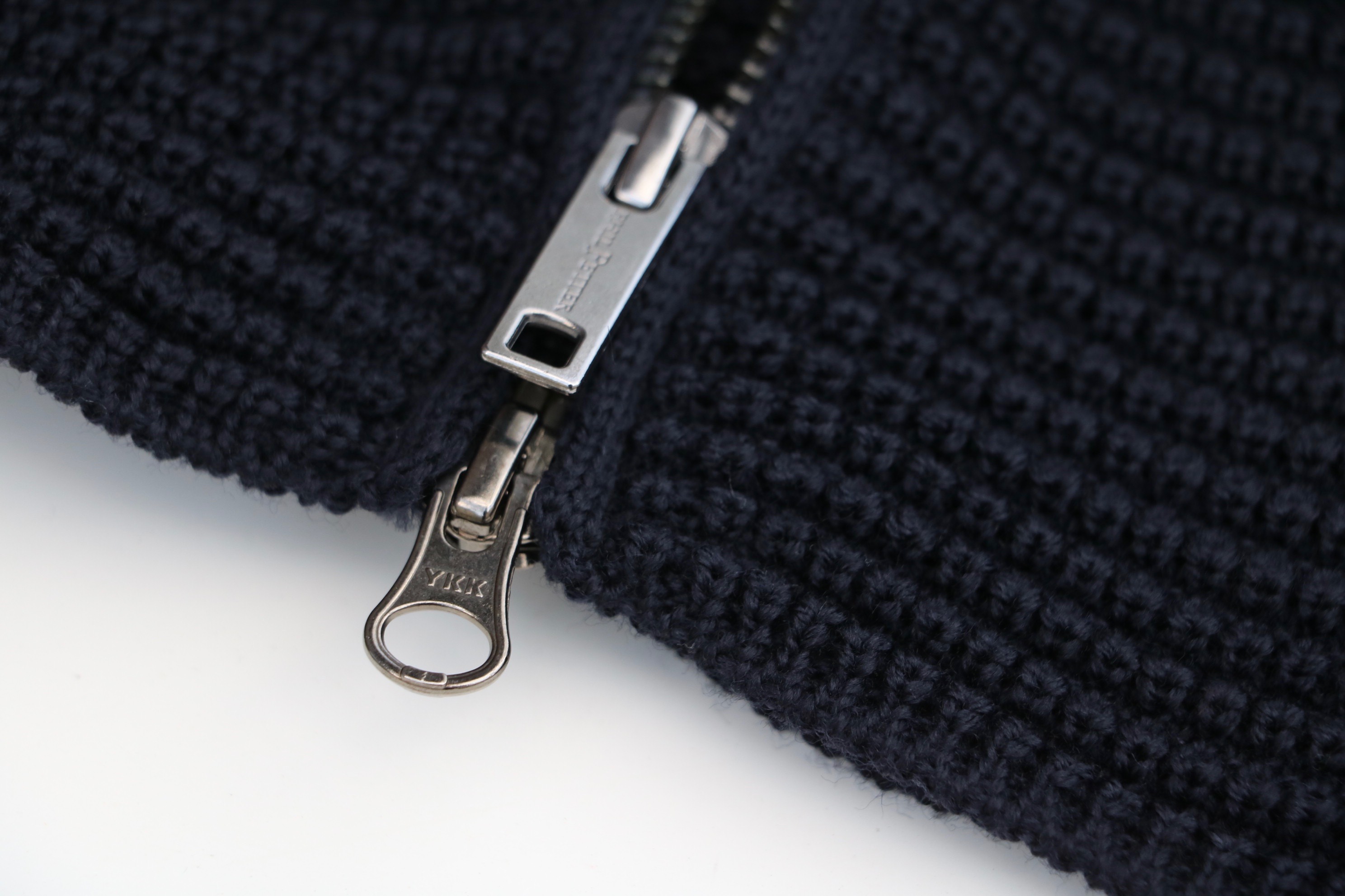 今季の【PHIL PETTER/フィル ぺター】、最後のご紹介となったのは、立ち襟のジップアップカーディガン。縦長にデザインされたフォルムはモダンです。ボリュームのあるボトムが増えている中、この長さは必要になります。もちろん、スリムなデニムとの相性も抜群です。