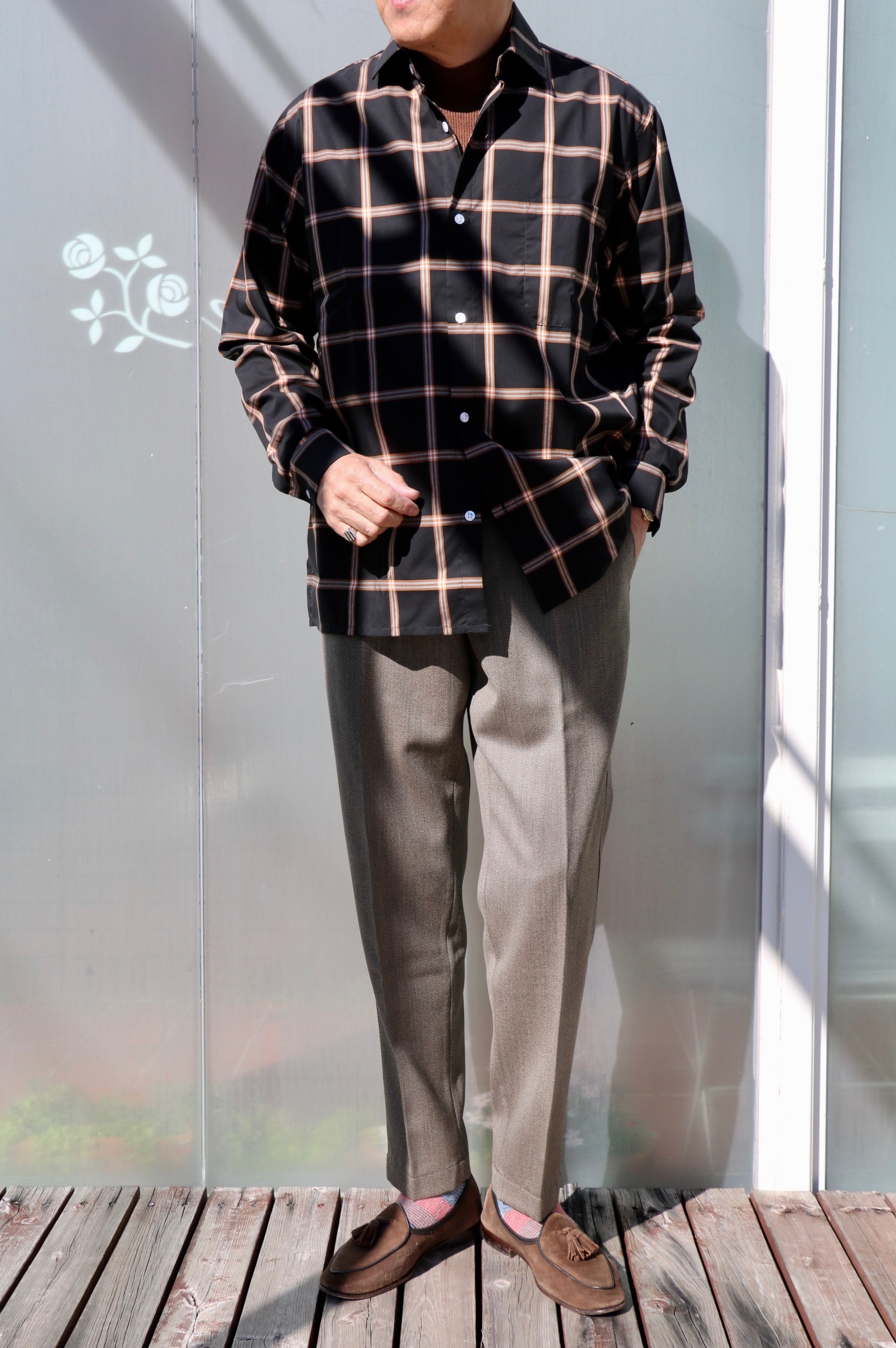 monção/モンサオのシャツ、Borelio/ボレリオのパンツ、BRESCIANI/ブレシアーニの靴下(私物)、BAUDOIN&LANGE/ボードインアンドランジの靴(私物)と、ここ2,3年で存在感を増してきた各専業ファクトリー。どれもが、きちんとした背景を持つ、そんな質の高いアイテムを使ってのコーディネートです。