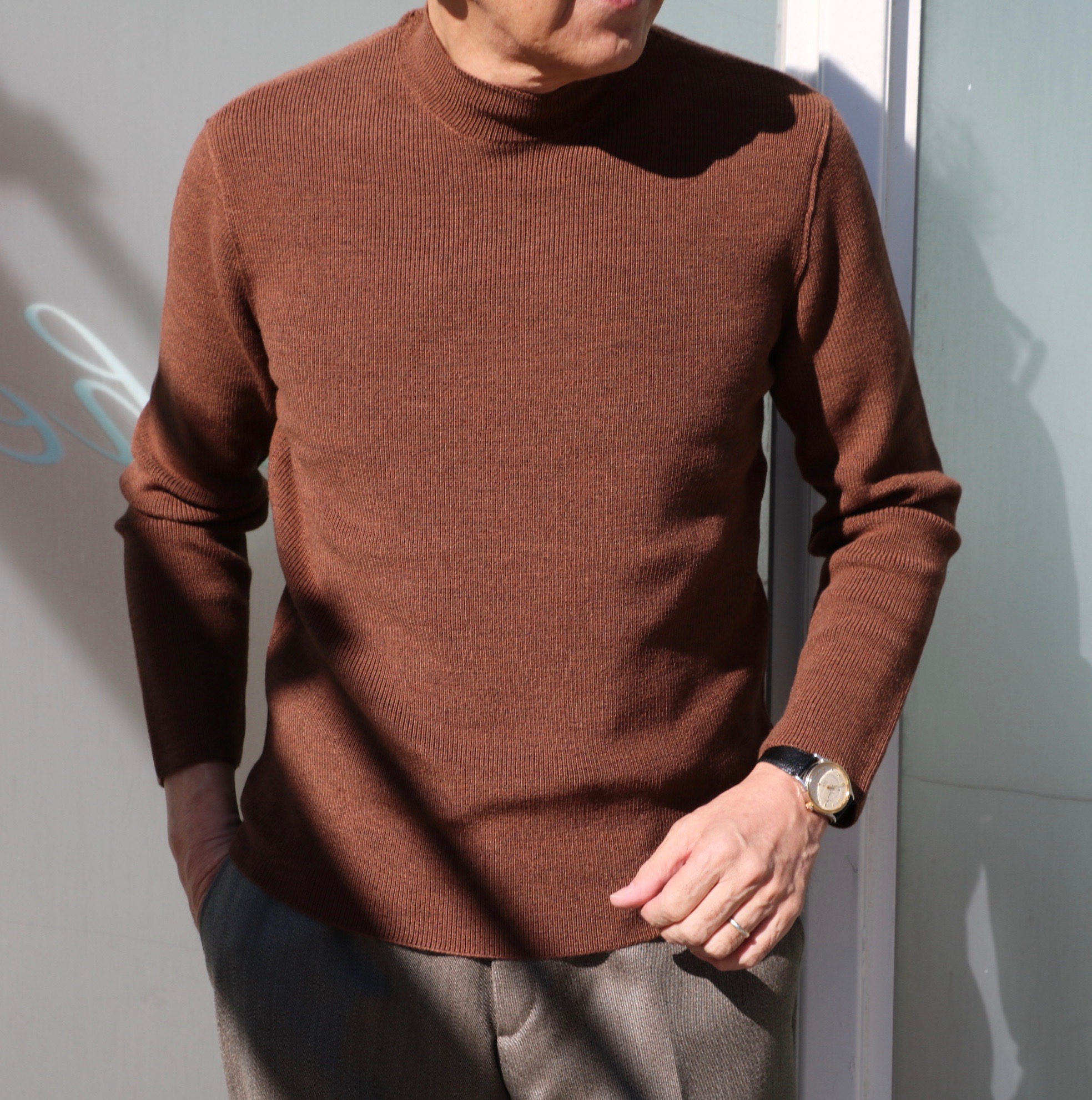 テンションの高いウールニットをカットソーのように気楽に仕上げたモックネックセーター。本体と袖、袖口を切り替えずに編み込むことでラフな印象に見せると共に、すっきりとしたフォルムを作り出します。写真のカラーは、土の香りがするバーントシェンナです。