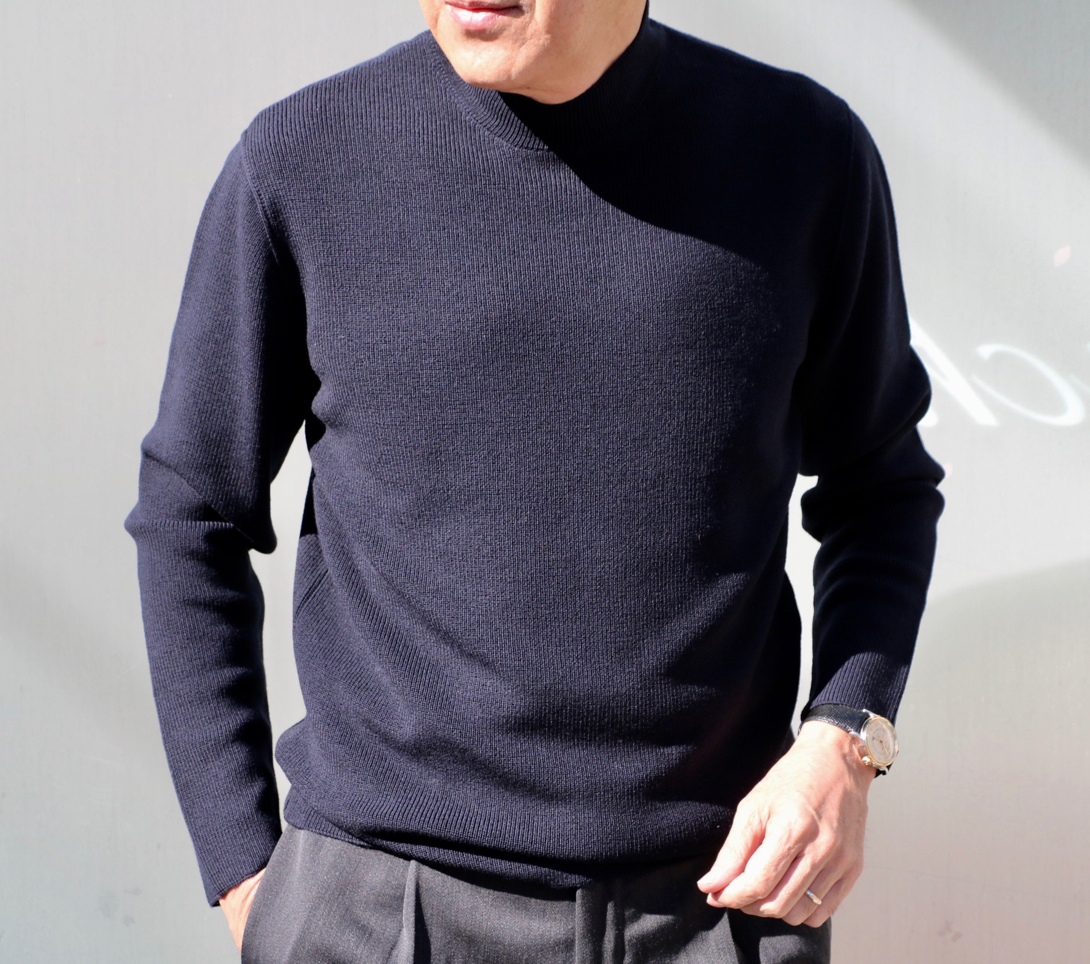 セレクトしているMooRER/ムーレーの中で人気No.3に輝いている「ALEX-OS」。生地感と使っている青色の美しさに目が眩んだのか、今季、2着目を決断されたN様にもオススメしたいモックネックセーターです。合わせたパンツはPT TORINO/ピーティートリノのDENIMです。