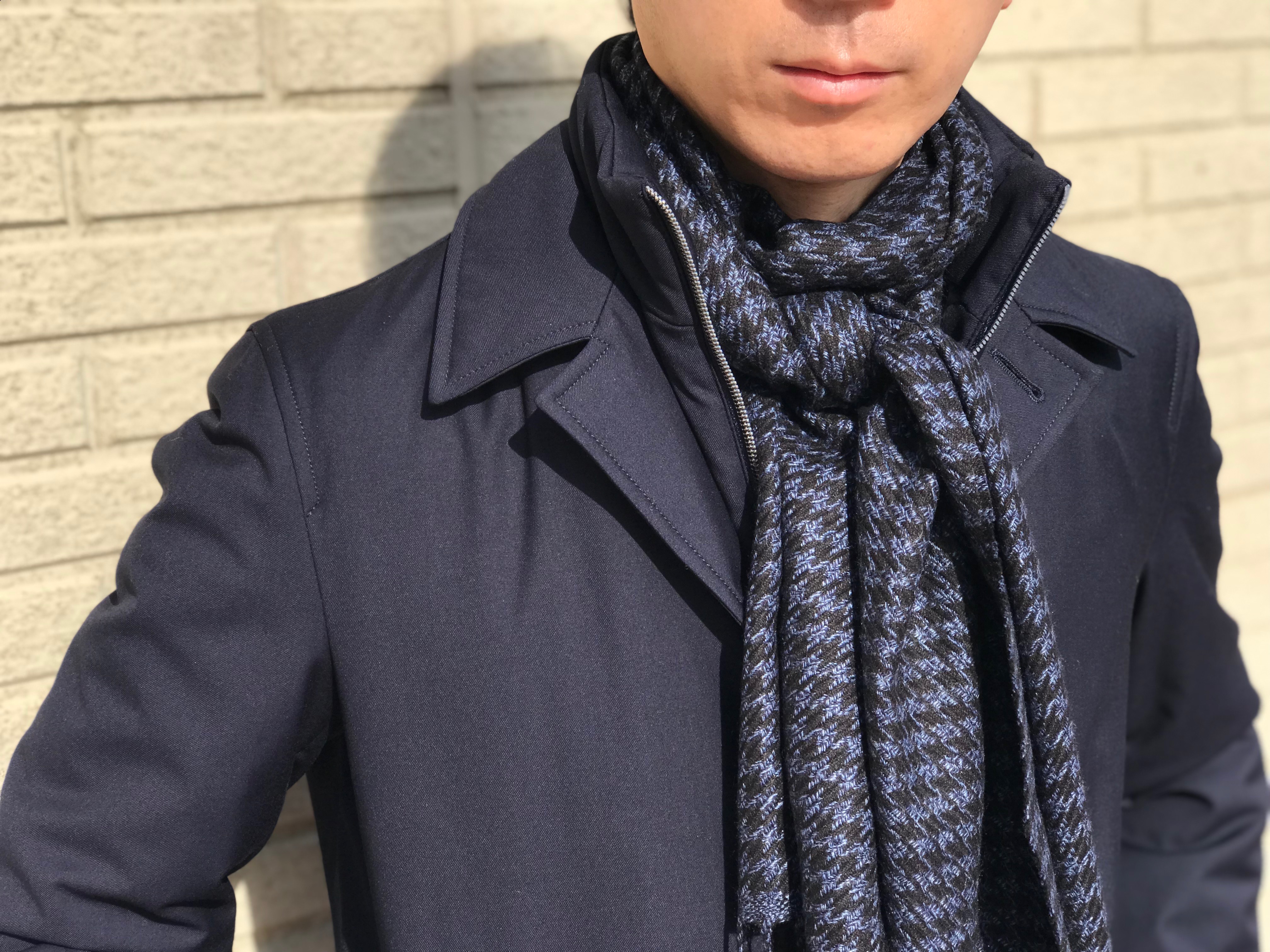同色のグラデーションコーデをしても、質感が違えば埋れてしまうことはなく、アイテムそれぞれの個性が引き立ちます。HERNOのネイビーコートに合わせたブルーのハウンドトゥース柄マフラーも、シルク&カシミアの風合いが、ナイロンコートの中で存在感を発揮しています。