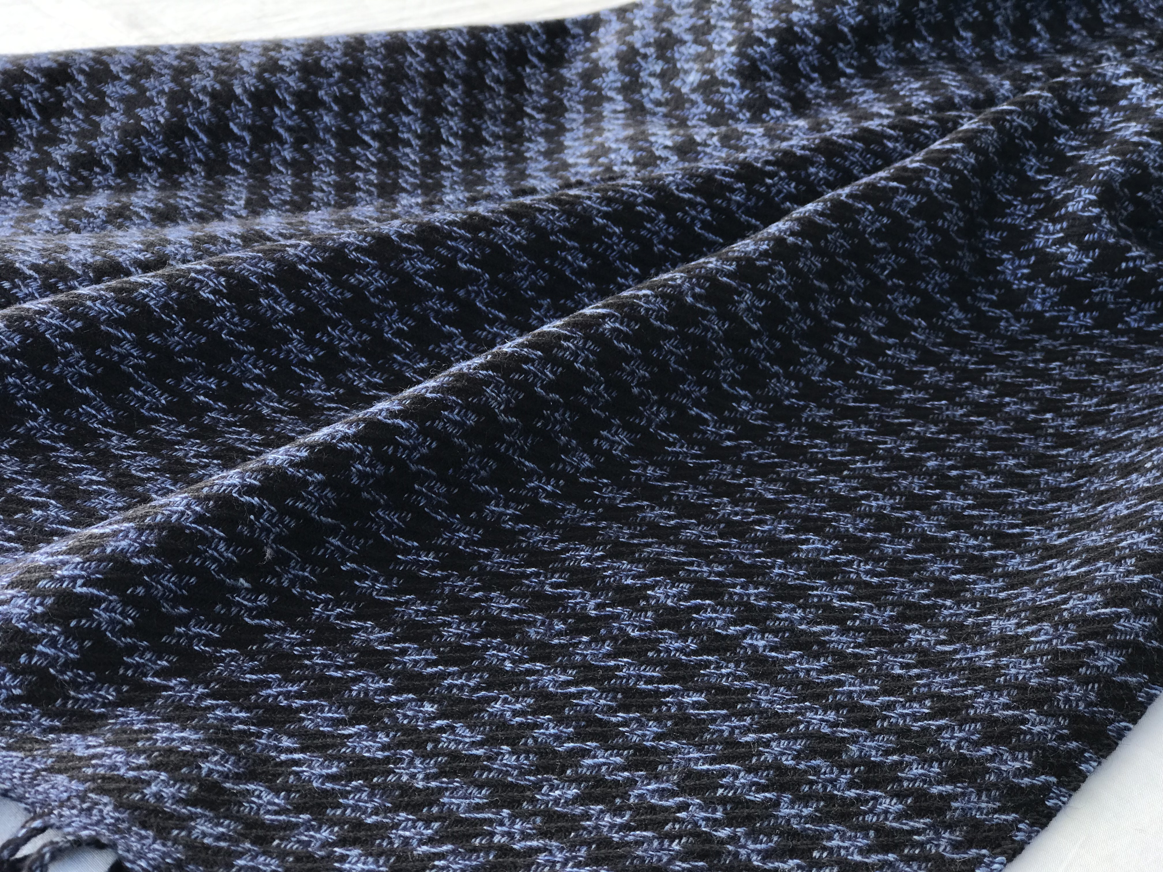 ブルー×ブラックのハウンドトゥース柄には、よーく見ると斜めに織柄が入っており、その凹凸が、表情をより引き立たせてくれます。