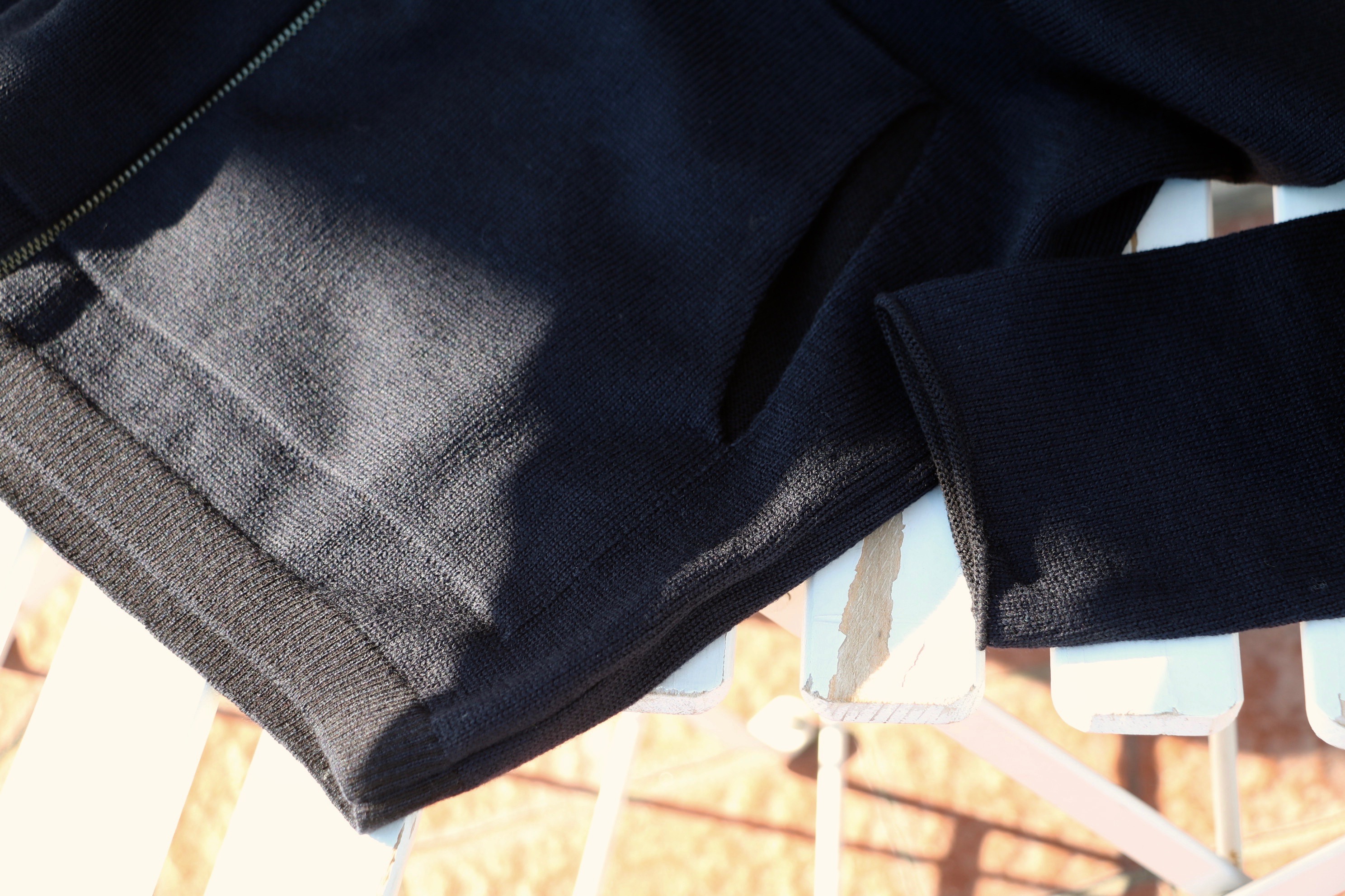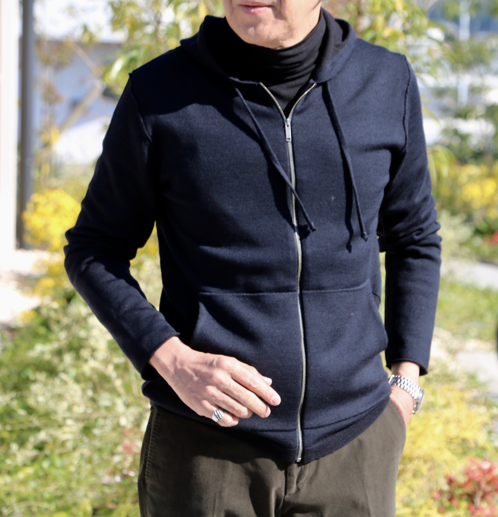 一旦、着替えて、再度、撮影です。本日の出で立ちに羽織ったサイズはM。パンツにゆとりがあるだけに、このぐらいの緩さが気分でしょうか。ということで、私が選んだのは、ネイビーのサイズMです。もちろん、まだ購入できません。本日、通販サイトSUGURU SHOPに掲載されてからです。ウールの温もりと、カットソーの気楽さ、着心地はカットソー以上かもしれません。ぜひ、ワードローブに仲間入りさせてください。