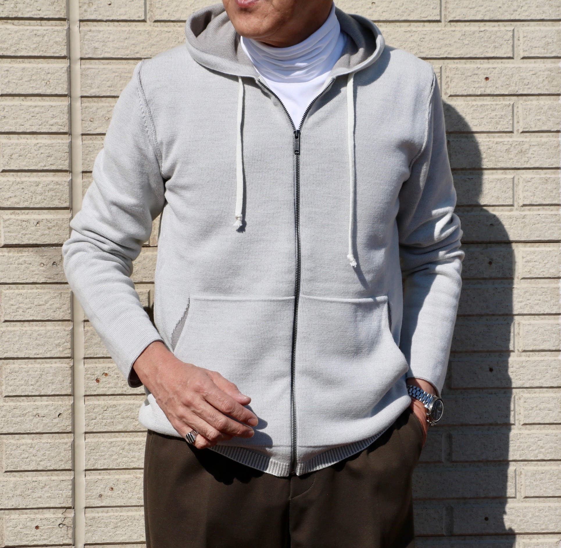 世の中に最も溢れているのは、もしかすればジップアップのパーカーかもしれません。クルマ中心の地方に行けば行くほど、休日のスタイルとして良く見かけます。あの人もこの人も皆同じ。そうなると、ついつい悪い癖が出てしまう天邪鬼的性格。便利なアイテムだと分かりながらも横を向いてしまう、いつまでも大人になれない私スグル。多分、今期のセレクトを振り返っていただくと、フード付きのアイテムは少ないはずです。ただ、ここだけは通り過ぎ禁止のジップアップパーカーだったんです。