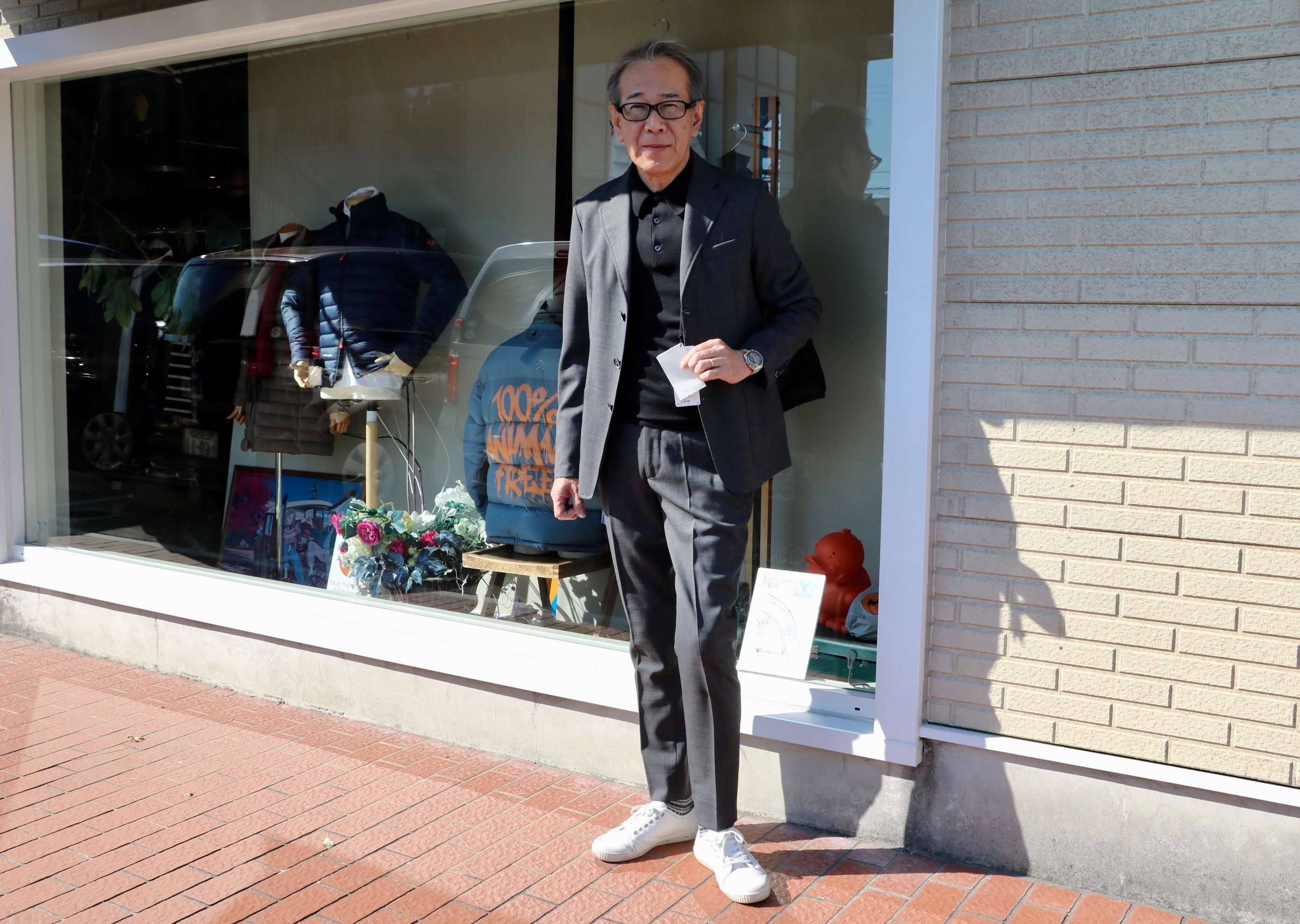 袖付けの修理が終わり、早速、着用して「はい、ポーズ」。創業当時からお付き合いいただいているA様。断捨離して着るものがないからと、入荷後早々にお買い上げいただきました。