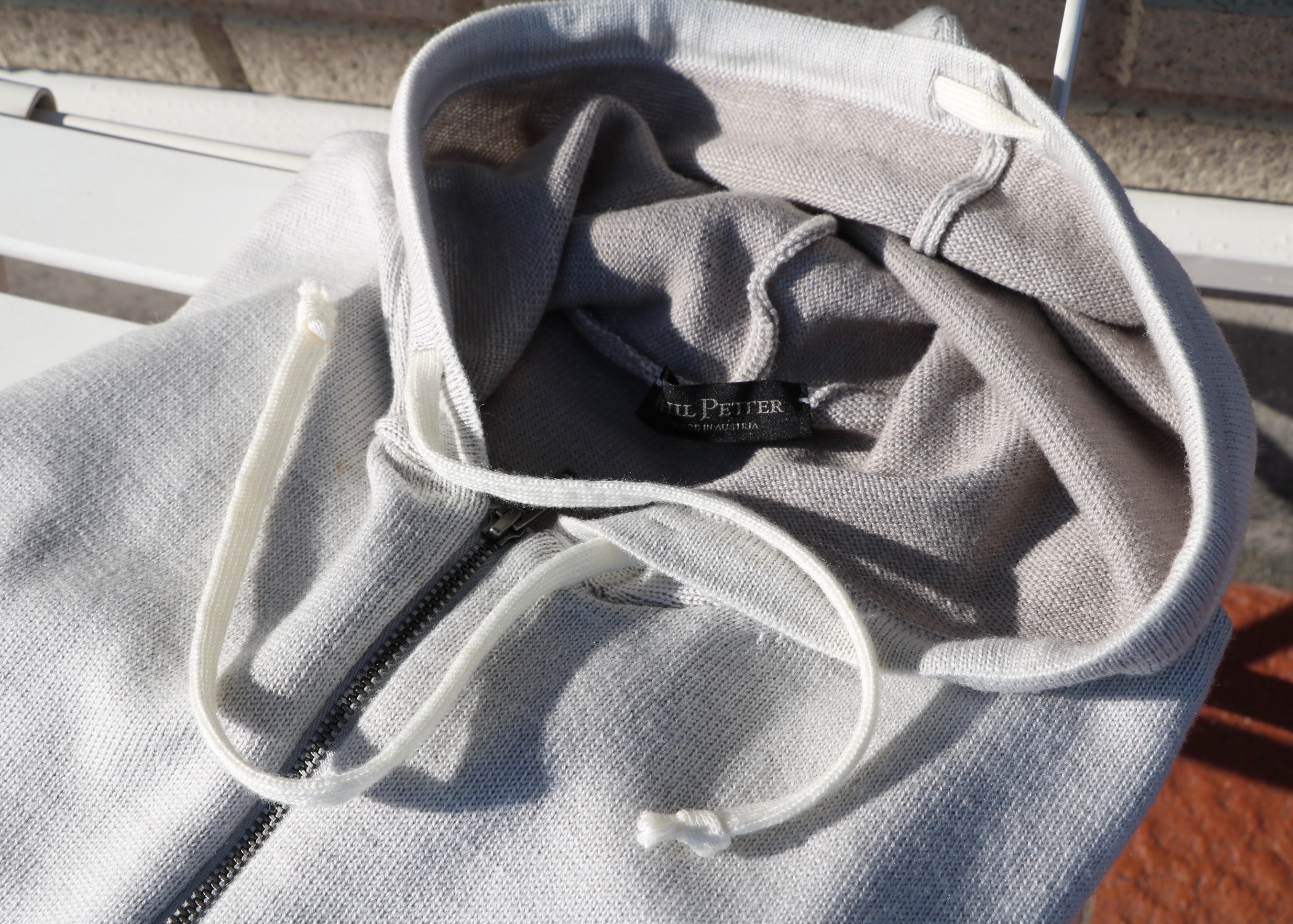 光が当たれば、さらにまろやかです。ウール・コットンのダブルフェイスの表情はとても豊か。表身頃のオイスターホワイトから、フード裏、袖や裾口、そしてマフポケットにちらりと見えるグレージュ。経験豊富なオトナのしなやかさです。