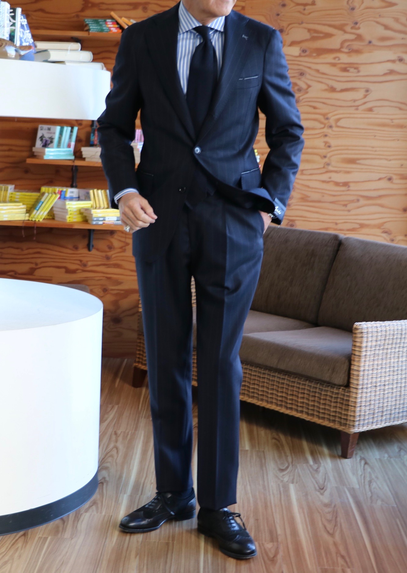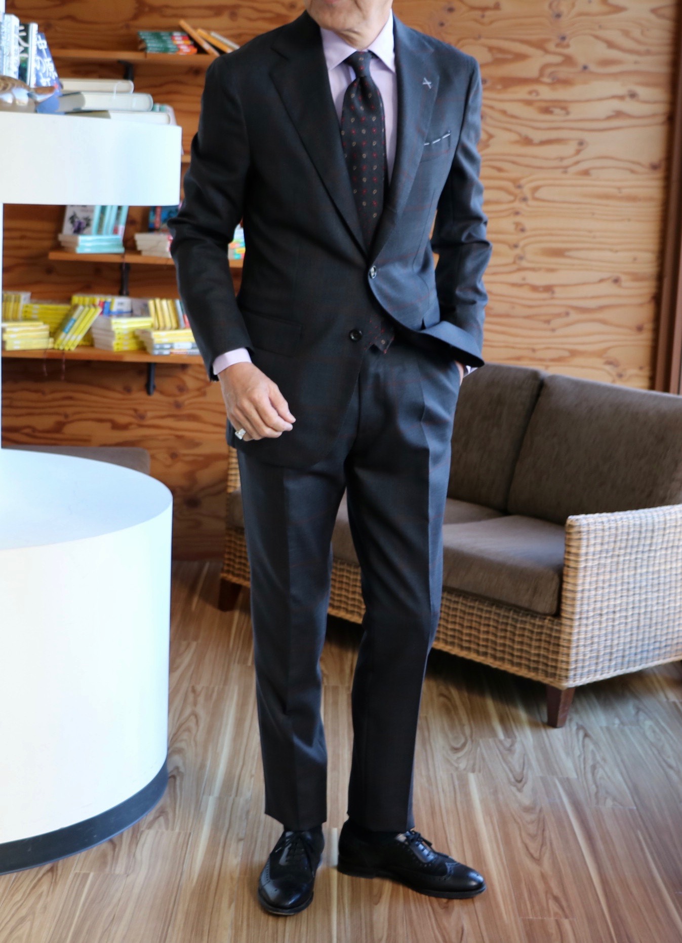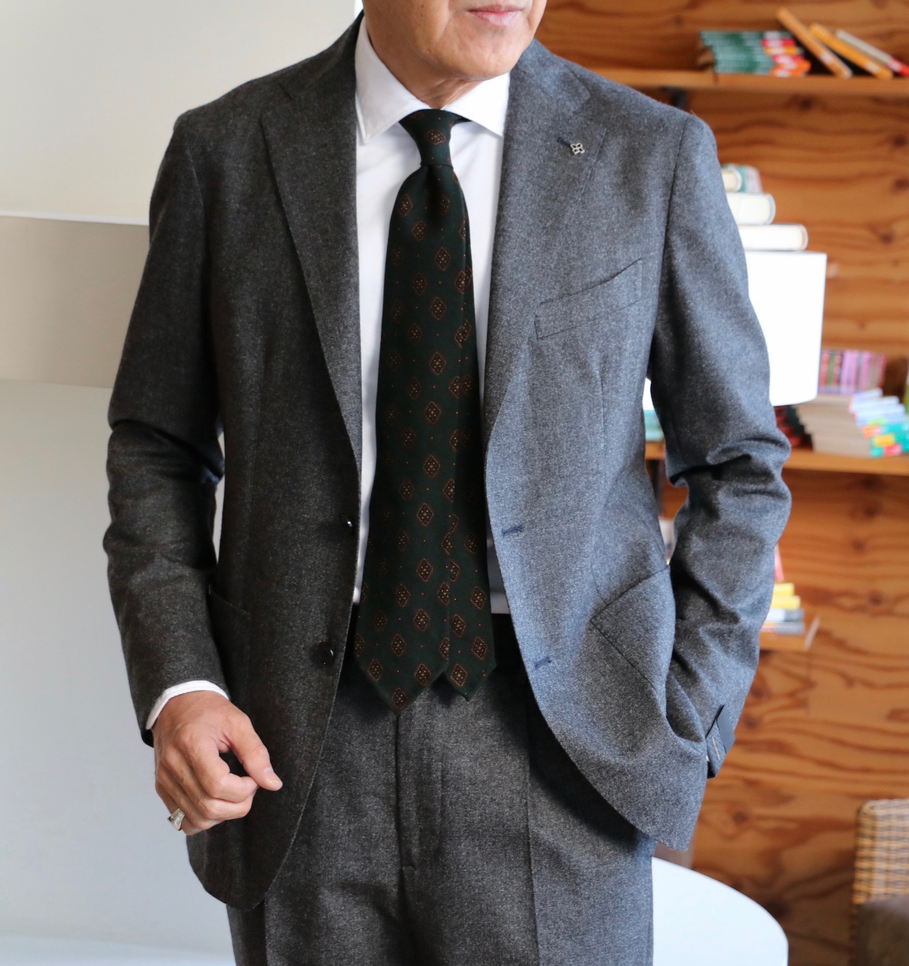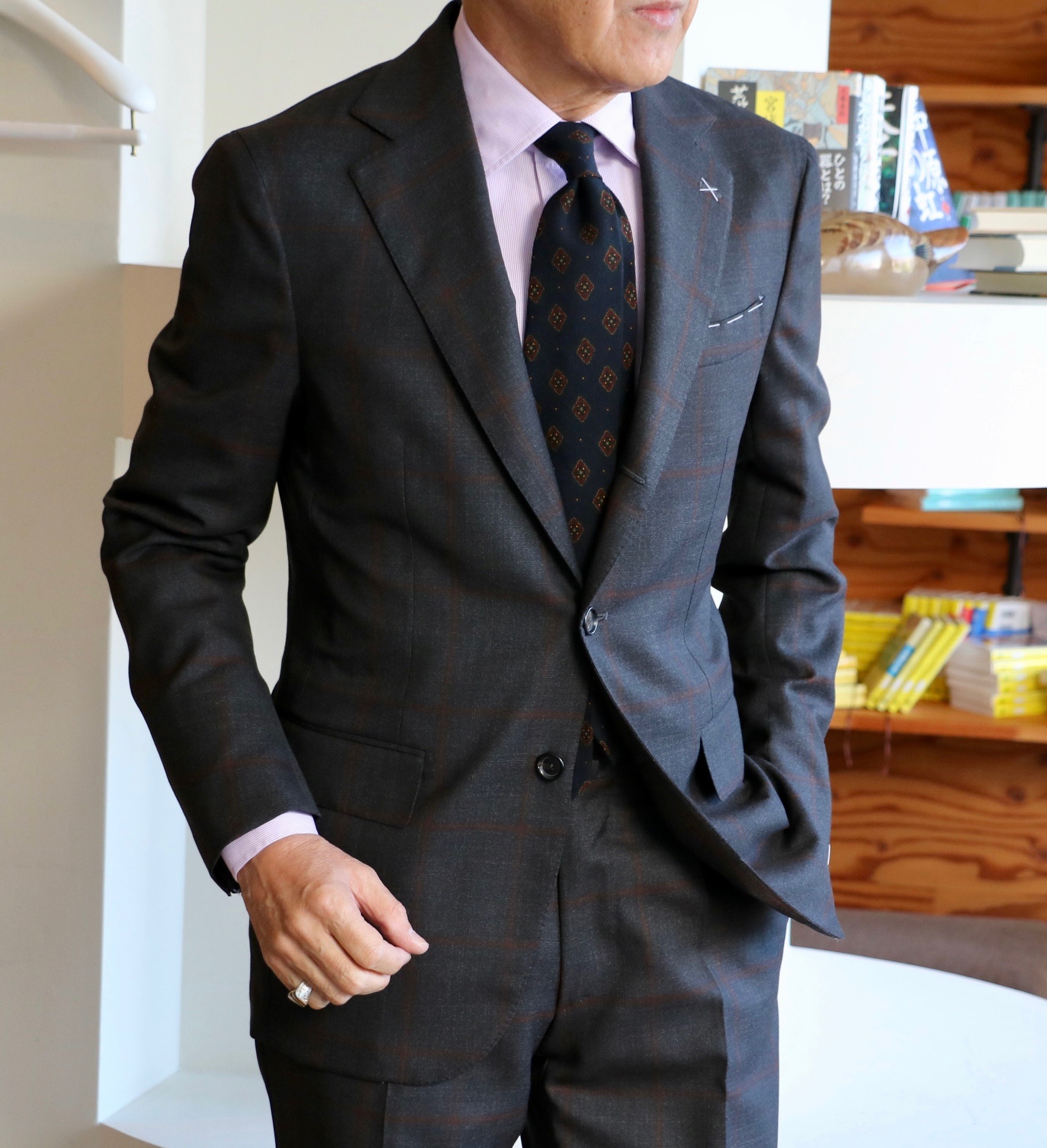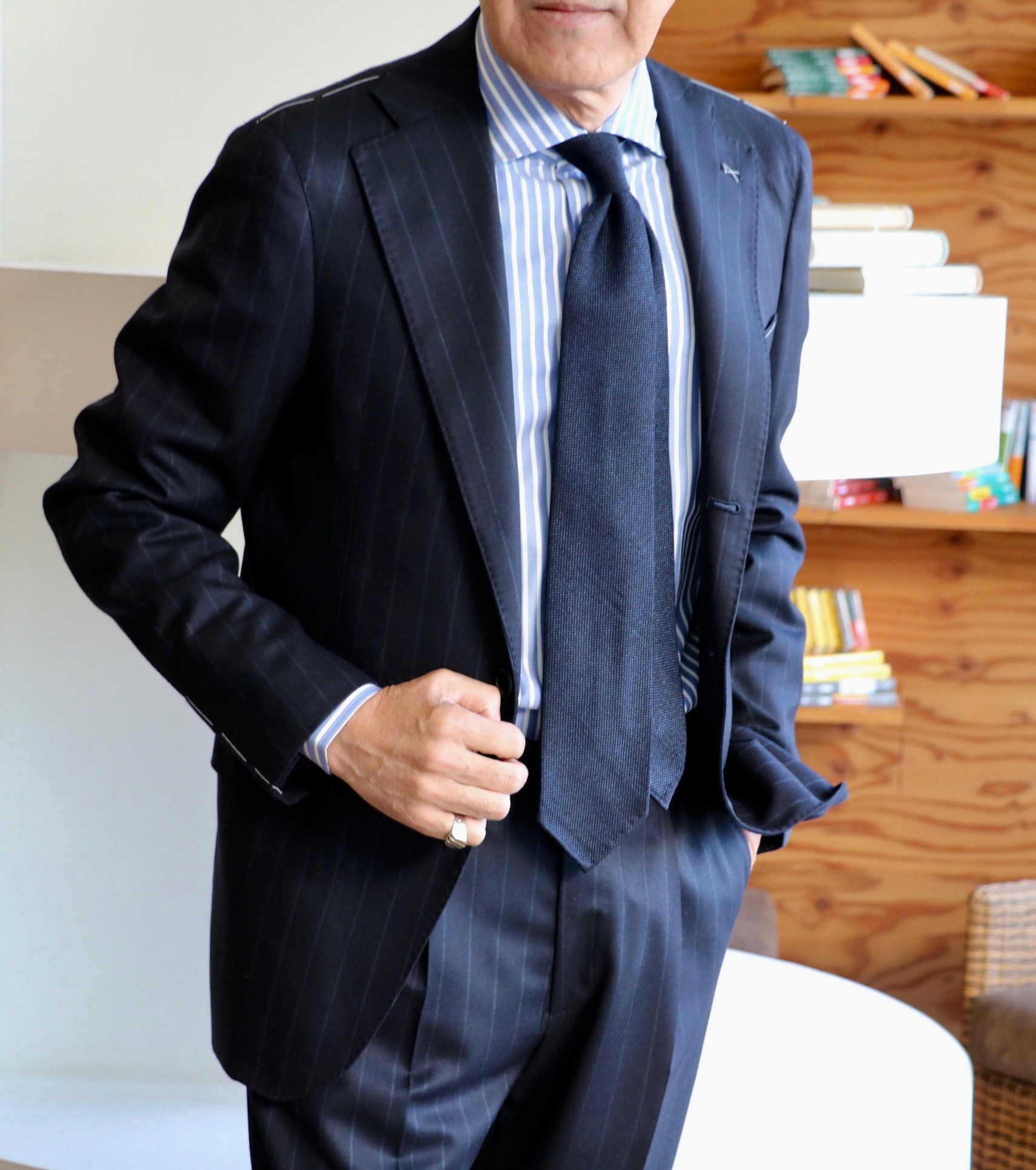 そんな秋晴れの心地良さに気分も上がるのか、久しぶりにスーツを新調しようなんて、そんな前置きからです。先週の休み、こちらも久しぶりに息子が実家に顔を出したのです。目的は、断捨離の手伝い。「着ないものがあったら、持っていくよ」の声に、これも、あれもとクローゼットから引っ張り出したものの、いざとなると、これはダメ、これも着るかも、これは確かルカ(元カルーソ)が来店の際、スミズーラした記念のスーツやジャケット。これは着ていないけど、今年は着るかも...なんて、結局、ジュニアの成長で着れないからといって譲り受けたスーツのみを手放すことに。あとは数本のパンツ。「これだけ?来た甲斐がないなぁ」なんてボヤかれながらです。