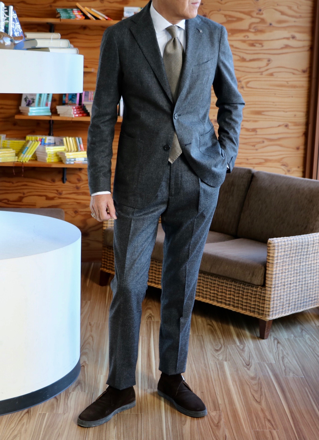 このスーツは、どちらもDe Petrillo(デ・ペトリロ)。ホームスパンとコーデュロイのスーツです。着用サイズがなくて、合わすことができませんでしたが、今回、ご紹介させていただいたネクタイと相性の良いスーツです。