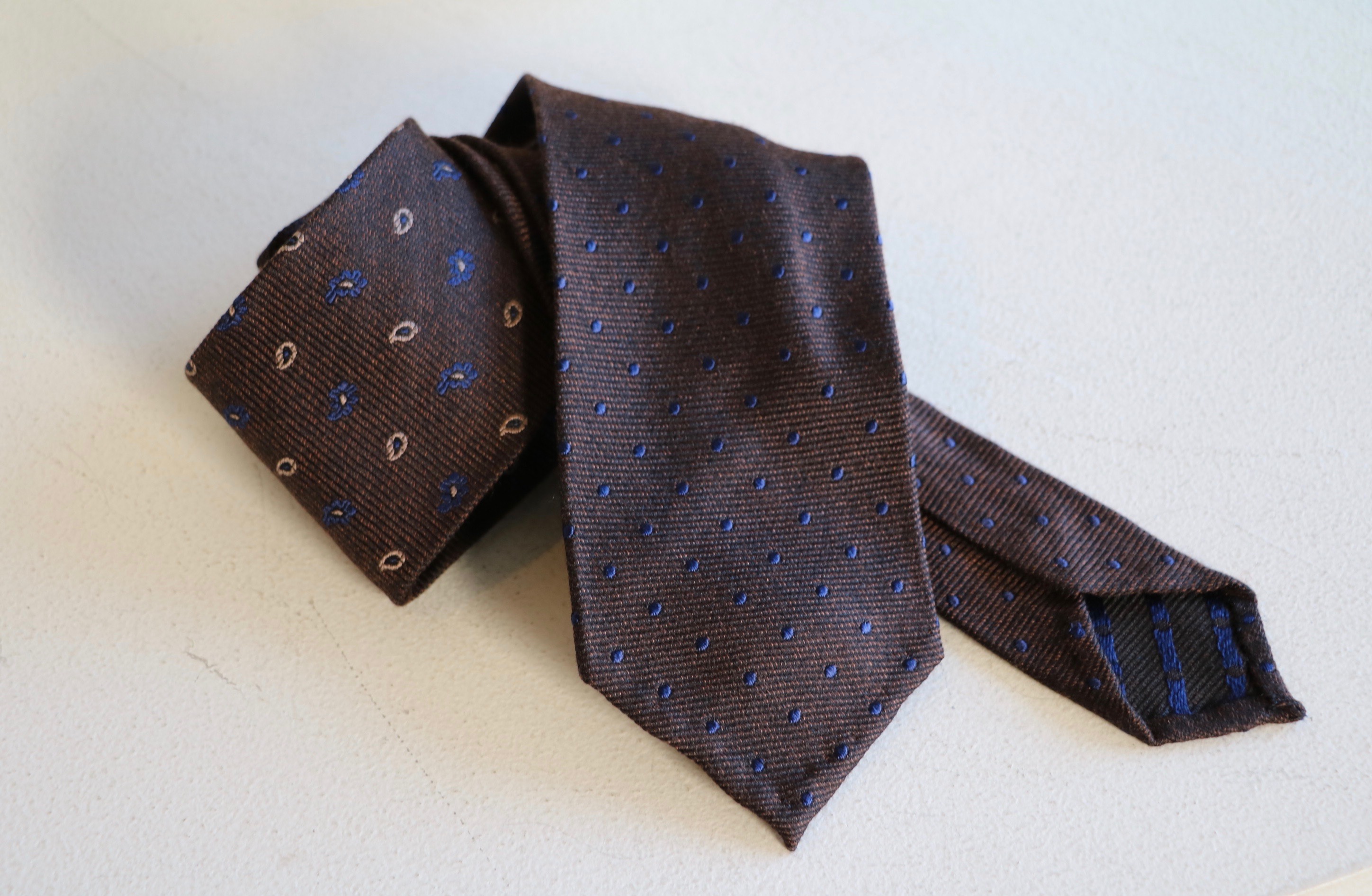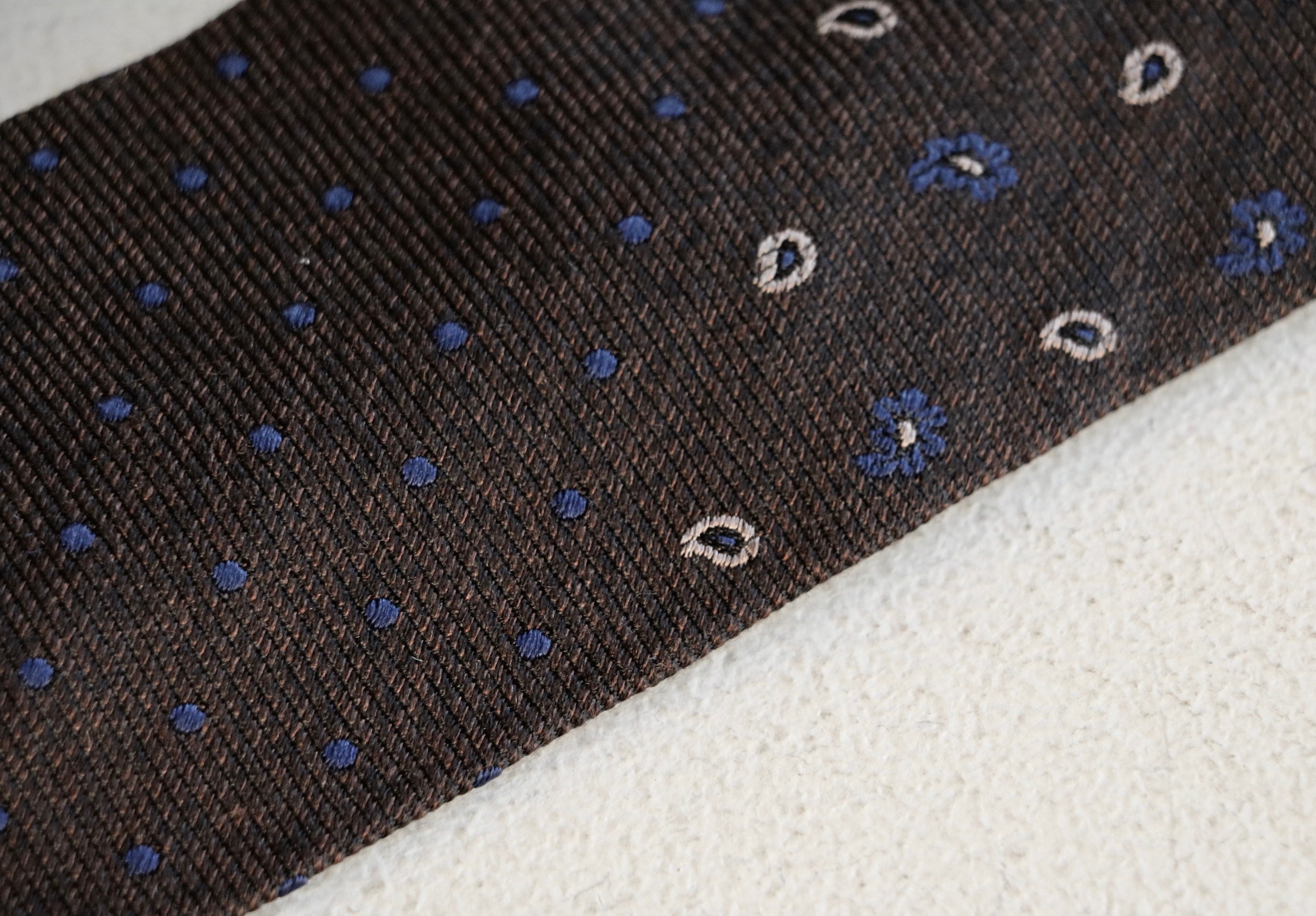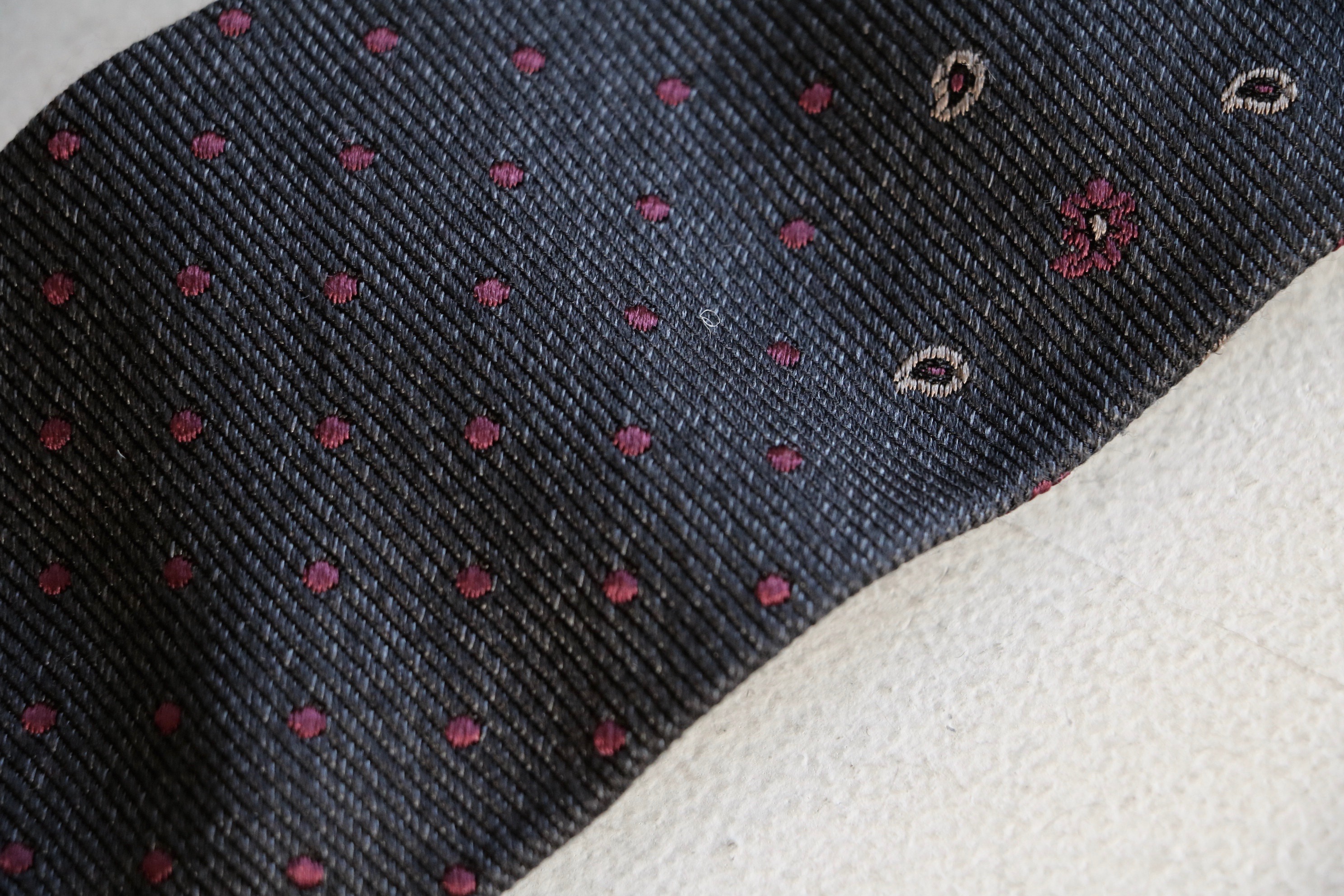 お分かりでしょうか。ペイズリーとドットと、二つの柄で構成されるシルク・ウールのネクタイです。