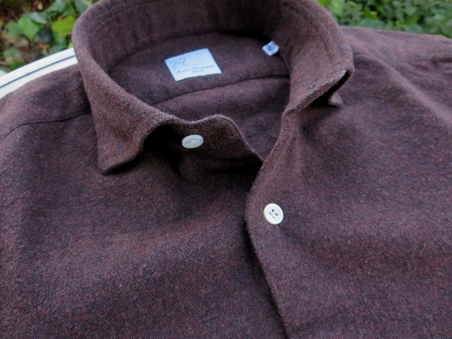 コットンフランネル、いわゆるネル地ですが、起毛感は抑えめ。ネイビーにタンブラウンを配したベーシックなチェック柄です。ネイビー、ブラウン好きの方には重宝するシャツに。上の写真、「CELOTTI/チェロッティ」に合わせたのも、こちら。ただ、シャツ単体での写真を撮り忘れておりました。申し訳ございません。