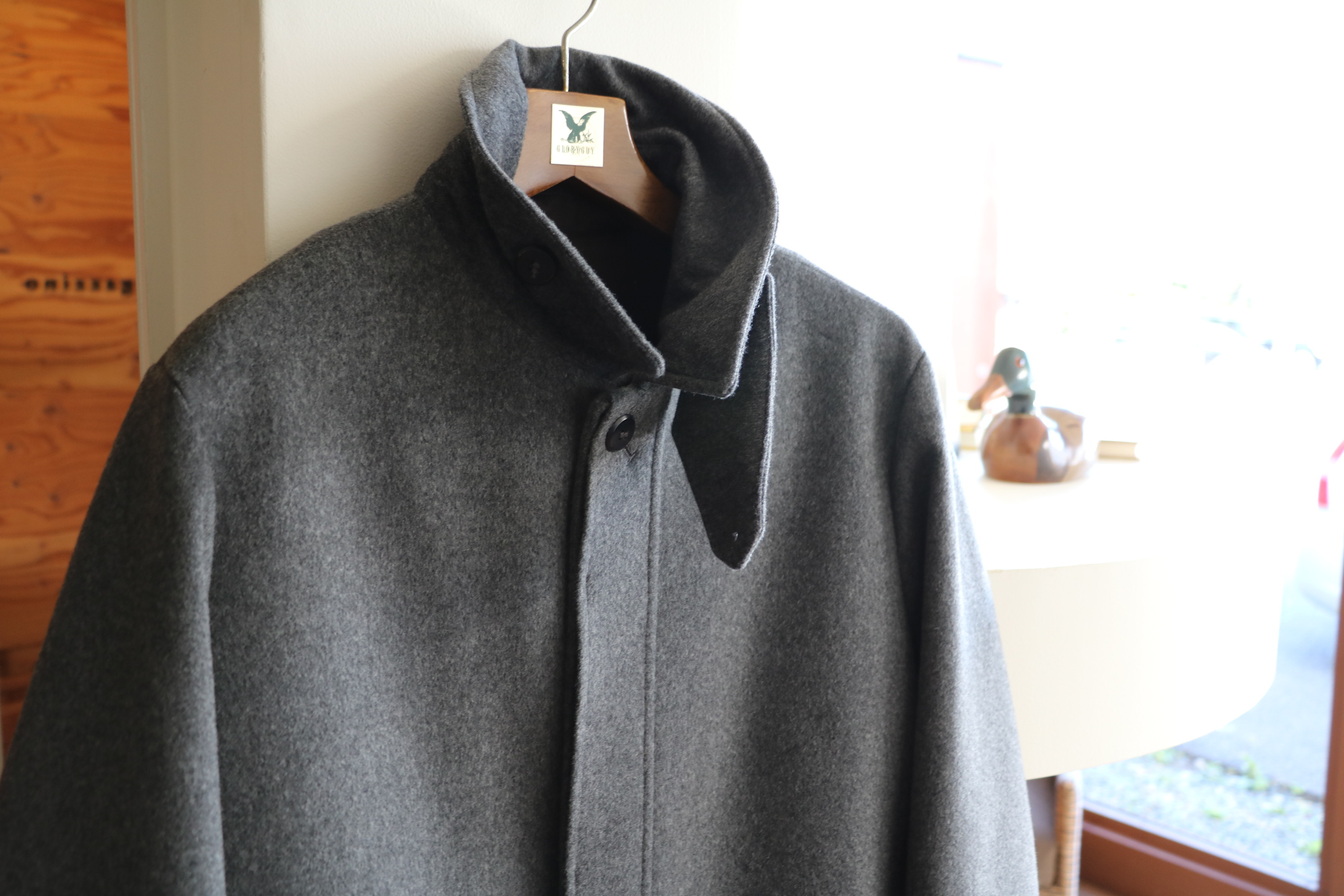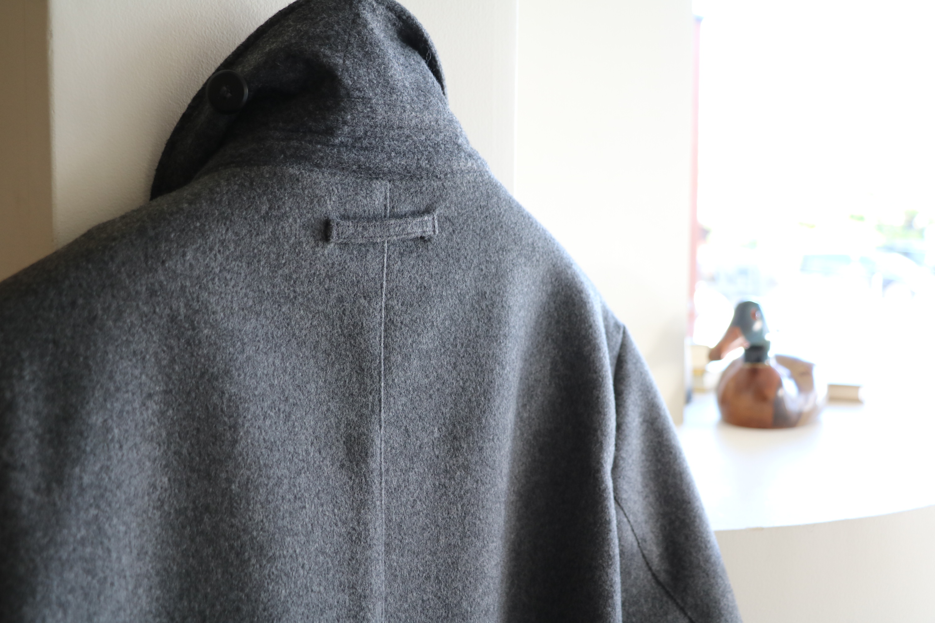 後ろ姿もシンプルです。そして、さらに購買意欲をかき立てたのが、グレイの色目。ありそうでない、なんて安易な表現で終わらせたくないミディアムよりややライトに近づけた霜降りグレー。いつまでも愛着を持って着ることのできる、このコートを着る季節が待ち遠しくなってしまいそうな、そんなバルカラーコートです。
