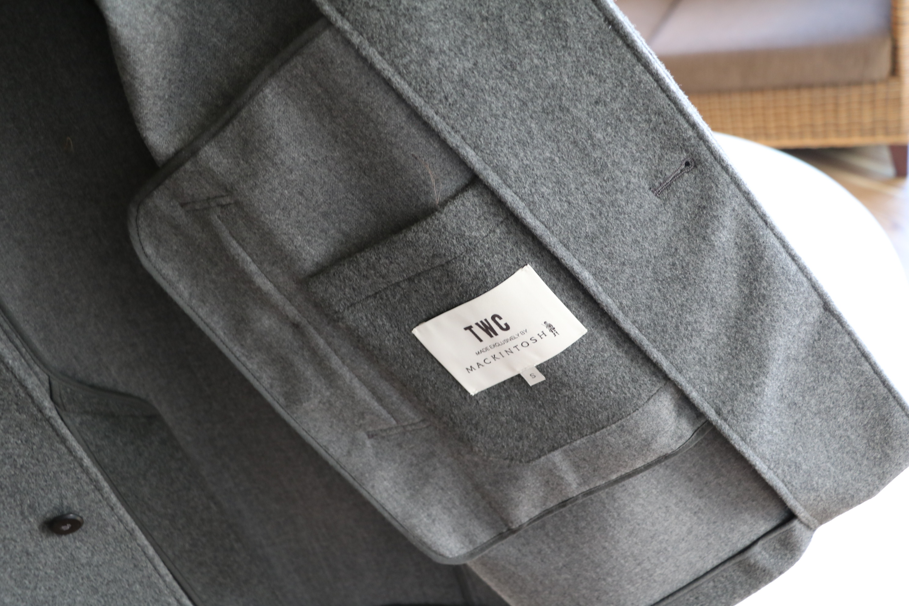 何が魅力かといえば、まずは生地。しなやかでありながらタフさのあるウールメルトン地。それもなんと、MACKINTOSH(マッキントッシュ)の持つヴィンテージファブリックを使い、ボンディングで重ねたダブルフェイス。実はマッキントッシュ社とのコラボによって生産されたコートなんです。ここもマスヤマがブログで詳しく書いておりますので参照下さい。