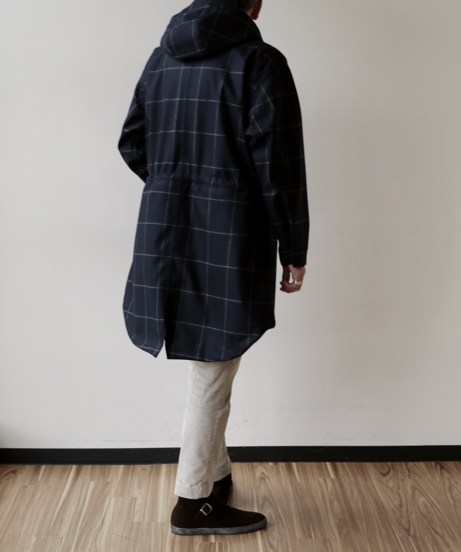 MODEL:ボンデッドウール ウィンドウペン柄 フーデットオーバーコート(パッカブル)