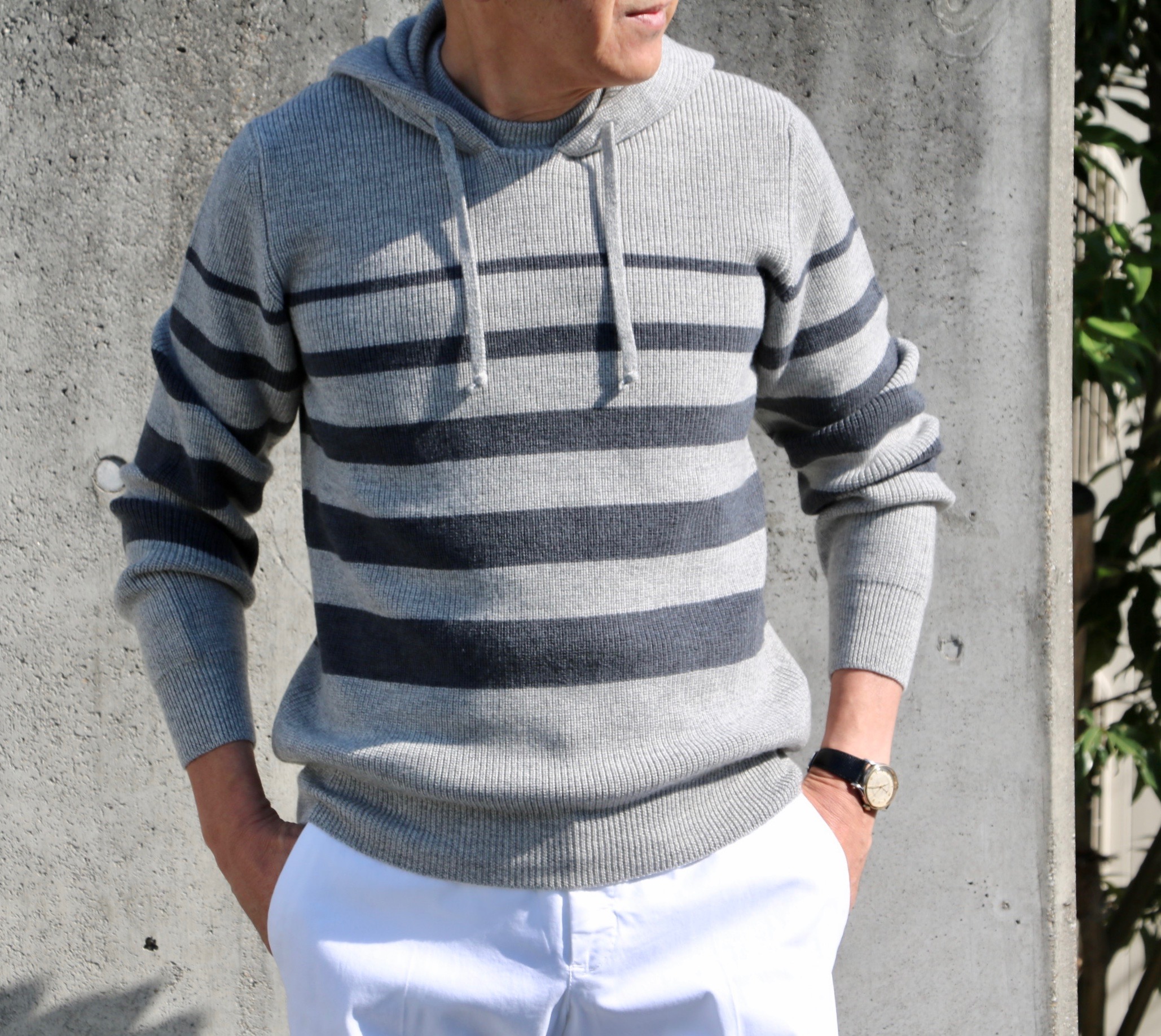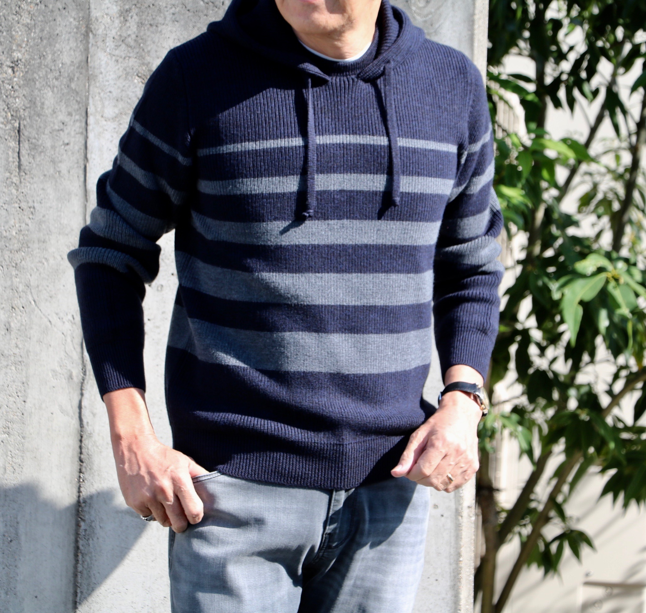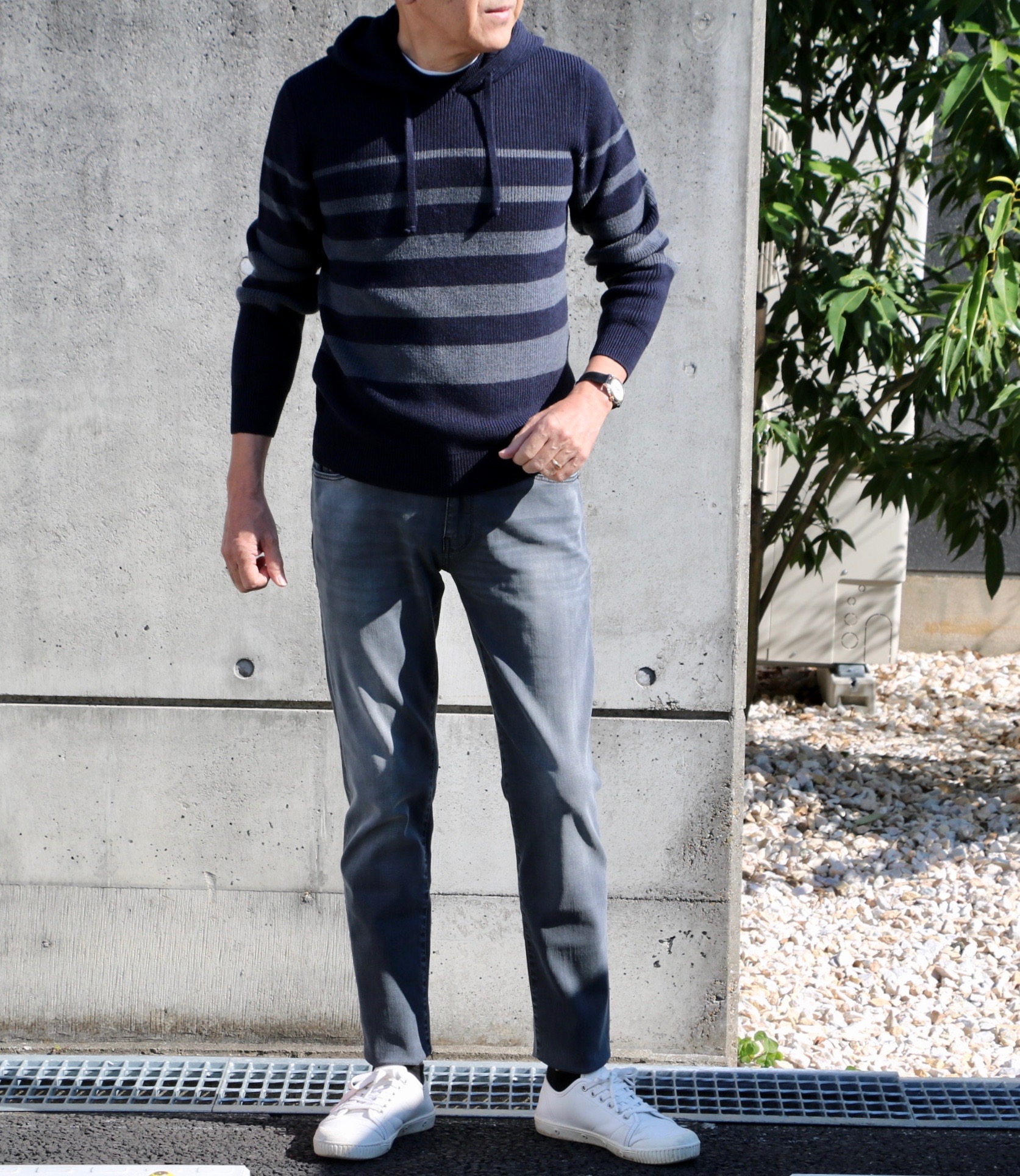 冬こそホワイトのパンツ(PT TORINO)とグレイのパーカーで合わせて見ました。足元もデッキシューズ(Paraboot)でウインターマリンです。ネイビーの方は、ボーダーのグレイに合わせて、PT TORINO DENIMのグレイデニムで。足元は爽やかに私物のホワイトスニーカー(Spring Court)です。