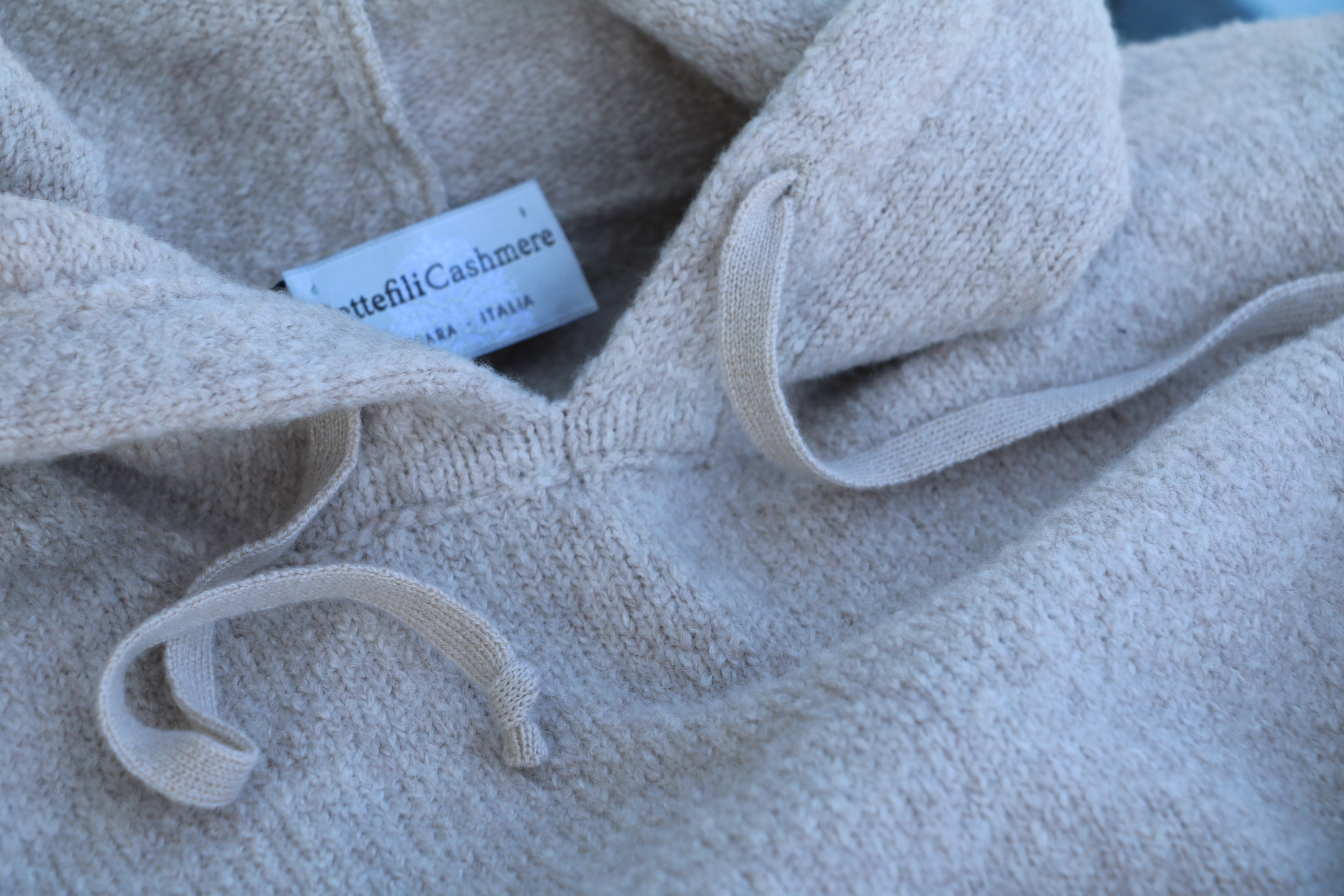 襟元に注目ください。通常のパーカーと異なるのは、ラウンドネックと本体とのリンキング部分からフードを取り付けていることです。大きく見えかたが変わることはありませんが、襟元が詰まることで端正な首元に。デザイナー兼オーナーのミケーレ氏の拘りを感じさせてくれるニットパーカーです。