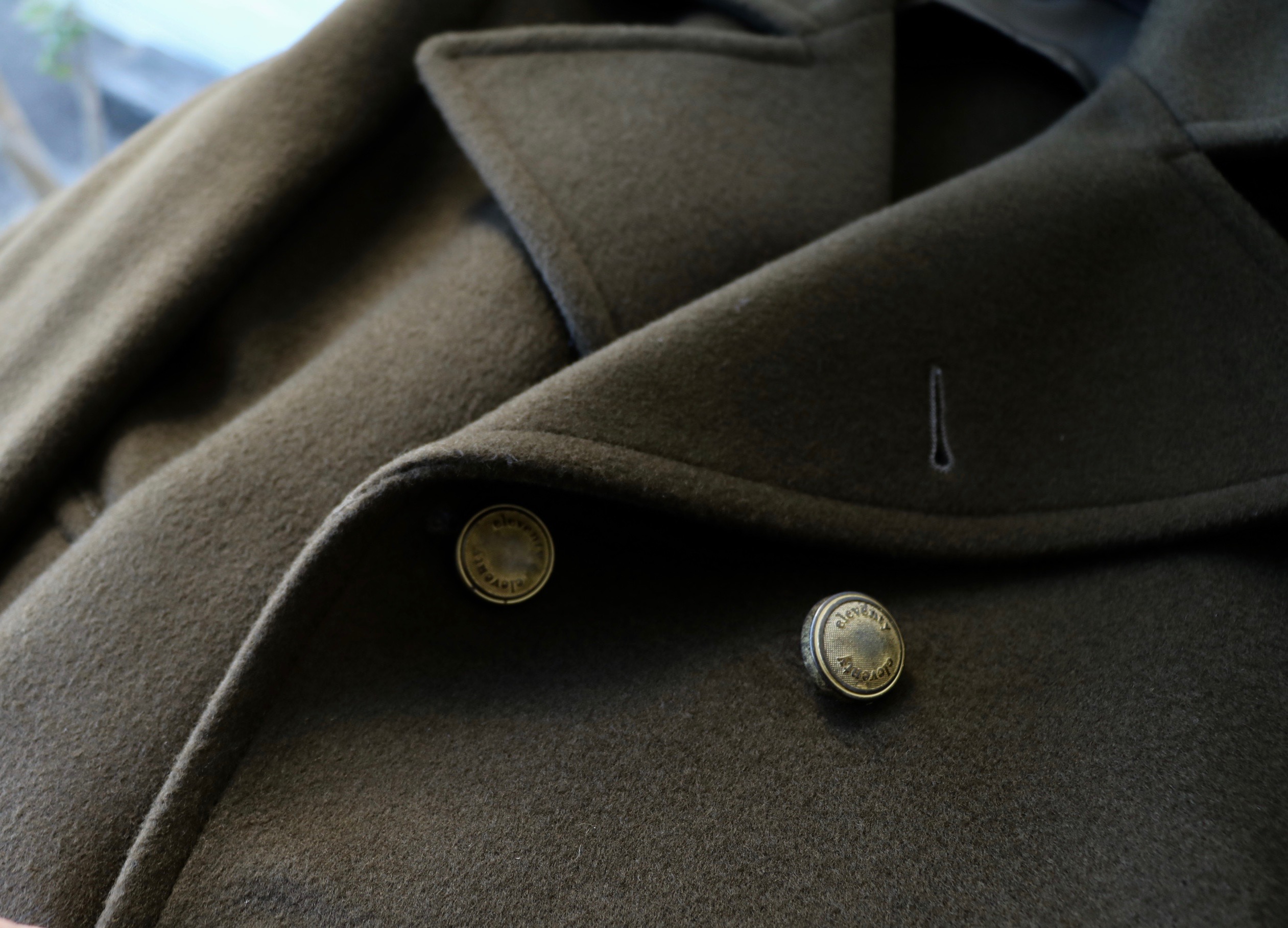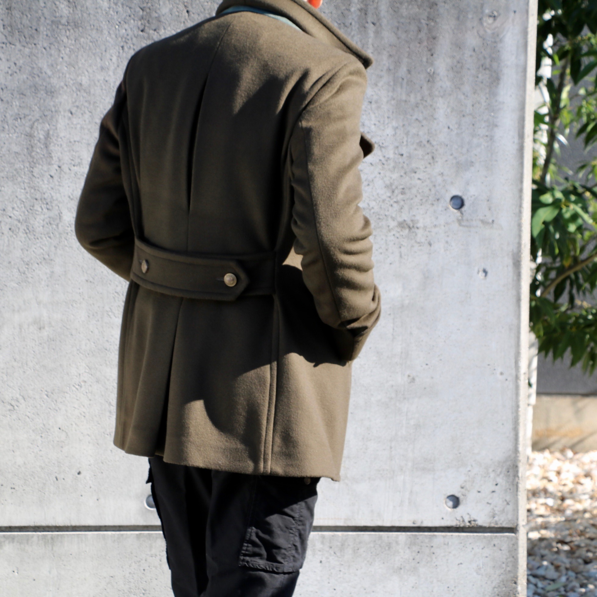 ウール・ナイロンのメルトン生地は、カシミアが入ることで、その手触りはソフトです。幅広のリーファーカラーにメタルボタンのダブルブレストが男らしいフォルムを作り出します。ただ無骨に見えながらもスタイリッシュ。着心地も軽快です。