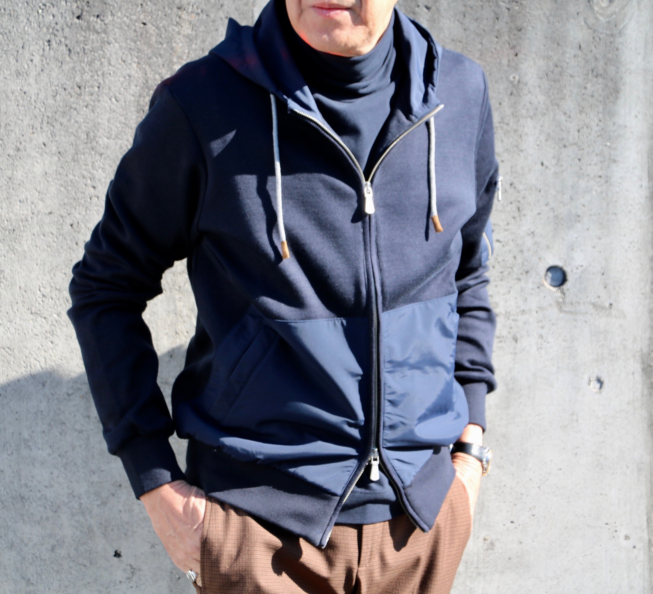 売り場の片隅に澄まし顔で出番を待っつていたのが、素材切り替えのジップアップパーカーブルゾン。着用シーズンも長く、使い勝手の良いアイテムです。