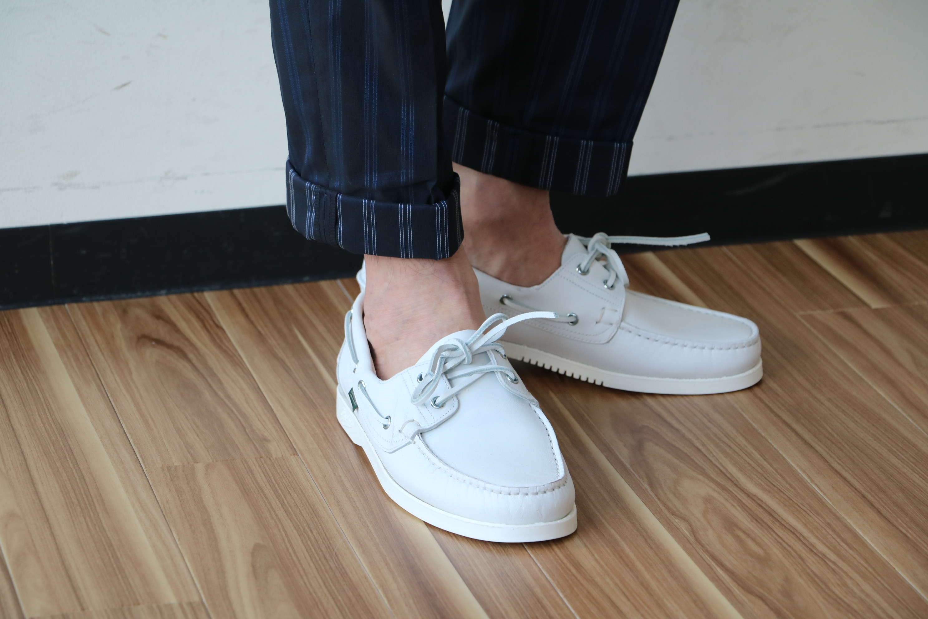 セレクトカラー4色のうち、INCOTEX(インコテックス)で合わせたホワイト、PT01(ピーティーゼロウーノ)で合わせたネイビー。足元は、もちろんBAUDOIN&LANGE(ボードイン アンド ランジ)です。