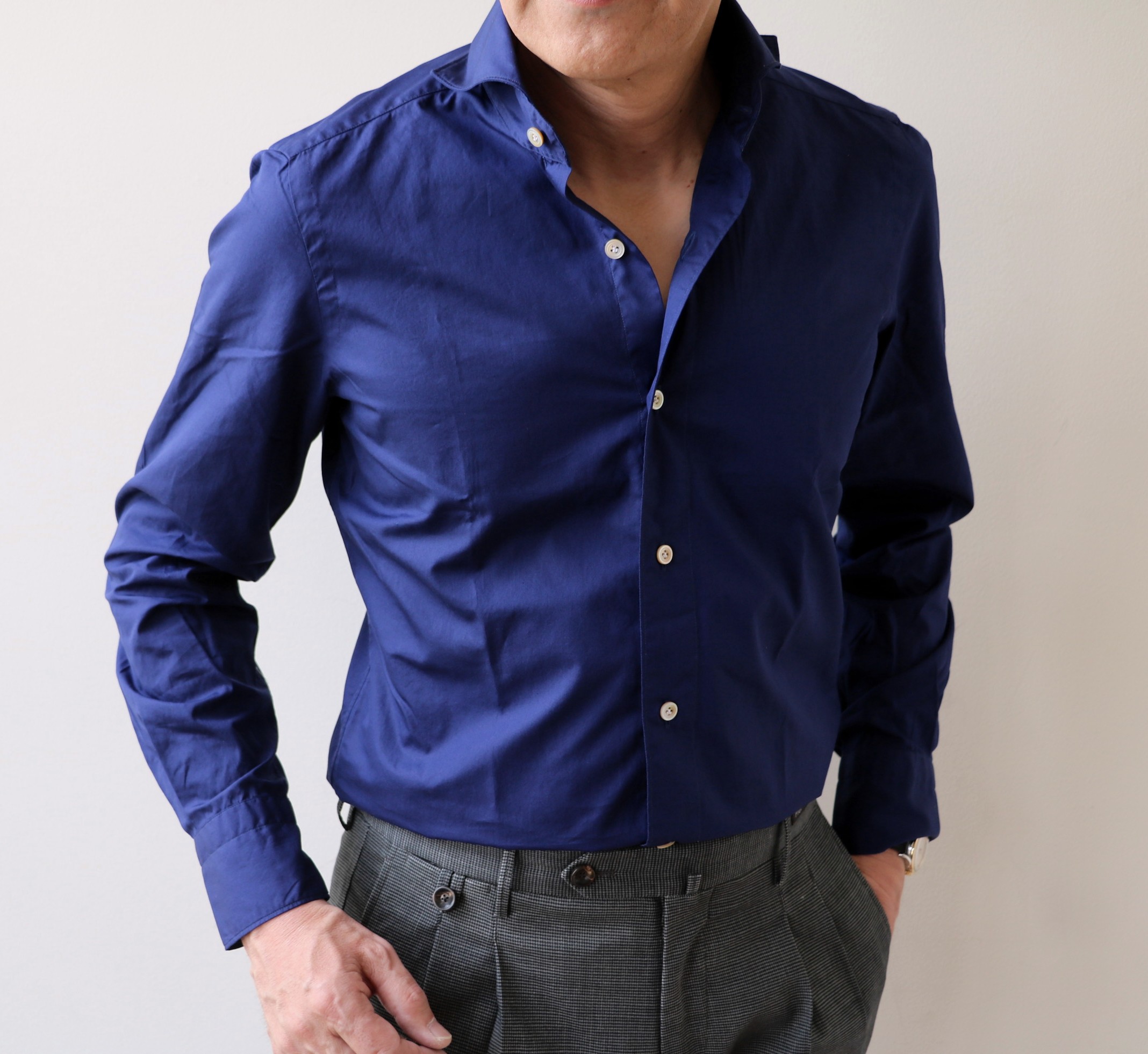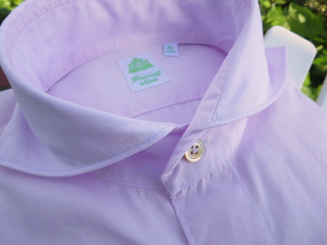 そして本日も引き続き、【Finamore/フィナモレ】をご案内します。4月17日のブログに遡っていただくと、6年前のジュニアとの写真が載っています。その際、二人が着ているのはフィナモレのシャツですが、私の衿の開きにご注目ください。