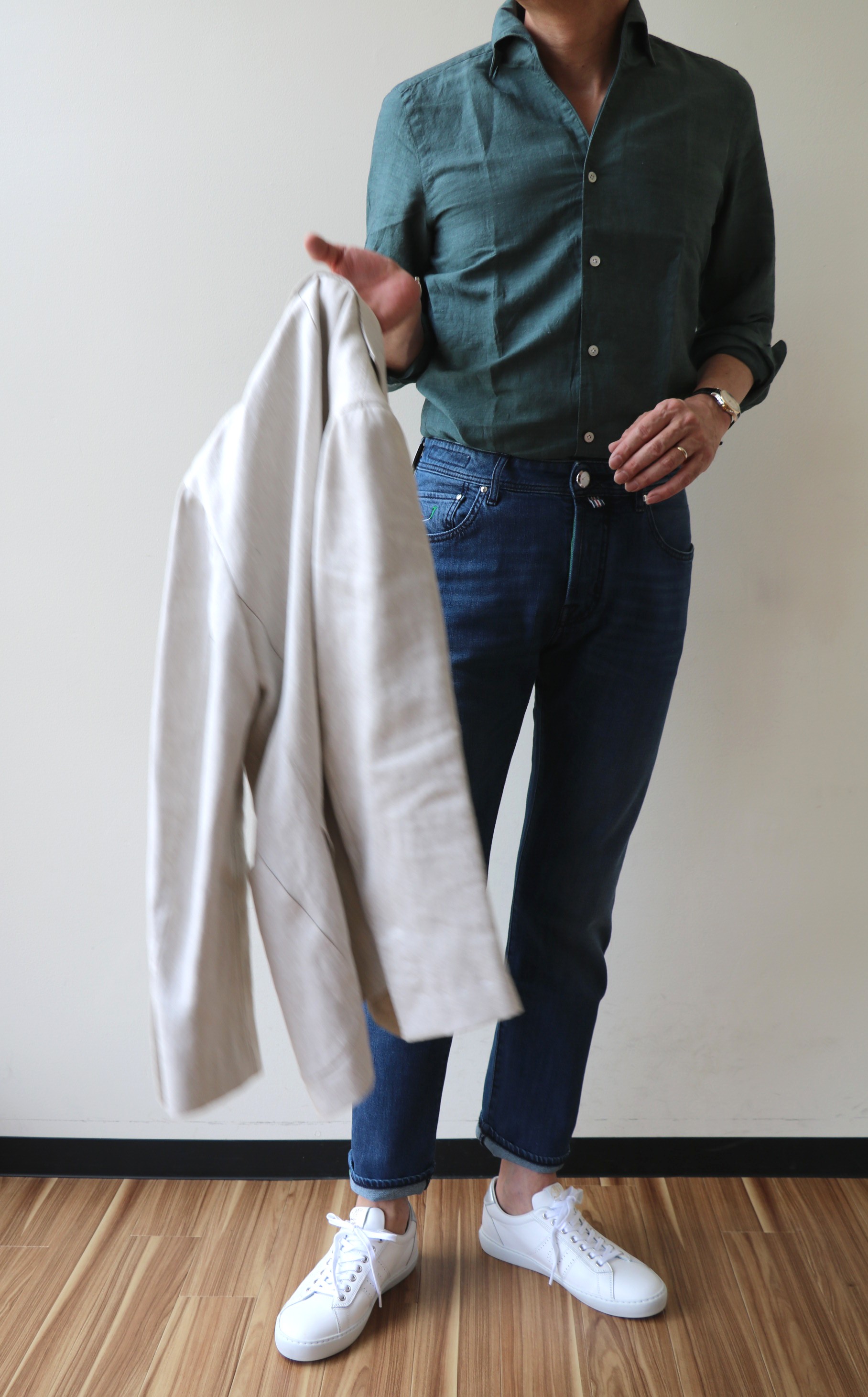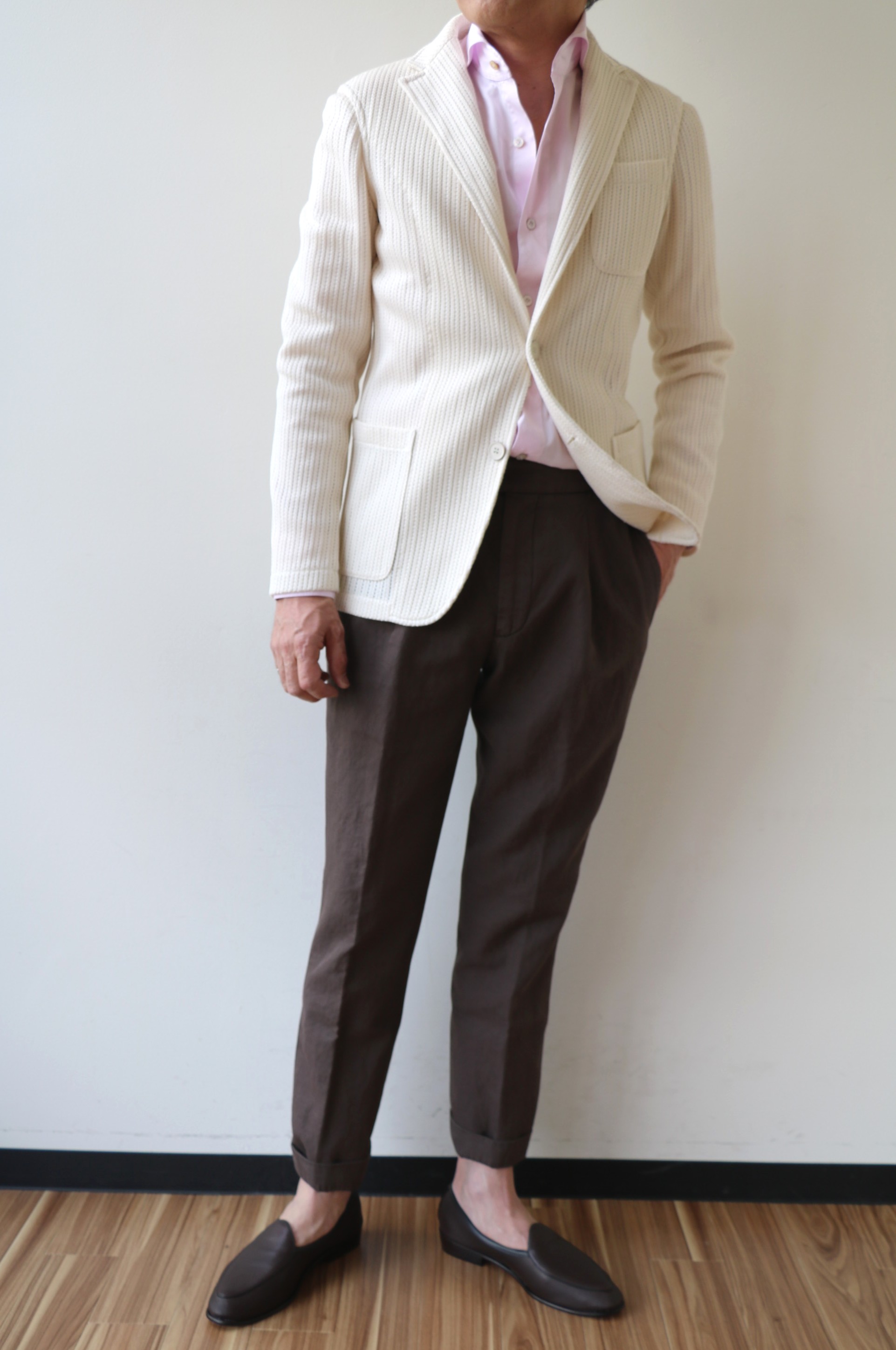 本日、私が穿いているPT01(ピーティーゼロウーノ)のパンツに合わてみました。同系色の濃淡でみせるコーディネートにホワイトのニット(ALFREDO)を羽織り、爽やかさの演出です。足元はブラウンスェードのタッセルスリッポン(BAUDOIN&LANGE)で全体を引き締めます。選んだボディモデルは「TRIESTE」。着丈はレギュラーで、袖丈のみ2.0cmカットしております。