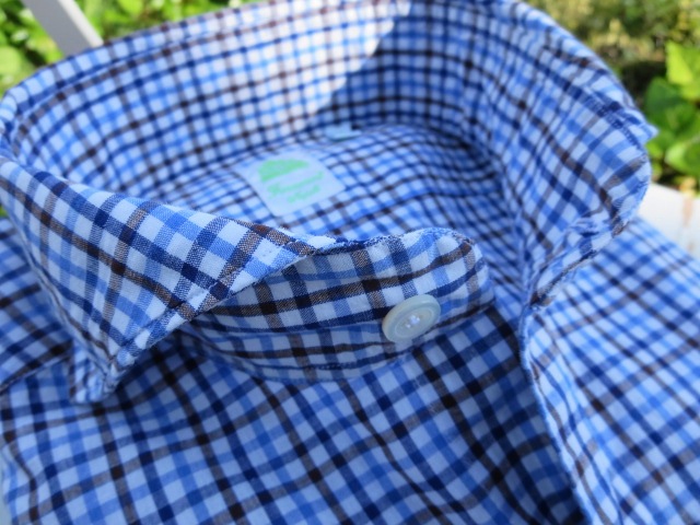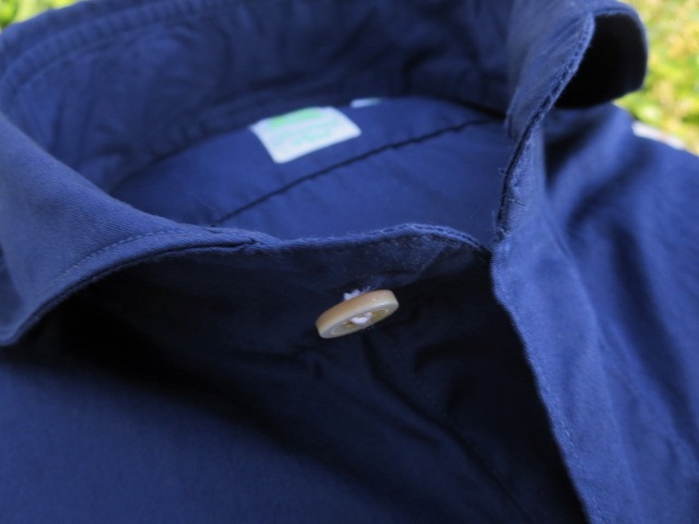 襟元は、スッキリです。この衿型、手間のかかる仕様でして、同じ生地でも若干価格が上がります。ただ、他のシャツブランドにはない注目度(モテ度)の高さと上品な色気+αを併せ持った衿型ですので、意識して揃えておかれると良いでしょう。既に店頭ではファンの多いシャツとなっています。