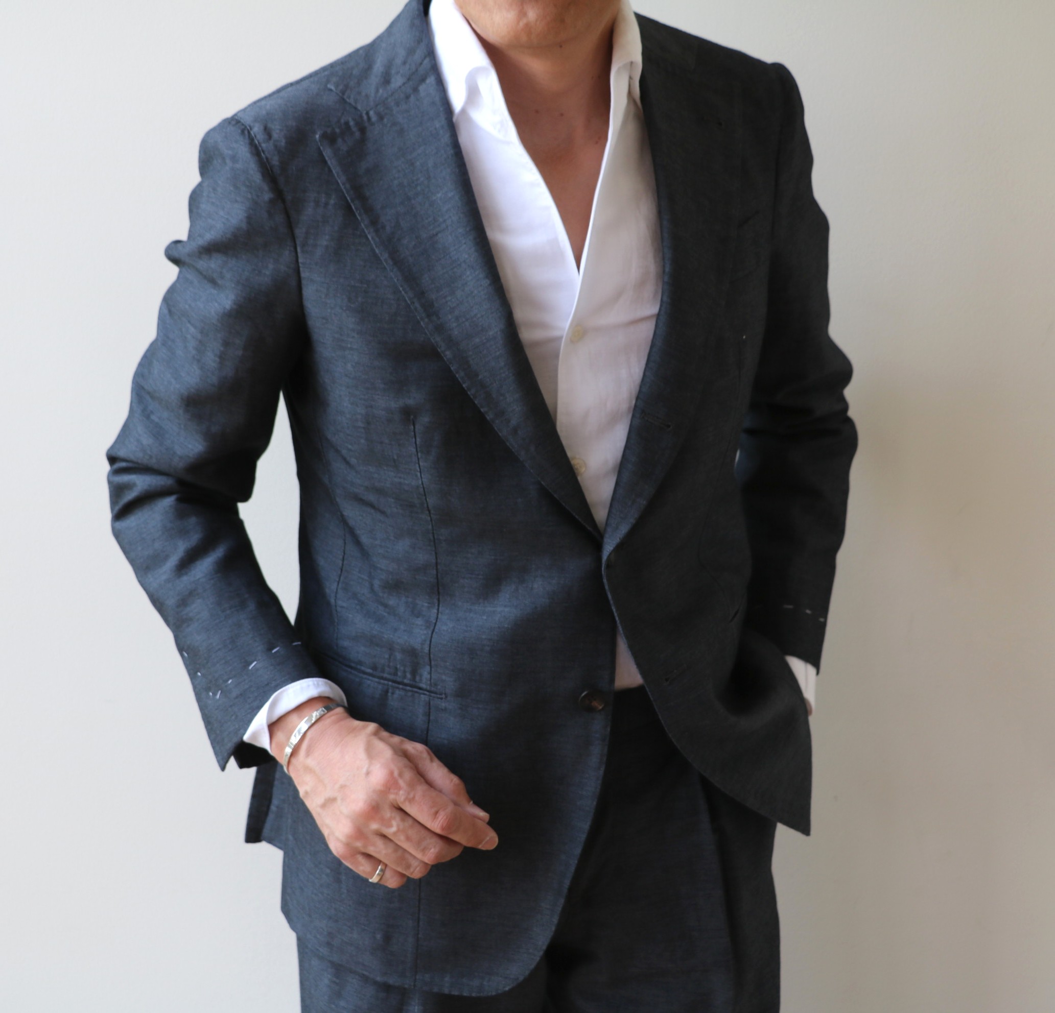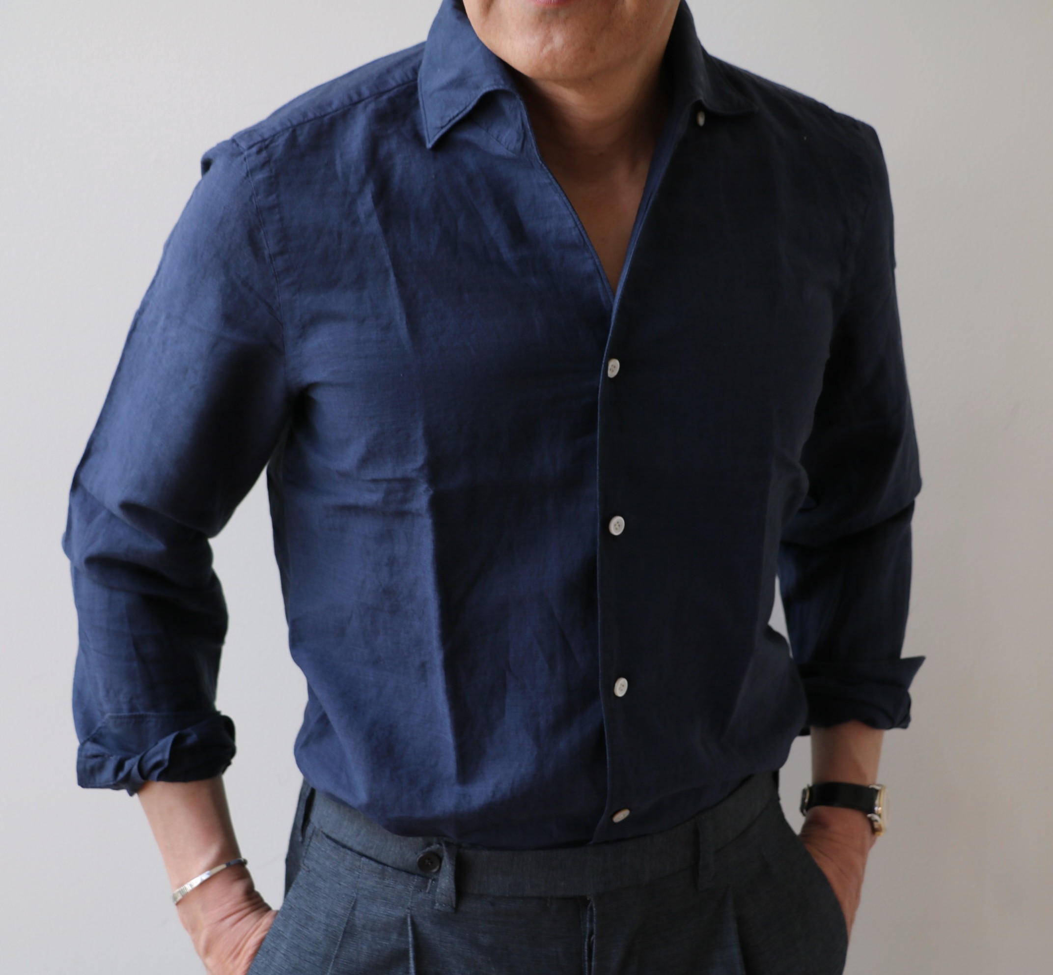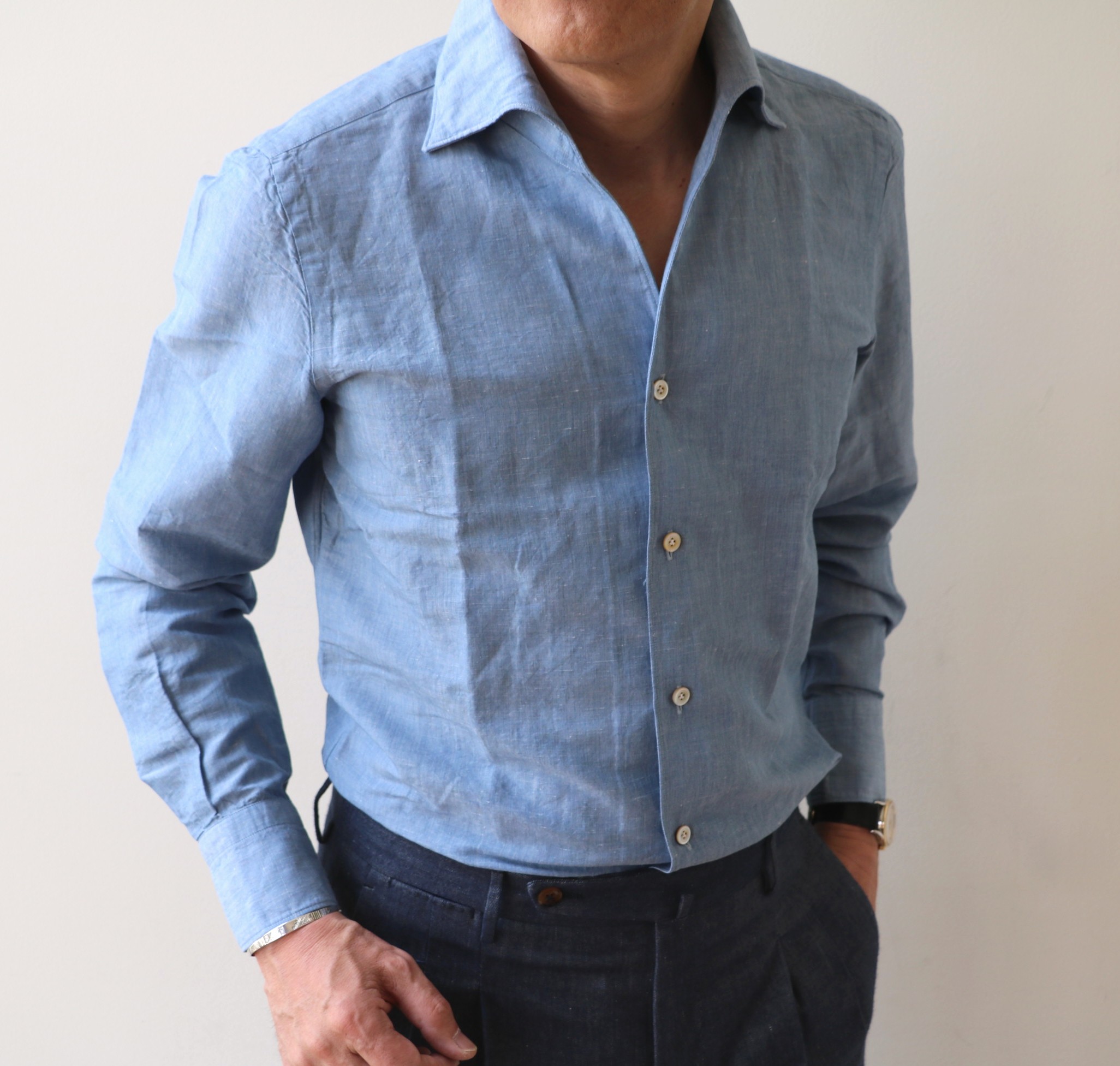 まず揃えて欲しいのは、コットン・リネンのシャンブレーブルー。サラッとした光沢のある生地は、太陽の下でさらに美しく輝きます。コットンシャンブレーのシャツは持っている...いやいや、素材や衿型が変わると、ずいぶん雰囲気は変わります。合わせやすいシャツだけに、ぜひ手に入れてください。