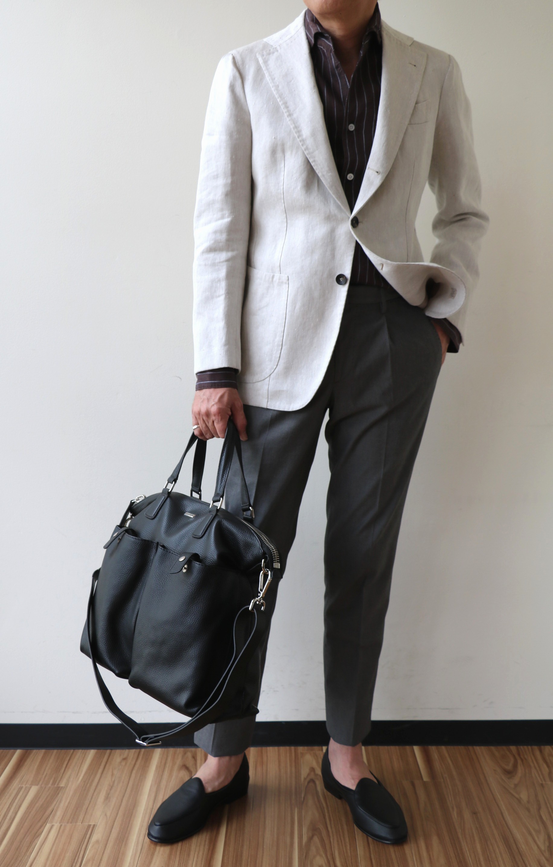こんなコーディネートで旅に出たら...どうなるのでしょうね。オイスターホワイトのジャケット(参考商品)にグレイのパンツ(インコテックス)、靴(BAUDAIN&LANGE)と鞄(ZANELLATTO)をブラックにして全体を引き締めています。ホワイトデニムに青系のジャケット、そんな組み合わせも素敵です。