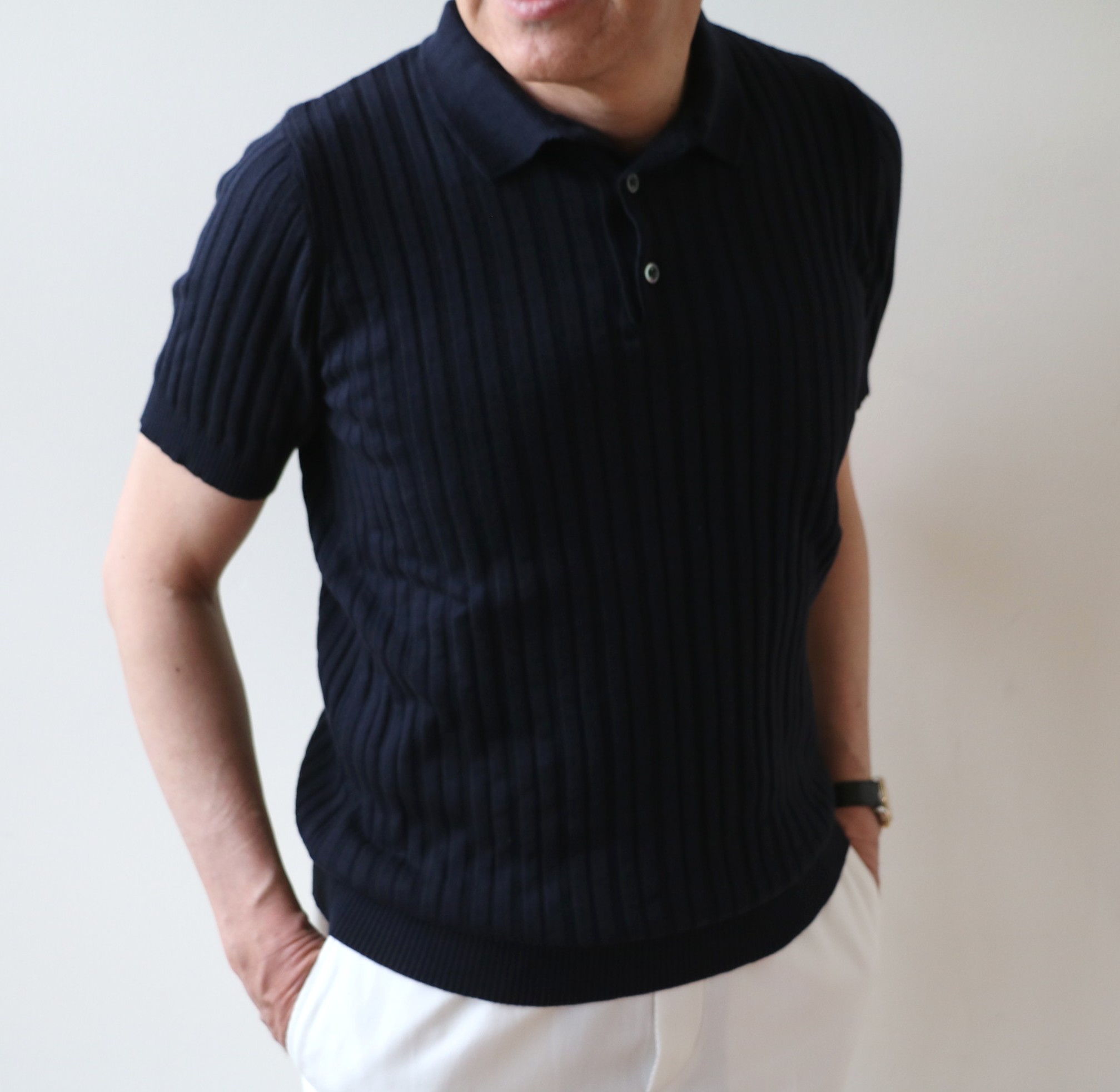 深みのあるネイビーの色も、奥行きのある編地も、伸縮性に優れた着心地も...とシンプルな半袖のニットポロに、ここまで新しい香りを感じることはありませんでした。若々しく、知的で、熟成した色気もあり...の感動の逸品です。