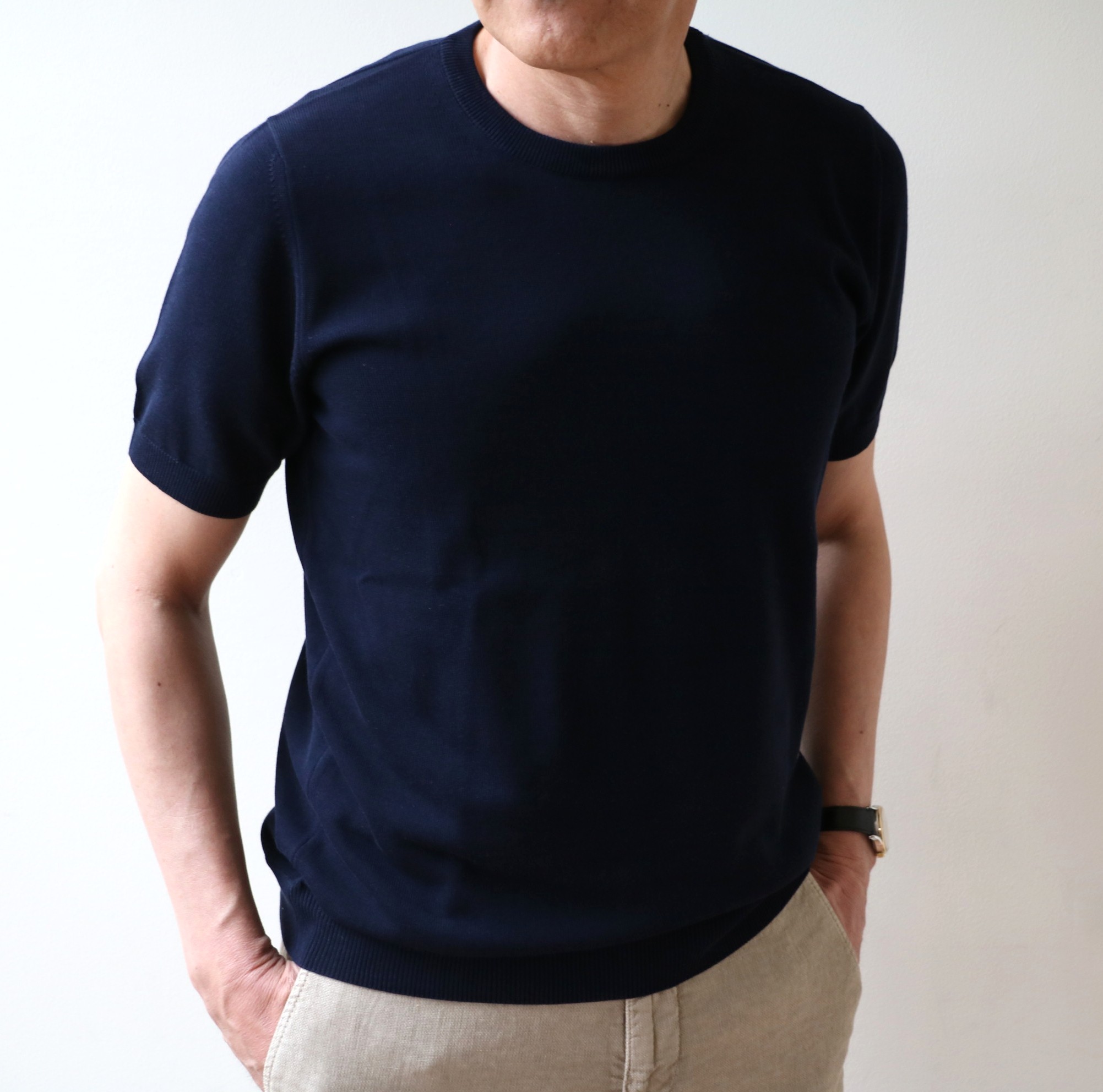 併せて、ご覧いただきたいのが、「袖、裾口切り替え半袖クルーネックニット」。従来のレギュラーフィットに対して、紳士に合わせた、ゆとりのあるフィッティングのジェントルマンフィット。少し前(ここ2.3年)までサイズ46を着ていた私。実は、その前はサイズ48を着ておりました。取引を始めた頃の担当者、今ではジャパン社のCOOに出世されたS氏に「ザノーネはタイトだから、スグルさんは48で」と言われ、7.8年はサイズ48を。ただ、その後のタイトフィットの流れで46を選んでおりましたが、最近、ちょっと無理してるかな、なんて思うように。最近は48に戻しましたが、今回より提案されている「ジェントルマンフィット」は、46で程よいゆとりが出て、ちょうど良い感じです。サイズ表を見比べて、流行に左右されることのない自分好みのサイズをお選びください。