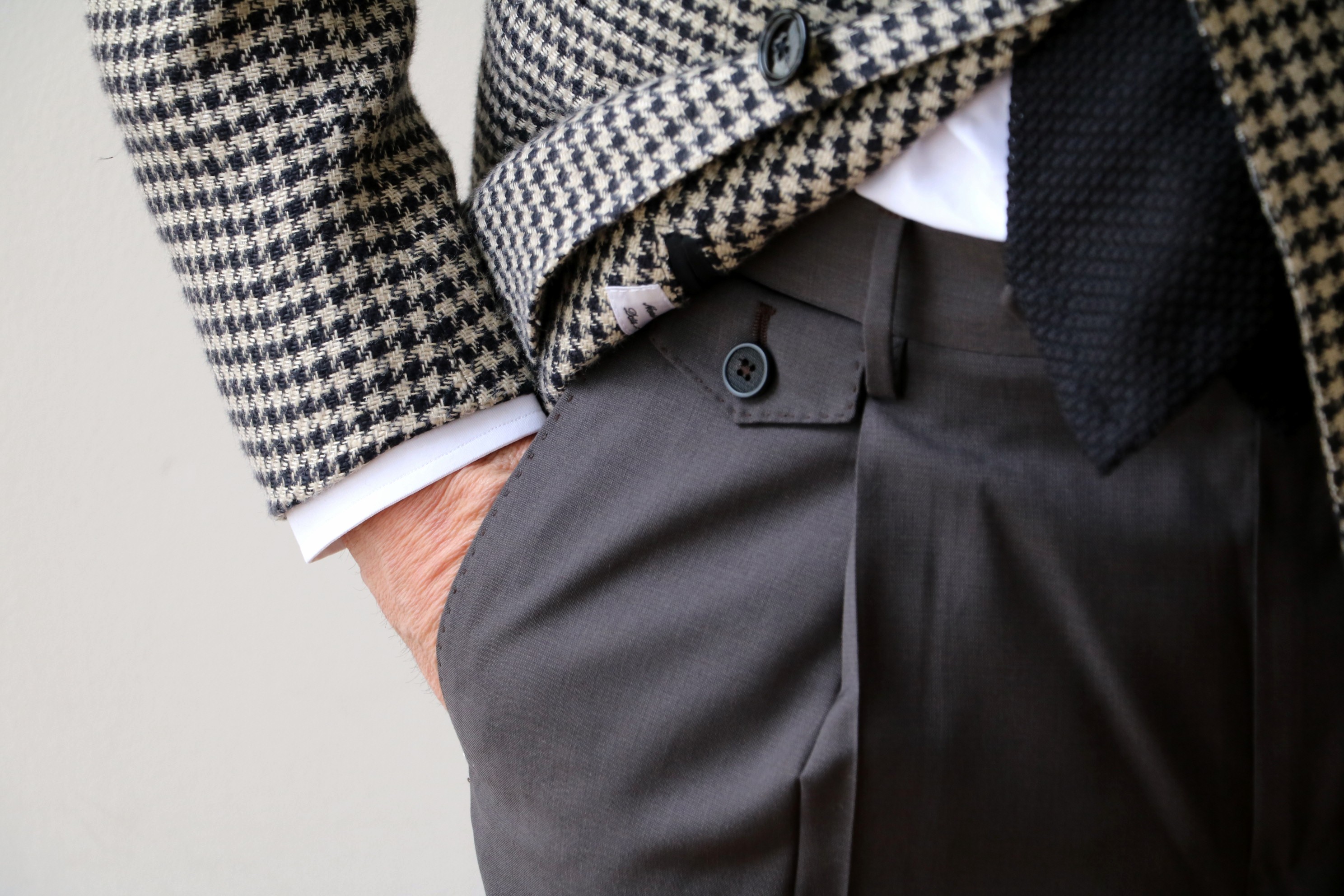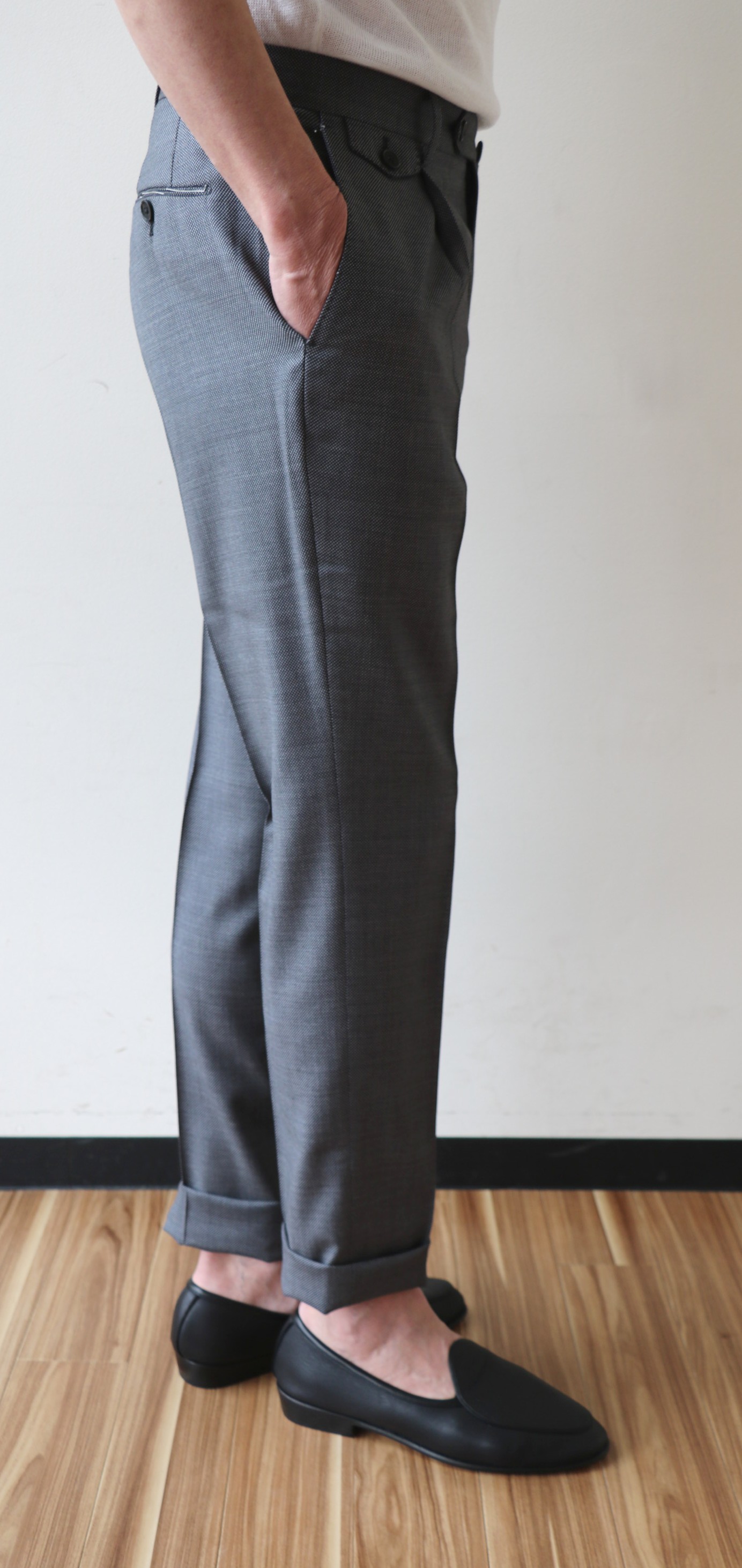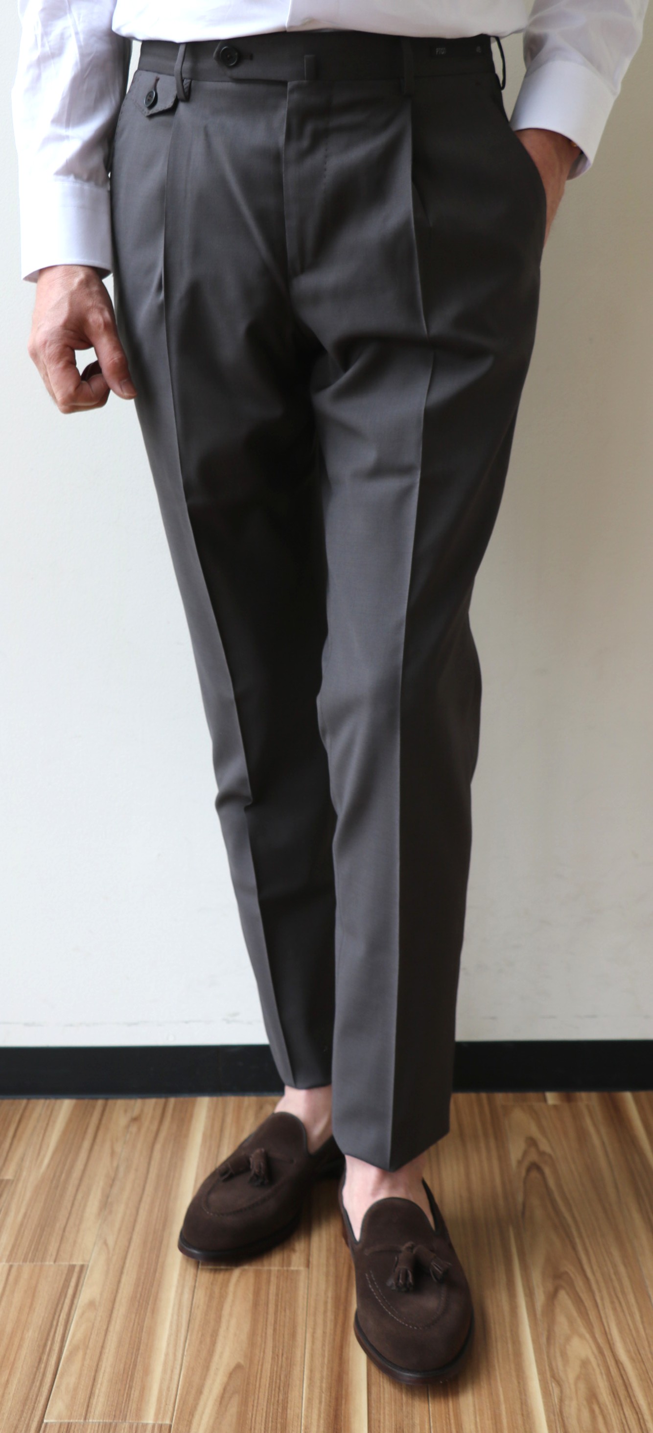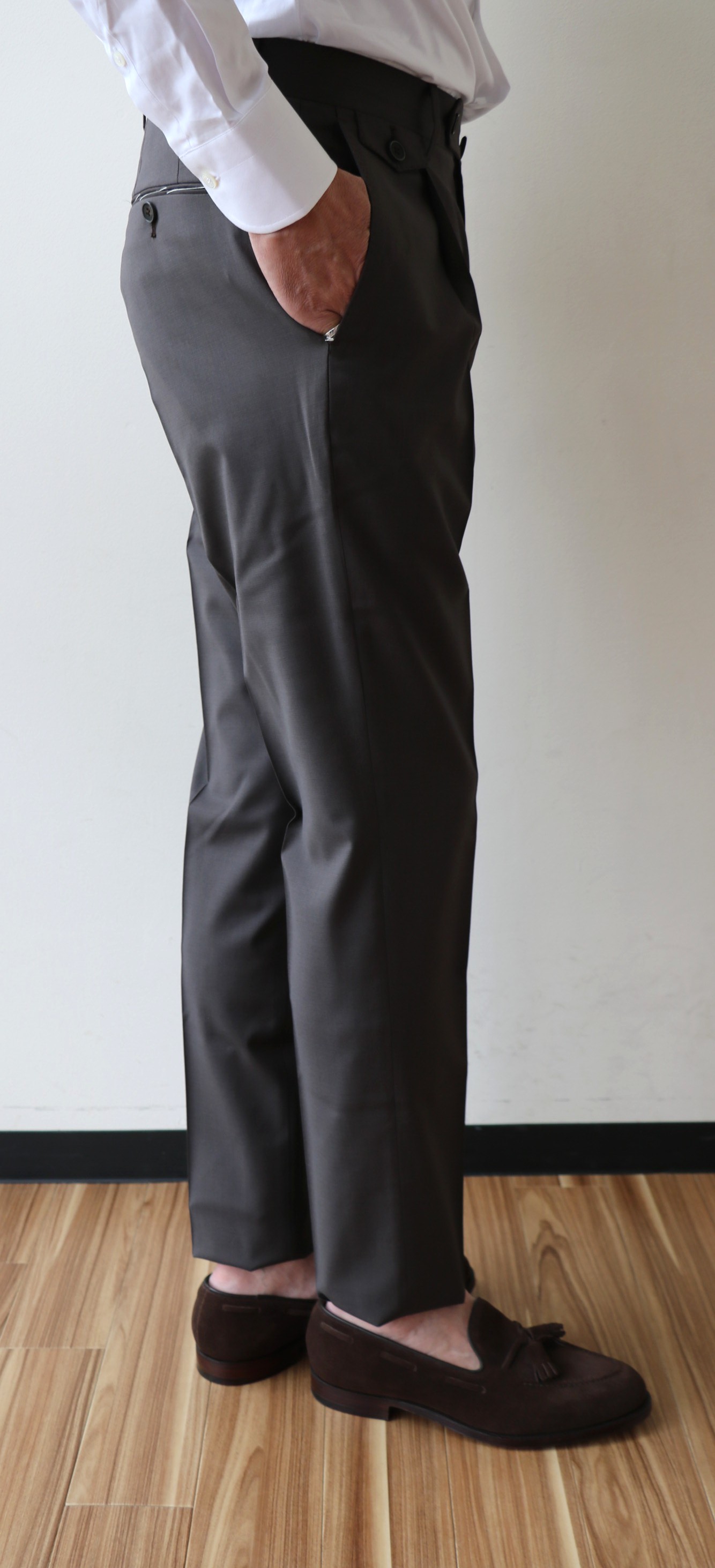 パンツは、上着とのバランスで自ずからラインが決まってきます。フロントは、アウトのワンプリーツ。程よいゆとりのあるテーパードフォルムです。