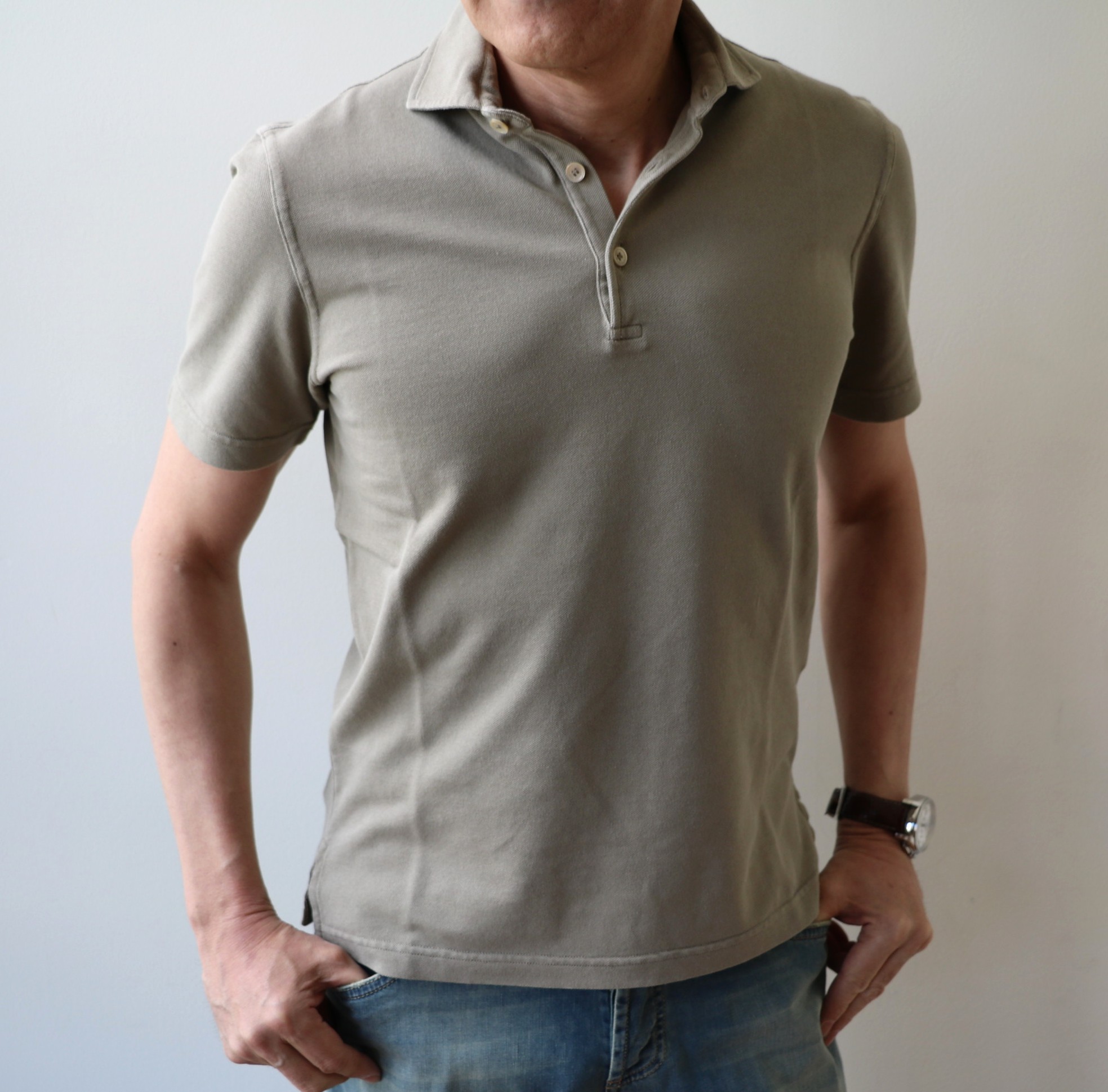 こちらも「GIZA45」から変更しましたが、同じエジプト綿の鹿の子織ポロ。色の抜け具合といい、人生経験を積んだ大人のオトコのような面構えです。このオリーブの他にブラウン、ホワイト、ブルー、ネイビーの5色をセレクトしてきました。