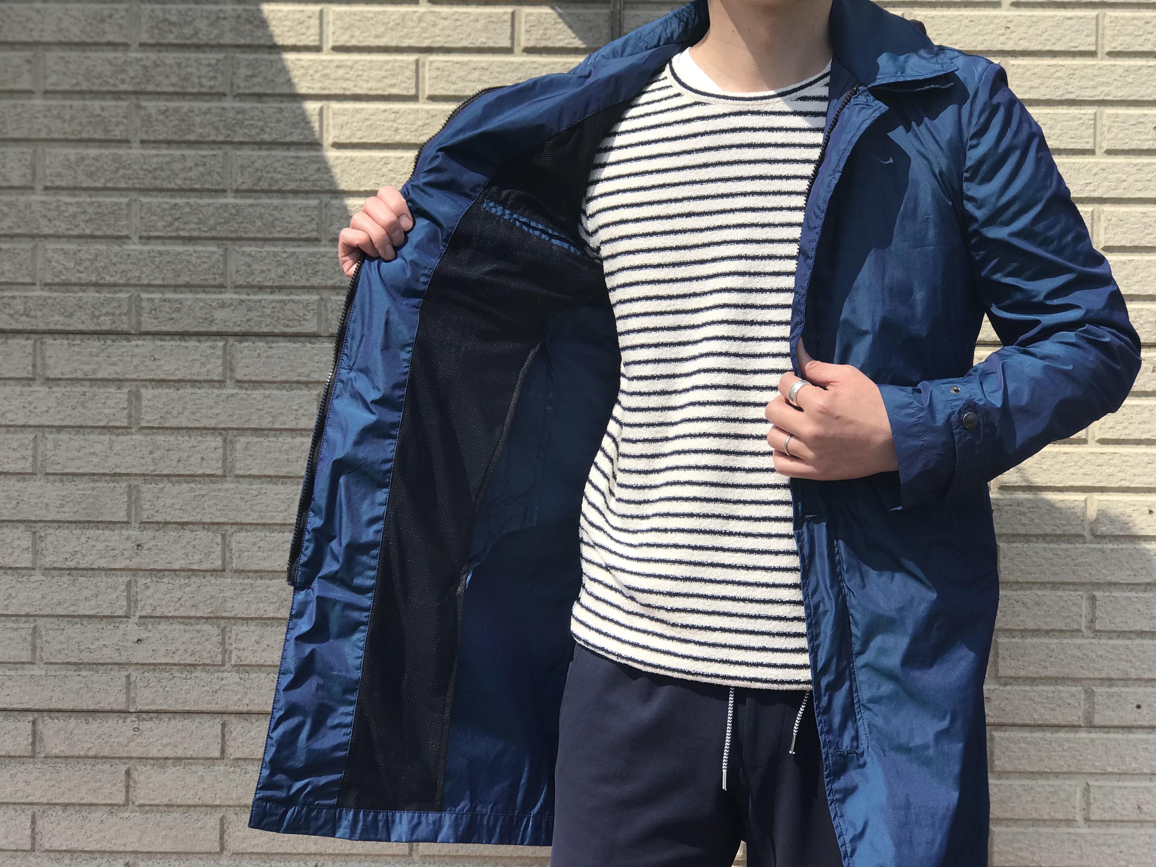 ただ、コートと聞くと身構えてしまいそうですが、これに関してはそんな心配はなく、すっきりとした肩幅や腕周りは、 Tシャツの上から羽織るブルゾンのように日常着的な感覚です。所々にウォッシュをかけたようなシワ加工が施され、最初から使い込んだ風合いのある気楽さもあり、ちょっとしたお出掛けや近所への買い物にも丁度良いアイテムです。