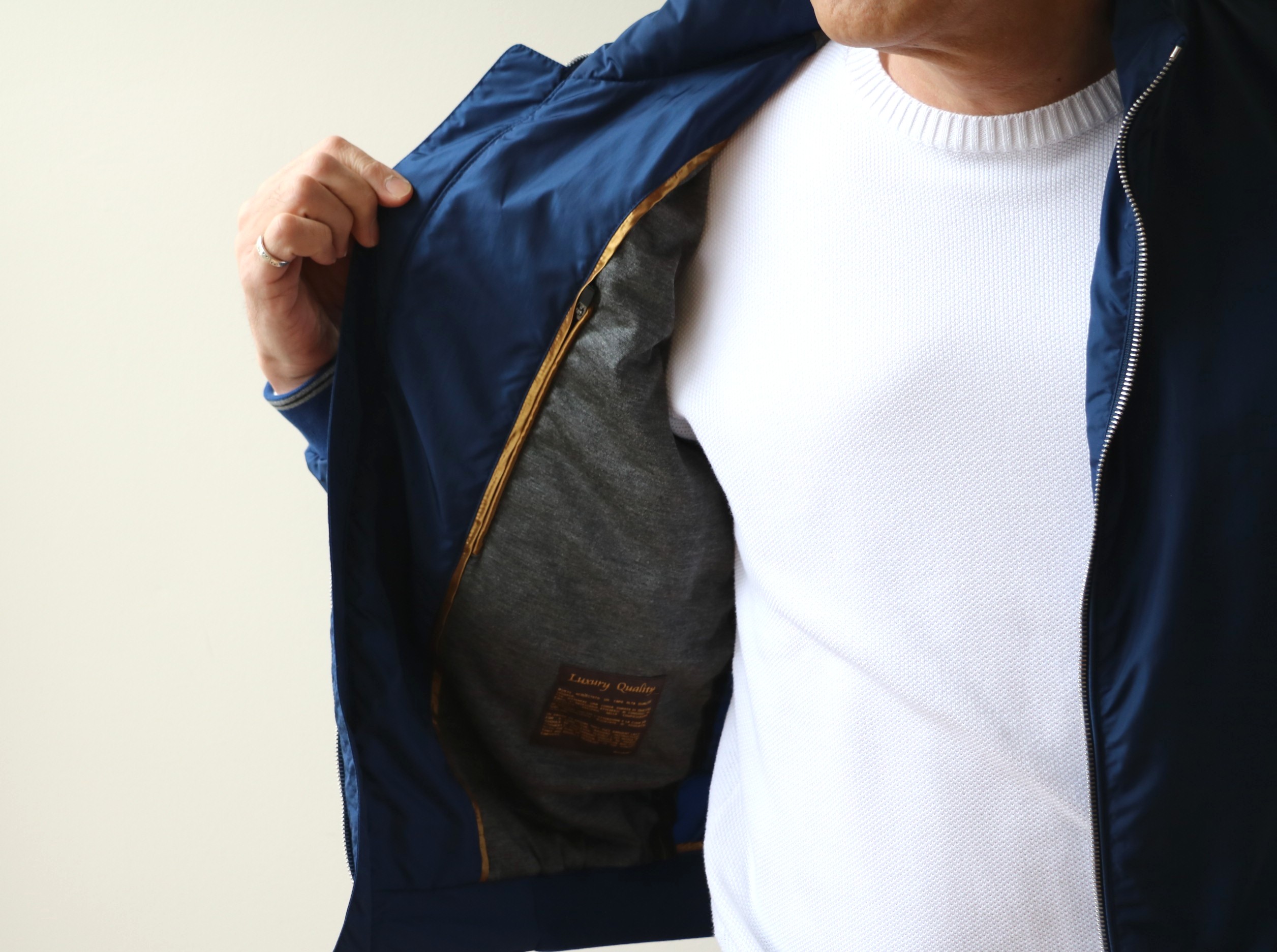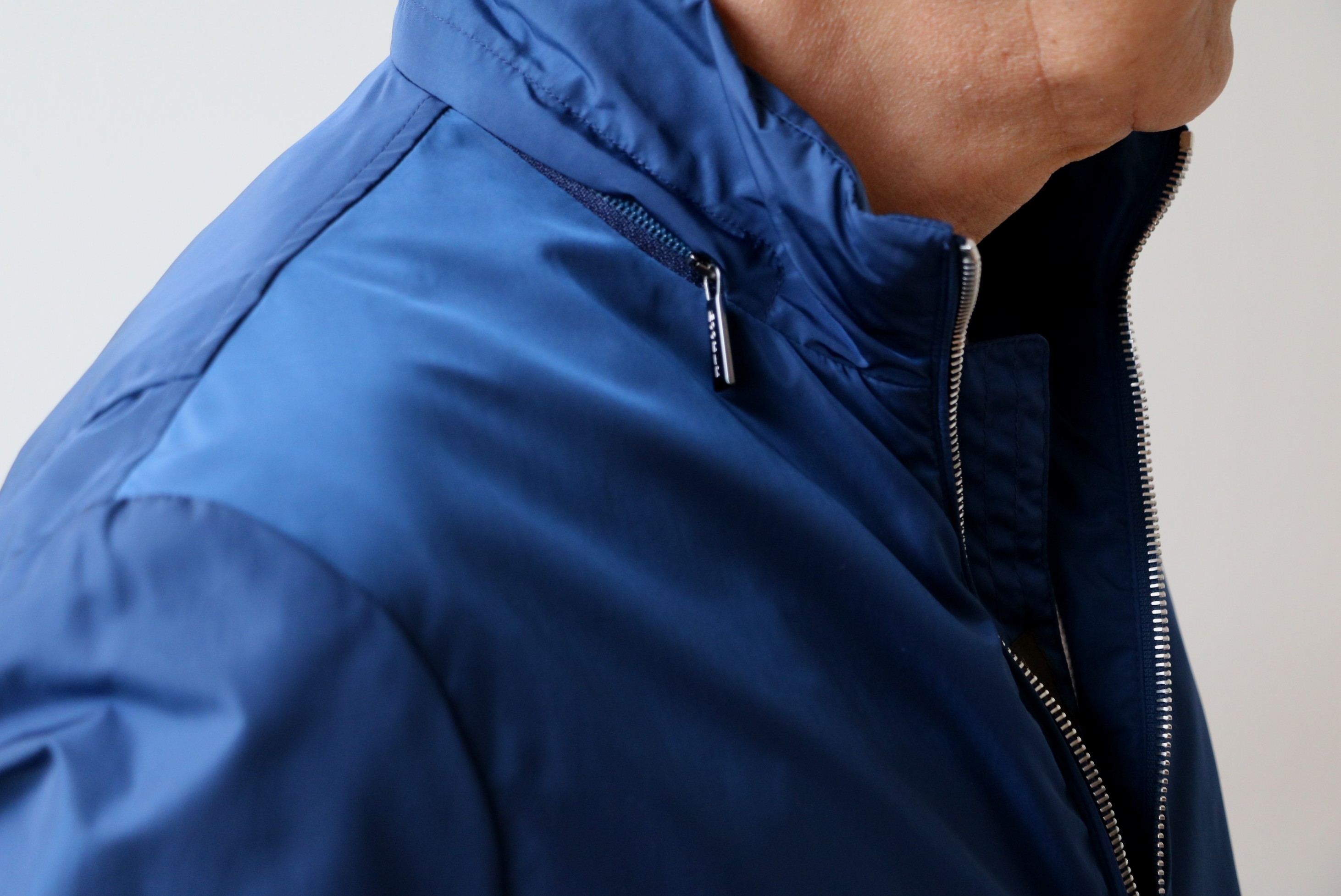 艶やかなオーシャンブルーのブルゾン。モデル名は「NUNZIO/ヌンツィオ」。イタリアの男性名の一つとして実在する名で、"使節"の語源になっているようです。
