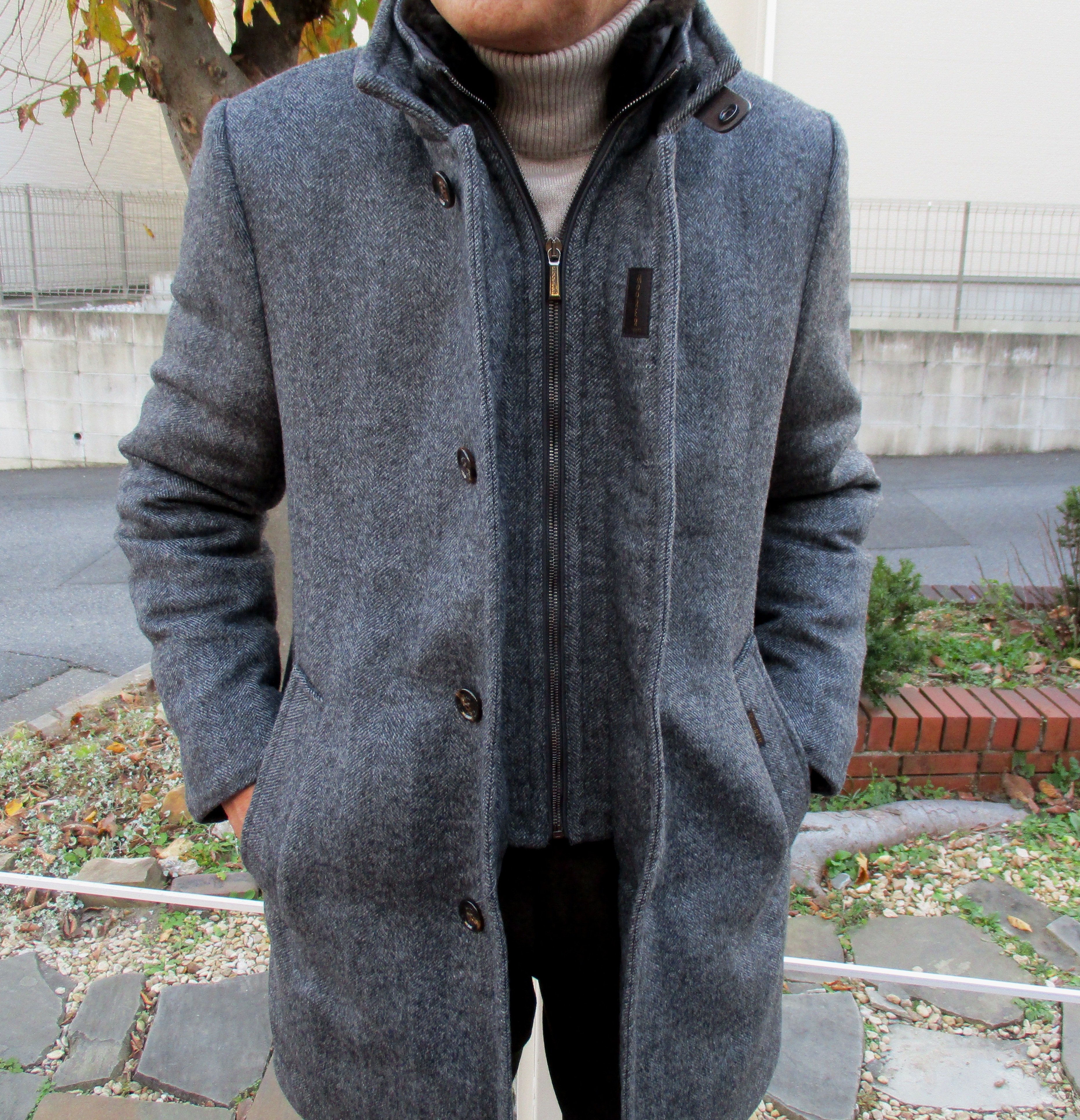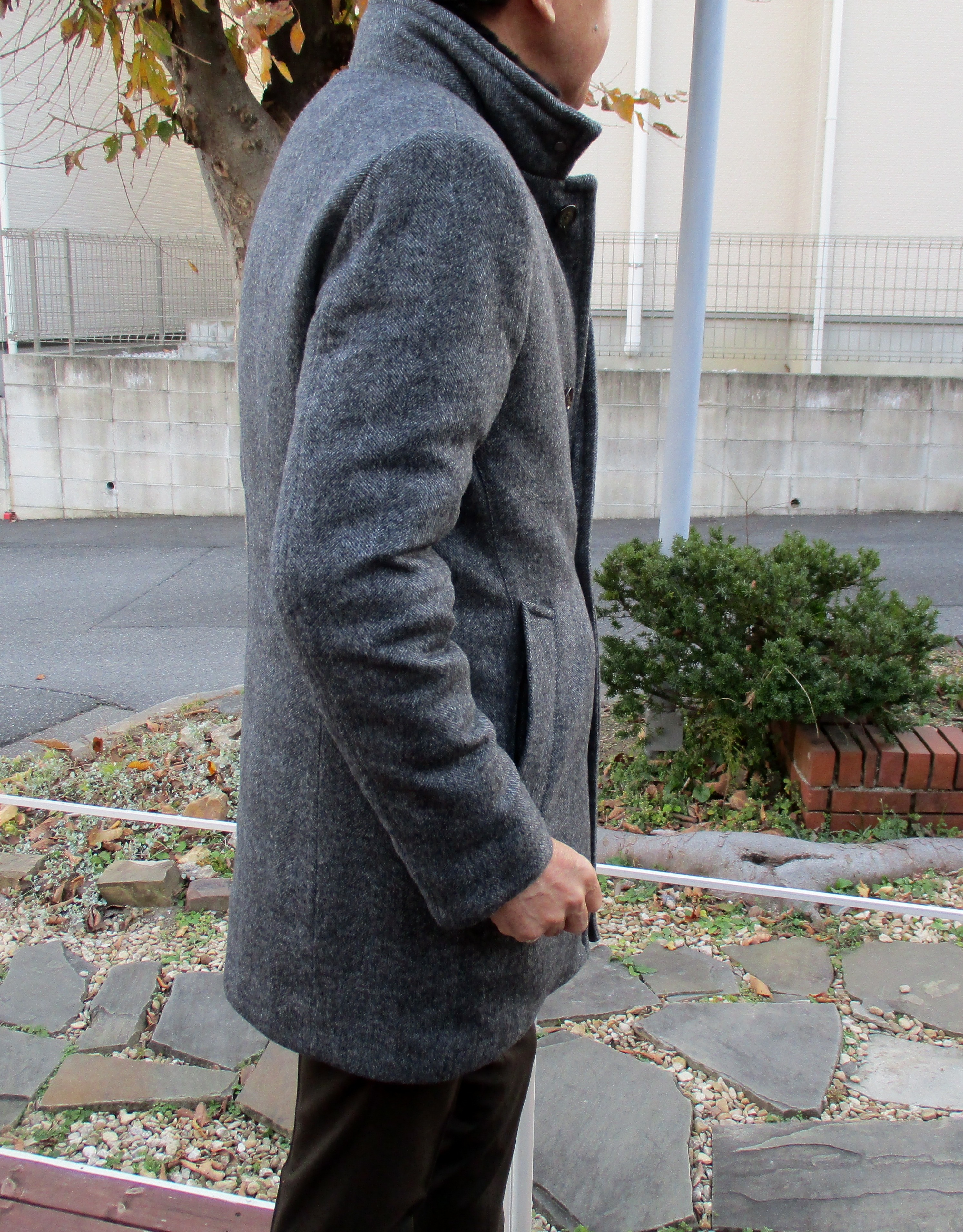 ウール100%のグレイヘリンボーン。飽きの来ないトラディショナルな素材と色柄です。フロントのレイヤード(取り外し不可)を閉じるだけで防寒性は高まります。