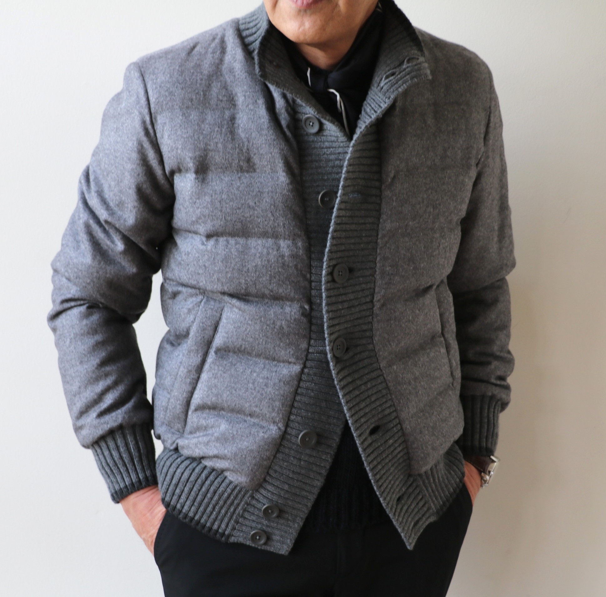 お勧めのSettefilli Cashmere(セッテフィーリ カシミア)のニットに羽織ったのは、季節到来のウールフェイス中綿(ダウン&フェザー)入りライン入りパーカーブルゾン。改めて着ると、実に魅力的。そのまま着て帰りたいぐらいです。