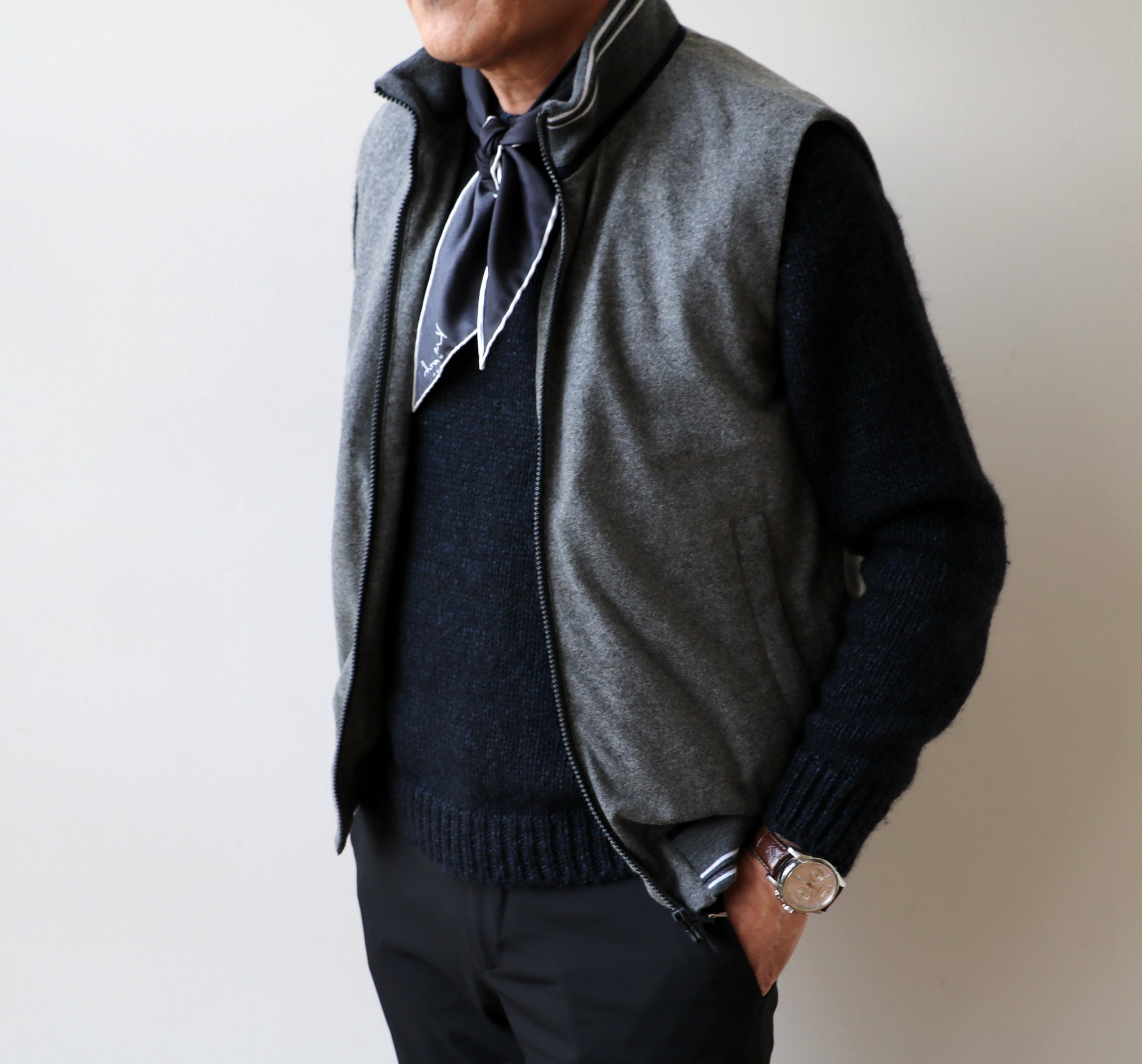 レザーのインに使えるということは、当然、ジャケットにも。TAGLIATORE(タリアトーレ)のジャケットに合わせていますが、どうでしょう。大人のオトコの服には欠かせな上品でスポーティー、そしてチャーミングさ。その塩加減によって、滲み出る色気。シンプルで質のよいものであれば、年齢と共に味わい深くなっていく、そんな思いが、このニットジレを作りだしました...なんて、ちょっと大袈裟でした。