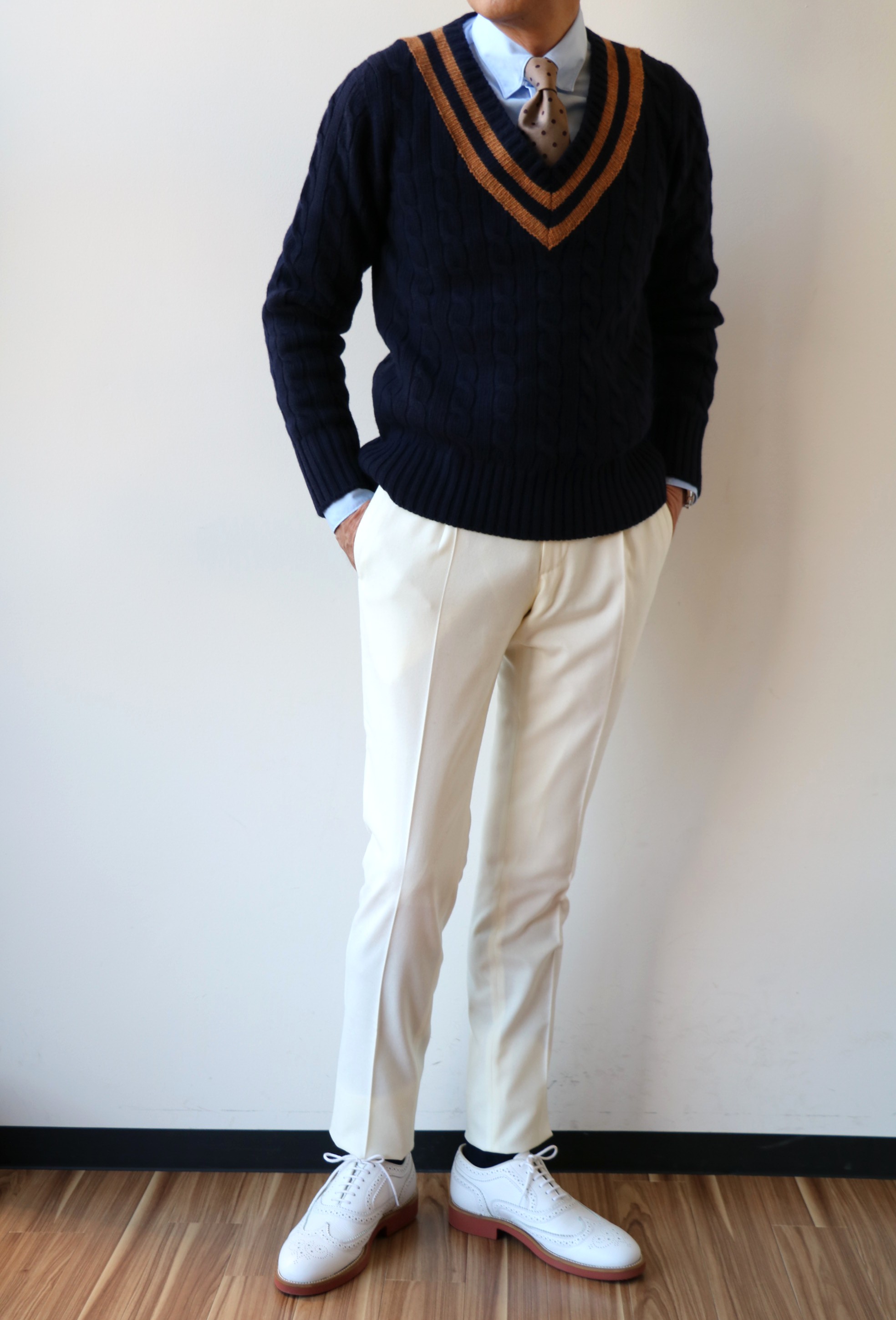 2日前に、タカイより紹介させていただいたTHE GIGI(ザ ジジ)。その中で、Vネックのケーブル編みセーターの名称に言及した際、チルデンにするかクリケットにするか、かなり迷ったはずです。着丈の長さから、クリケットセーターと名付けましたが、もう少し詳しく言えば、ベースはオフホワイト、ネックの他に、袖と裾にラインが入るものを言います。ご紹介のニットは、ライン入りVネックセーターでしょうが、それでは雰囲気が出ません。というわけで、クリケットセーターとしてコーディネートしてみました。あくまでも、"風"です。