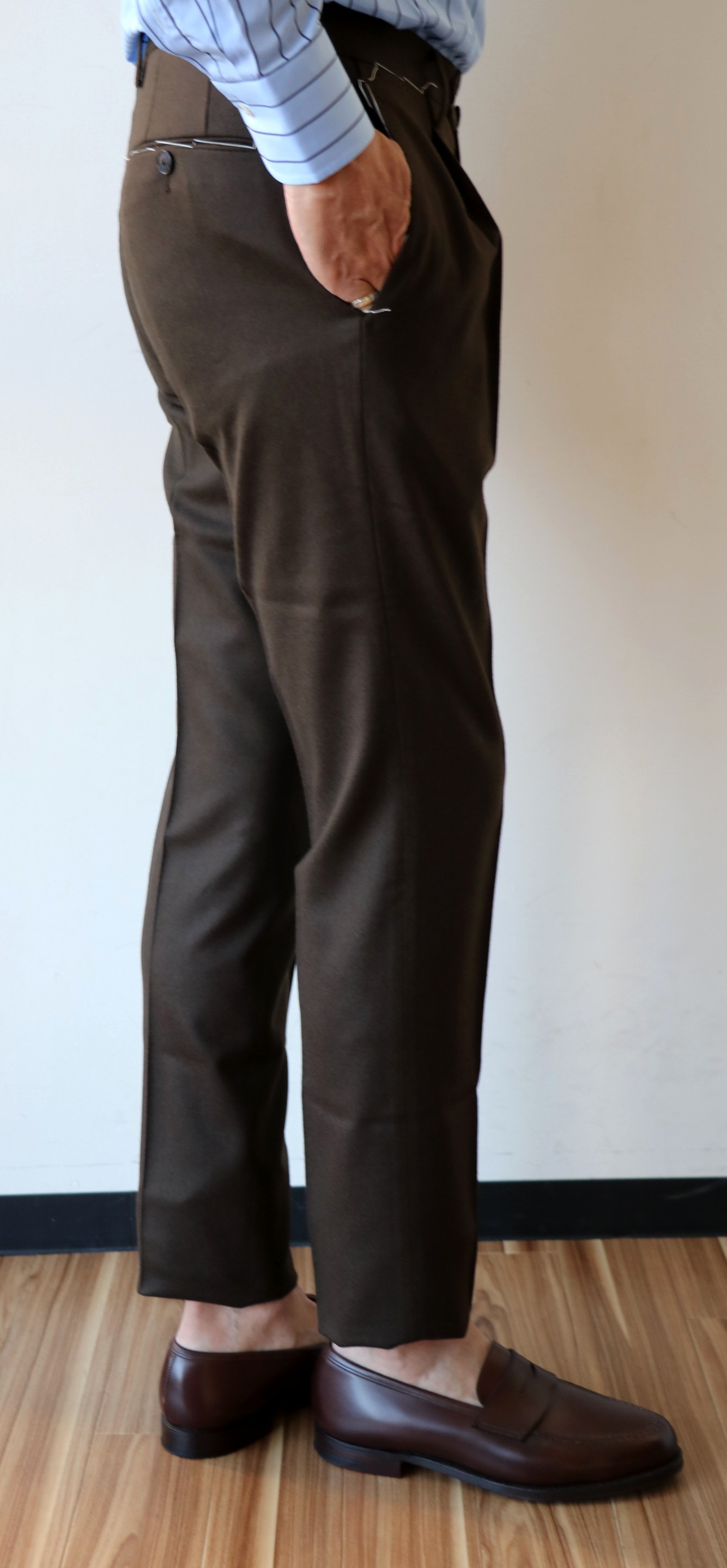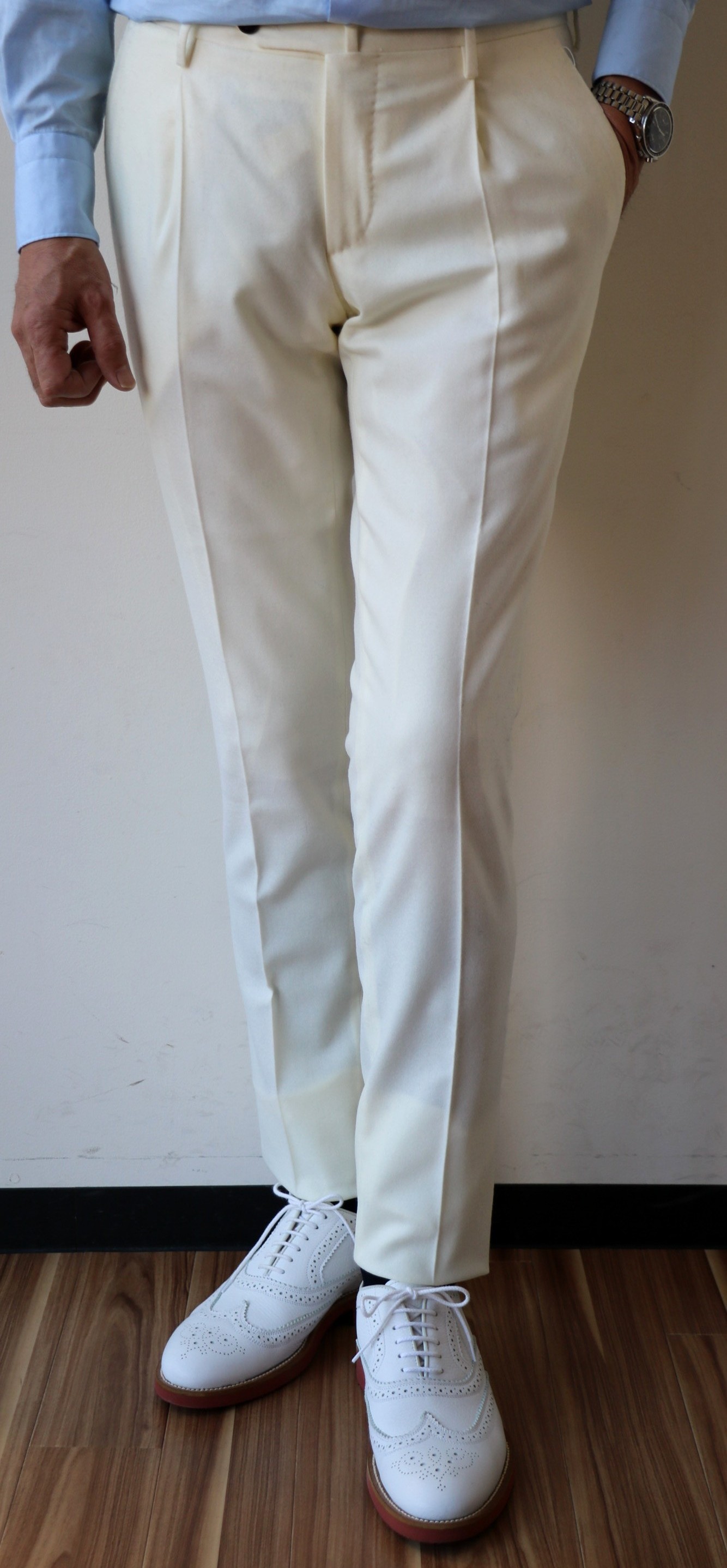 合わせたニットはZANONE(ザノーネ)、パンツはZanella(ザネッラ)、靴は私物のPantofola d'Oro(パントフォラ・ドーロ)です。