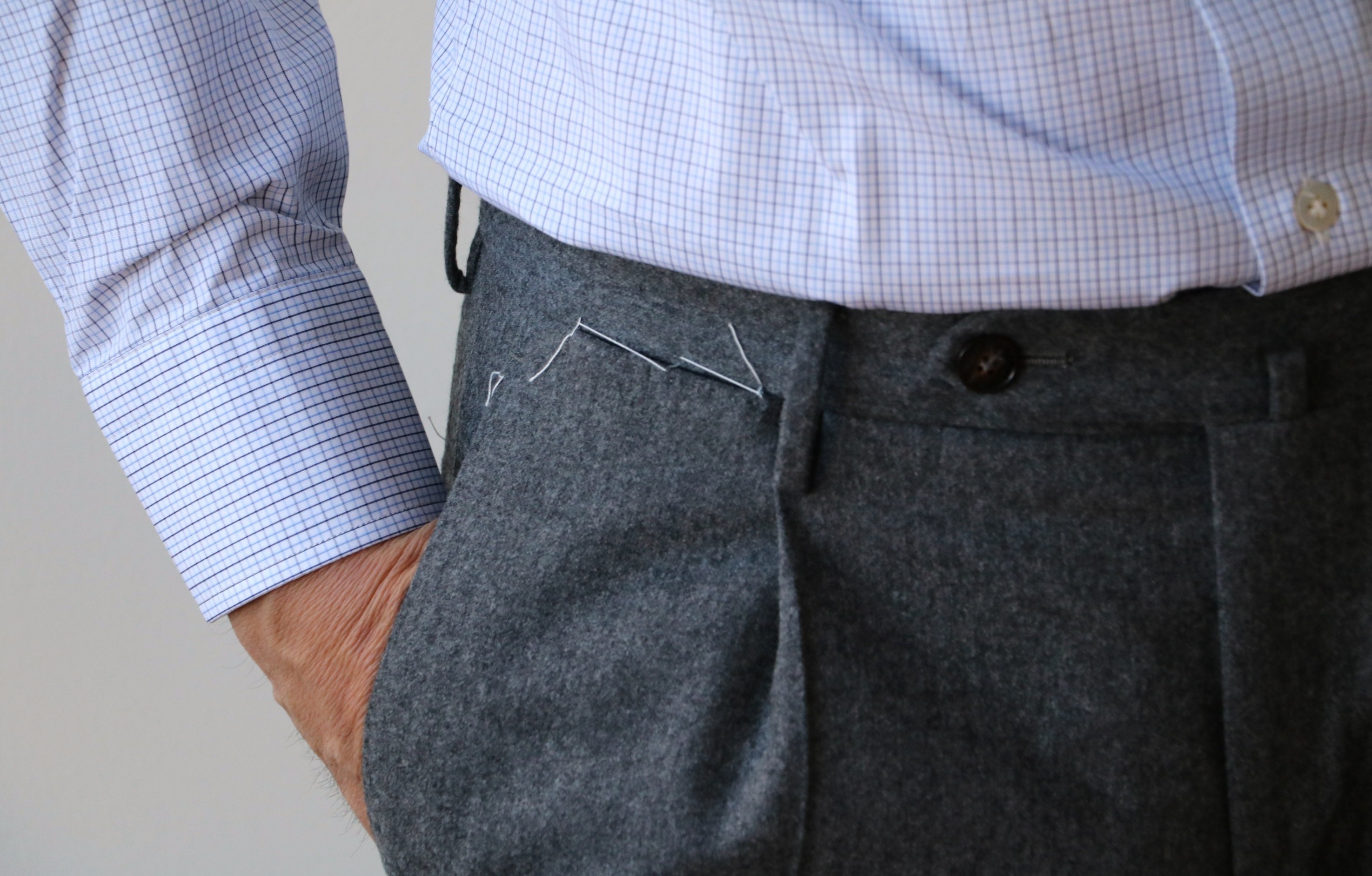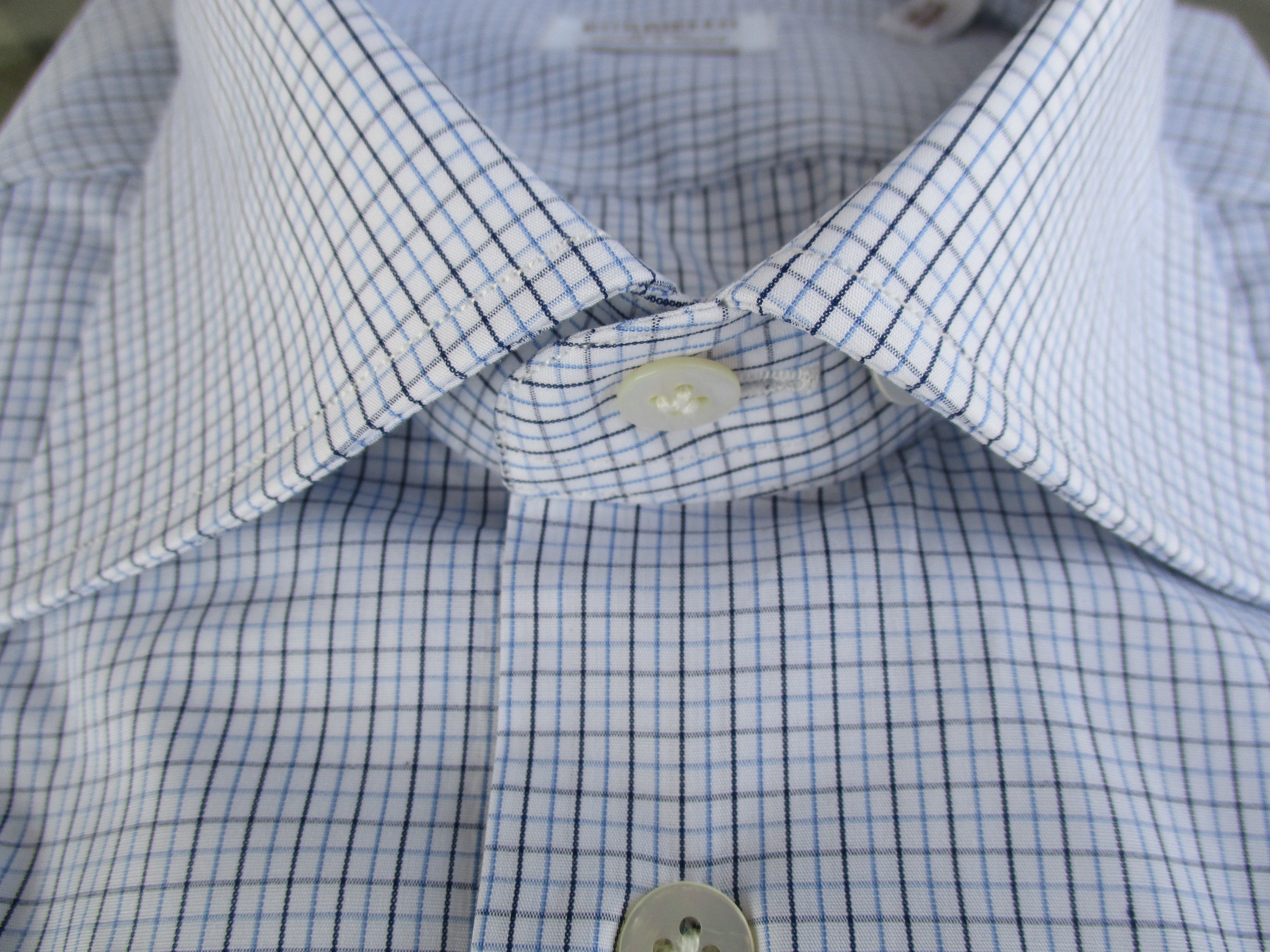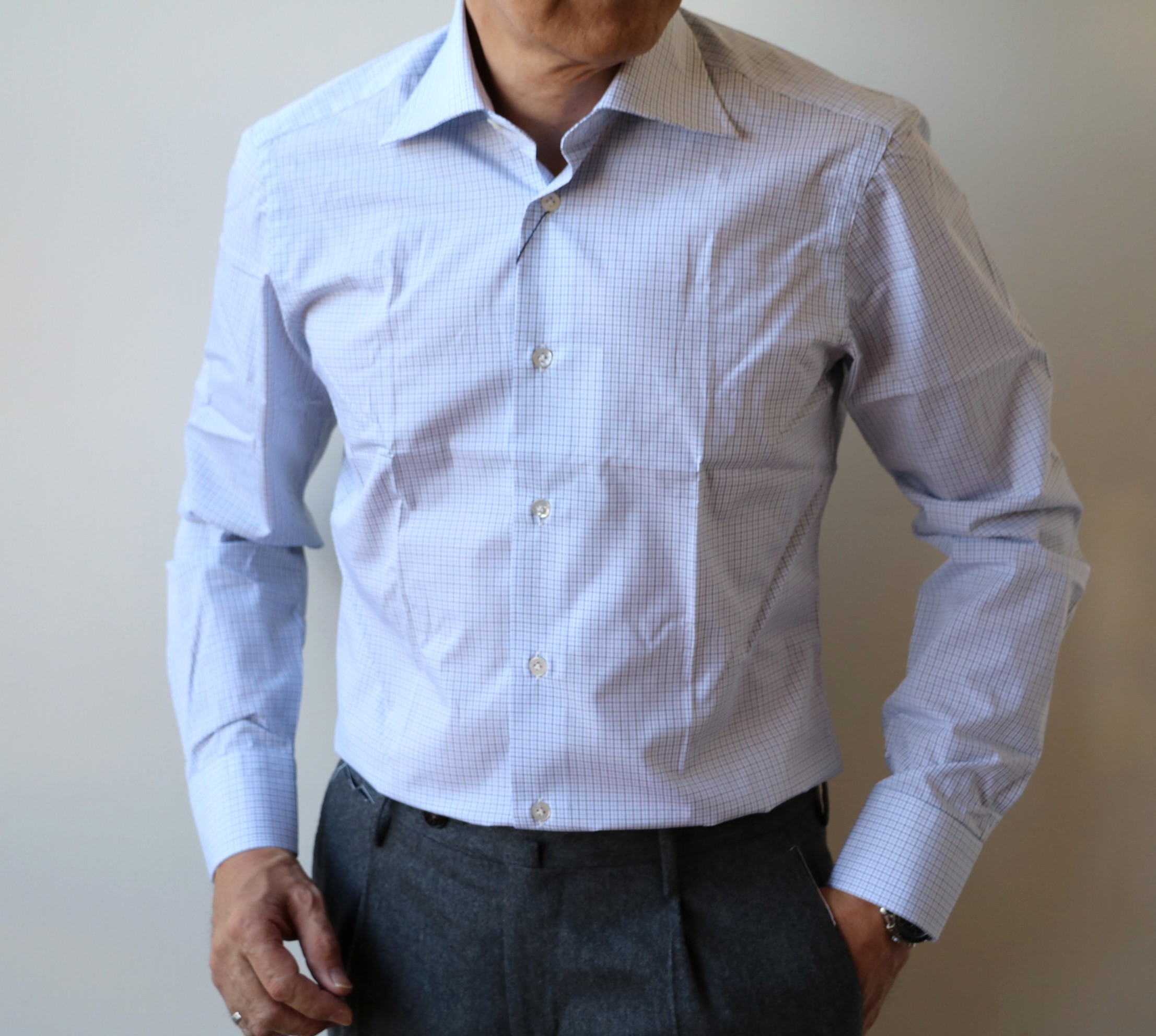 ようやく見つけたサックスブルーとネイビーのタッタソール。定番柄かと思いきや、意外と見つからないチェック柄です。英国調の流れの中、今回は、すんなりと見つかりました。衿型も、今までのようなカッタウェイではなく、角度のあるワイドスプレットでセレクト。ネクタイの収まりは、きれいです。衿とカフスは、カッチリとした接着芯にしてあります。