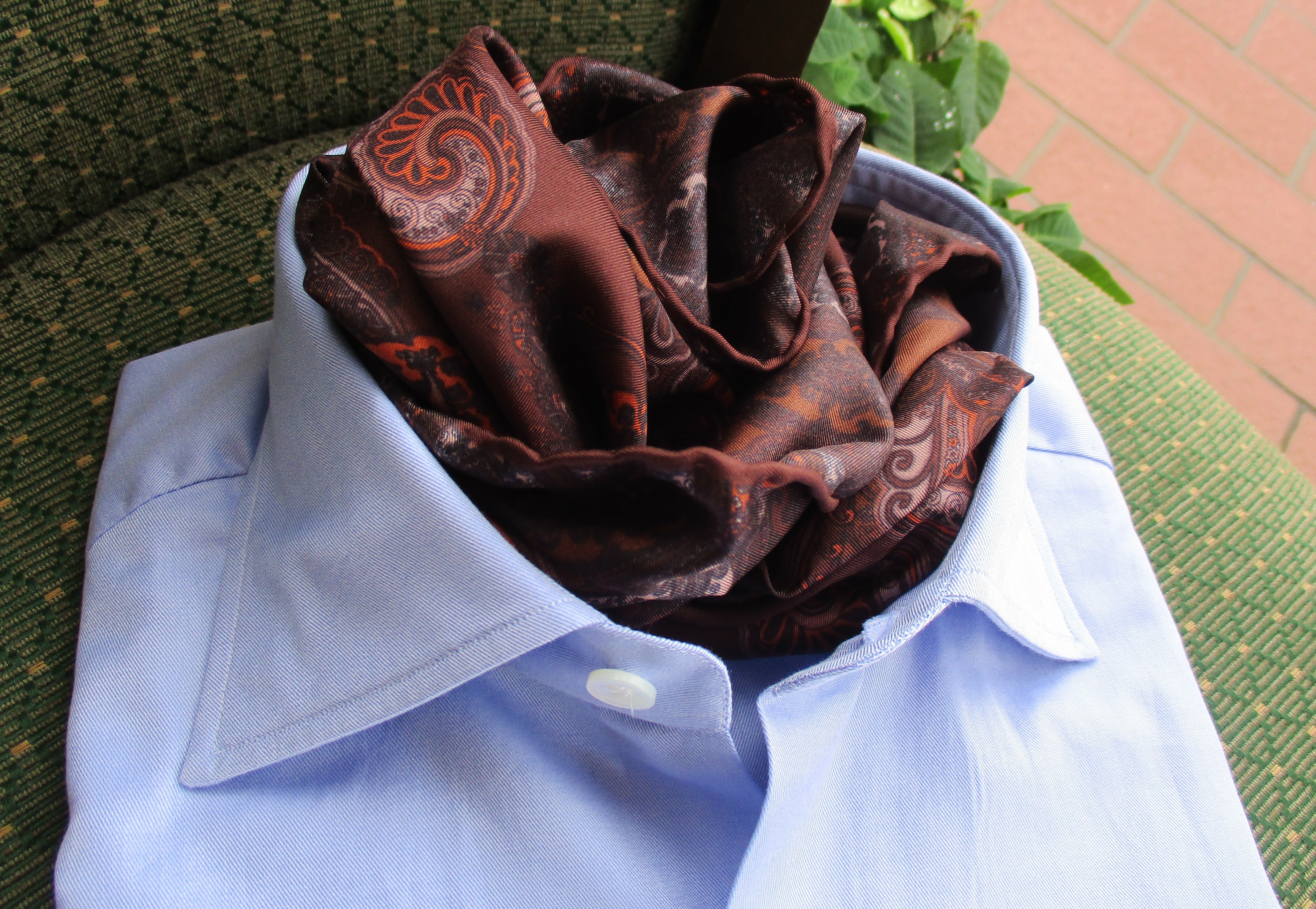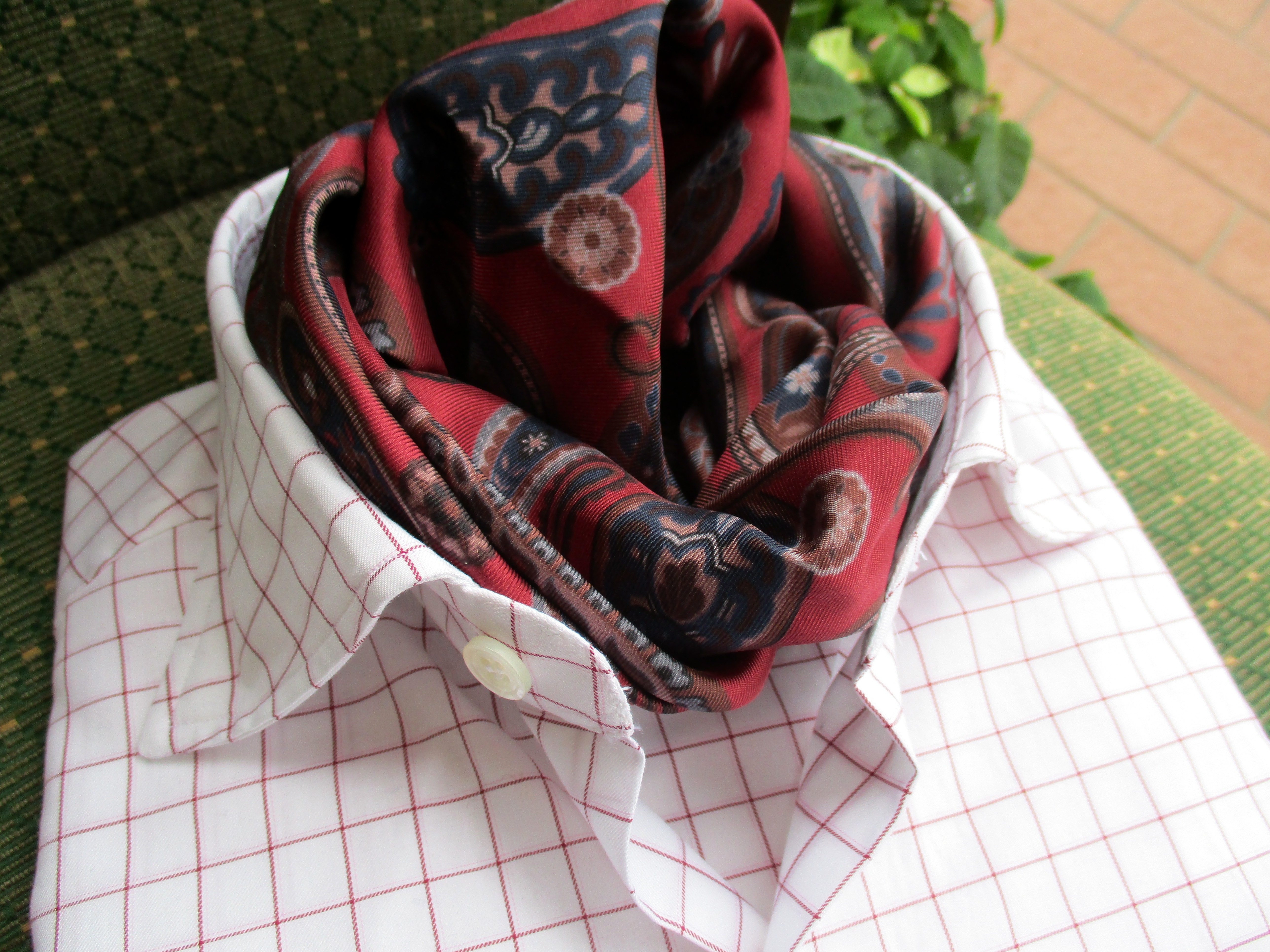 9月9日、JOHN SMEDLEY/ジョン・スメドレーのご案内の際に巻いていました。シャツに差し込むだけで、全体のコーディネートがエレガントに引き締まります。落ち着いたエンジにネイビーやブラウン、グレイなどの色使いされたペイズリーは、白ベースであれば、シャツの柄を選びません。