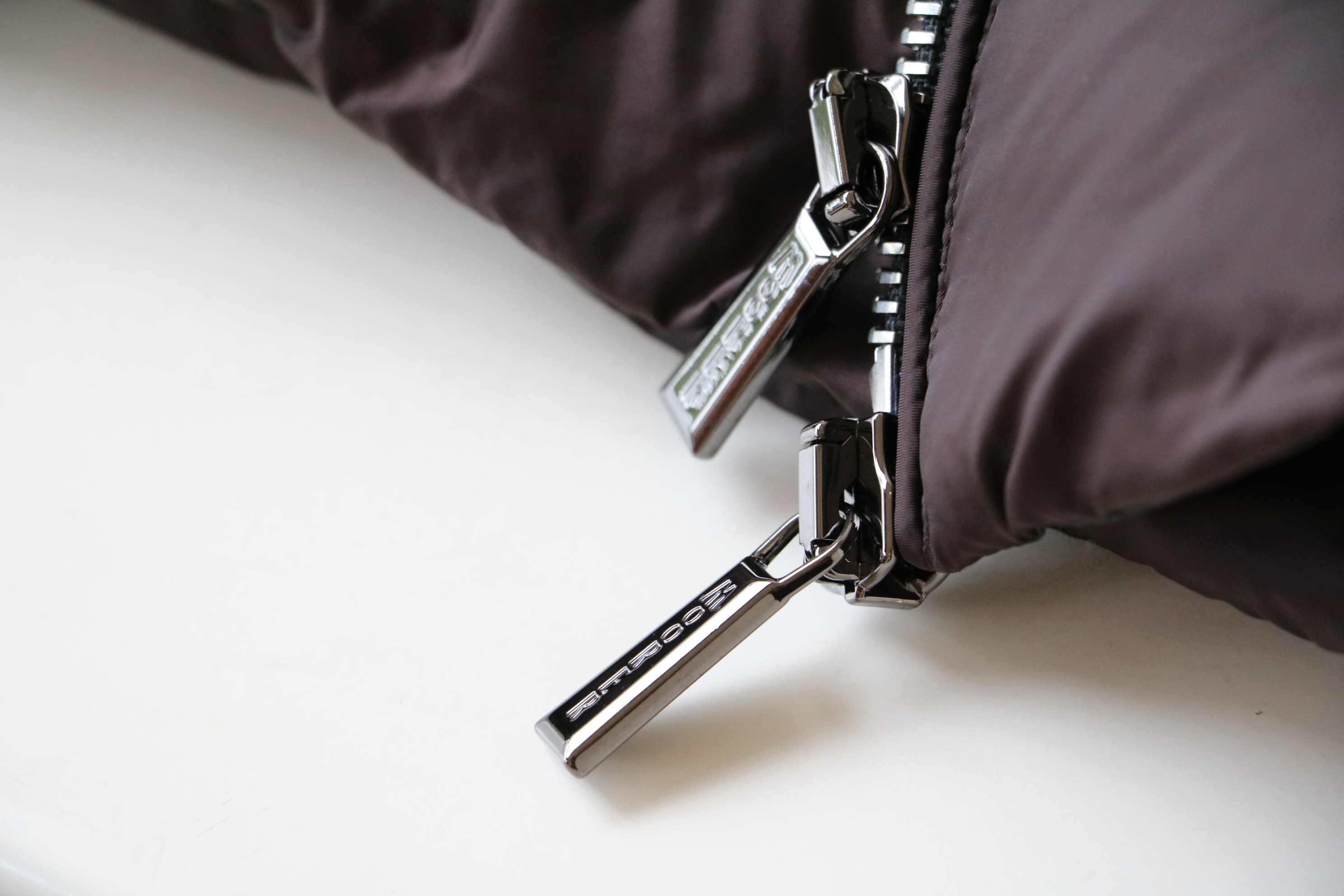 フード一体型のダウンベスト「PERSEO」は、程よくボリュームがあります。ダークブラウンをより美しく見せるのは、ナイロン素材の「SH」。キメの細かい光沢のある生地感です。随分前に、サイズ48と50が入荷。数日前、他のサイズが入荷してきましたが、すでにご用意できるのは、サイズ46と48の各1点ずつとなっています。
