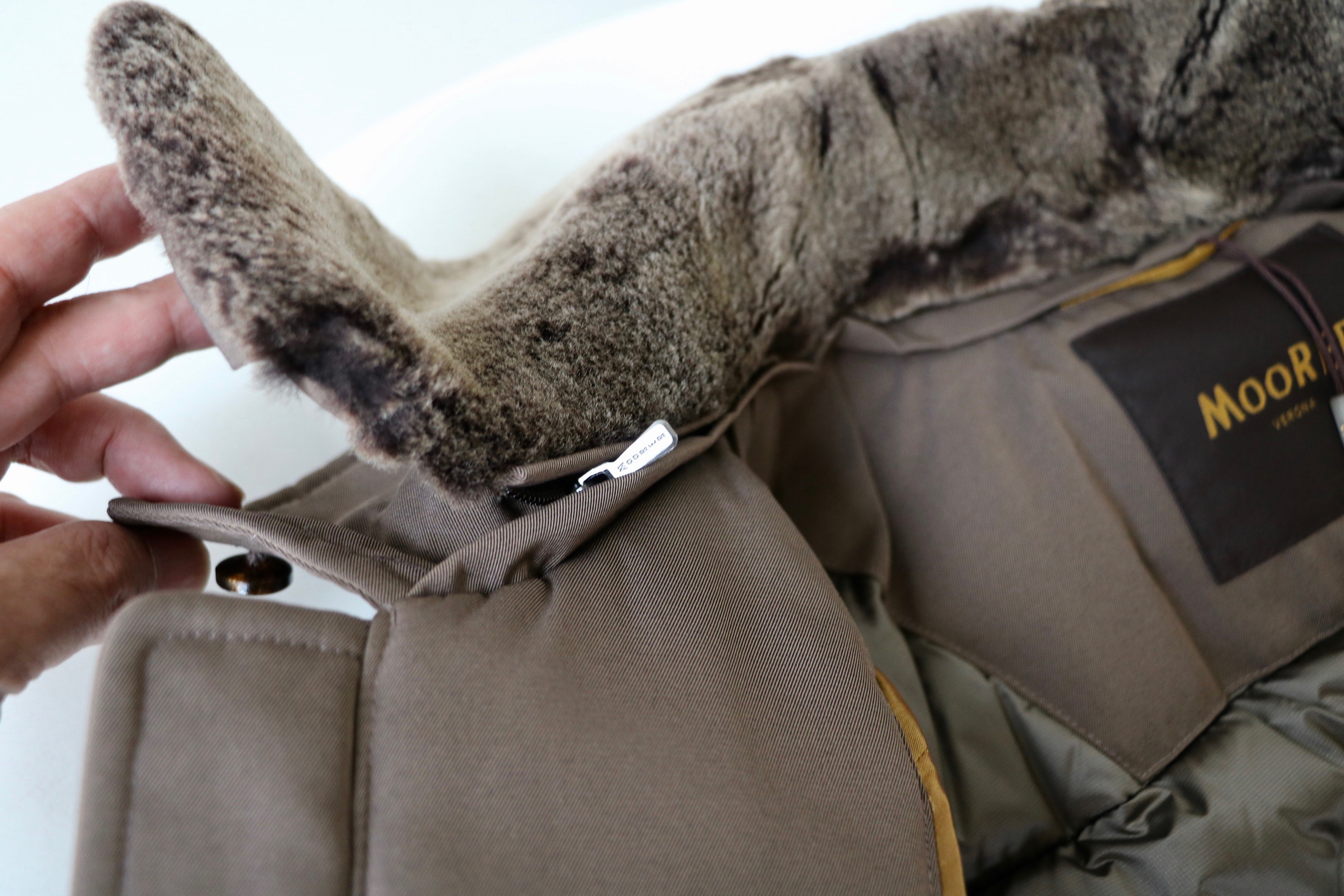 襟裏の釦と襟元のファスナーでファーが簡単に取り外せます。