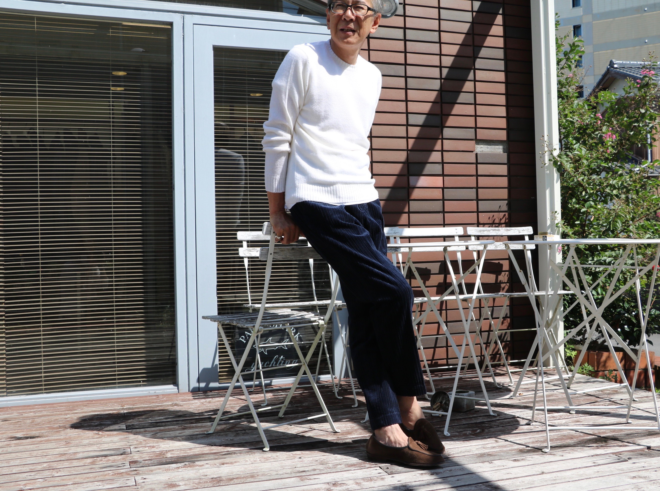 色違いで入荷したのは、スノウホワイト。オフホワイトより黄味があり、アイボリーホワイトよりホワイトに近い色合いになります。合わせたパンツはBorelio(ボレリオ)の親子コールパンツ。シンプルながらも表情豊かなパンツブランドです。足元は横着させていただき、私物のBAUDOIN&LANGE(ボードインアンドランジ)。現在、カシェート展開で、ニューモデルも入荷しているようです。