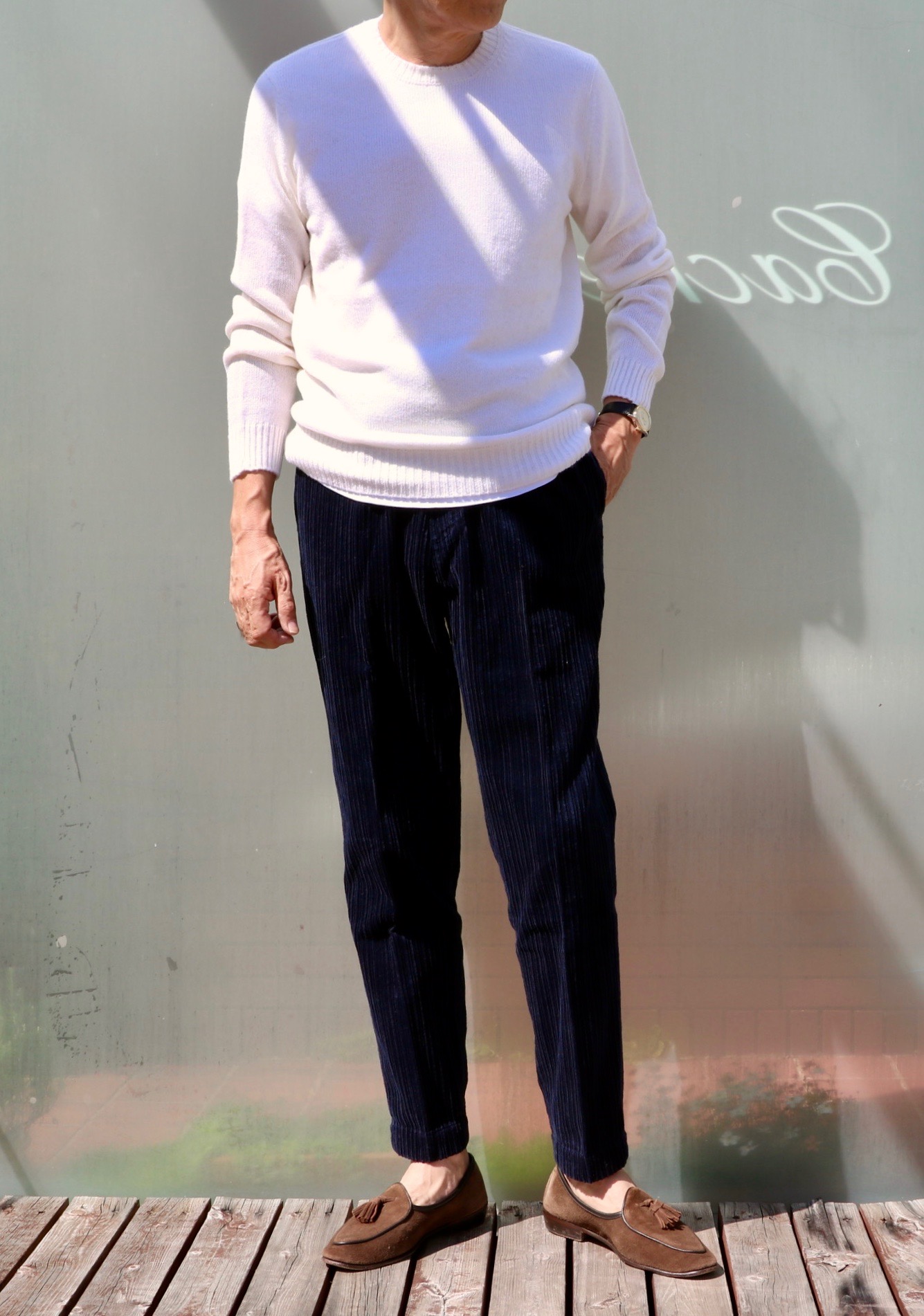 合わせたニットはFEDELI(フェデーリ)、パンツはJACOB COHEN(ヤコブ・コーエン)です。