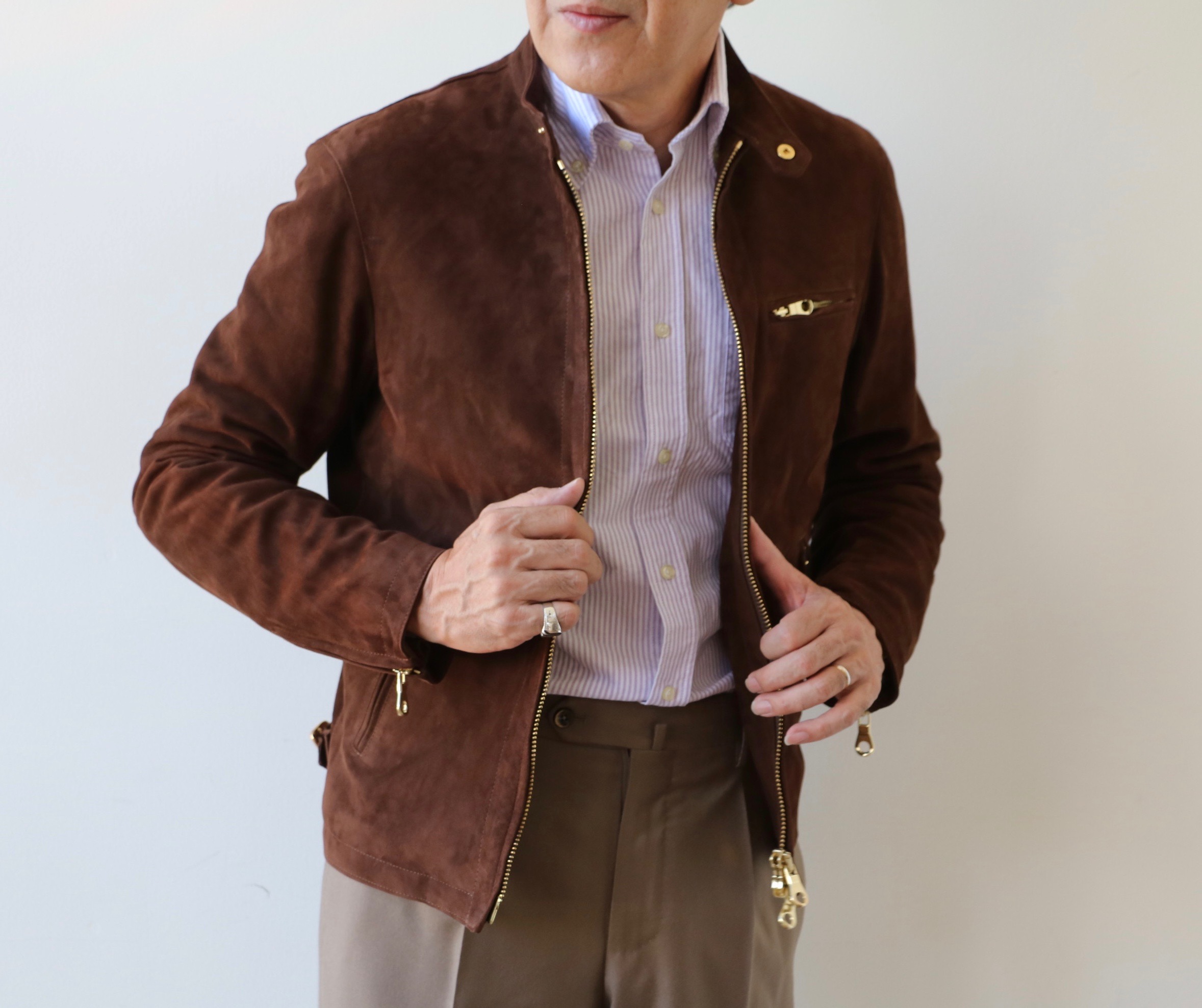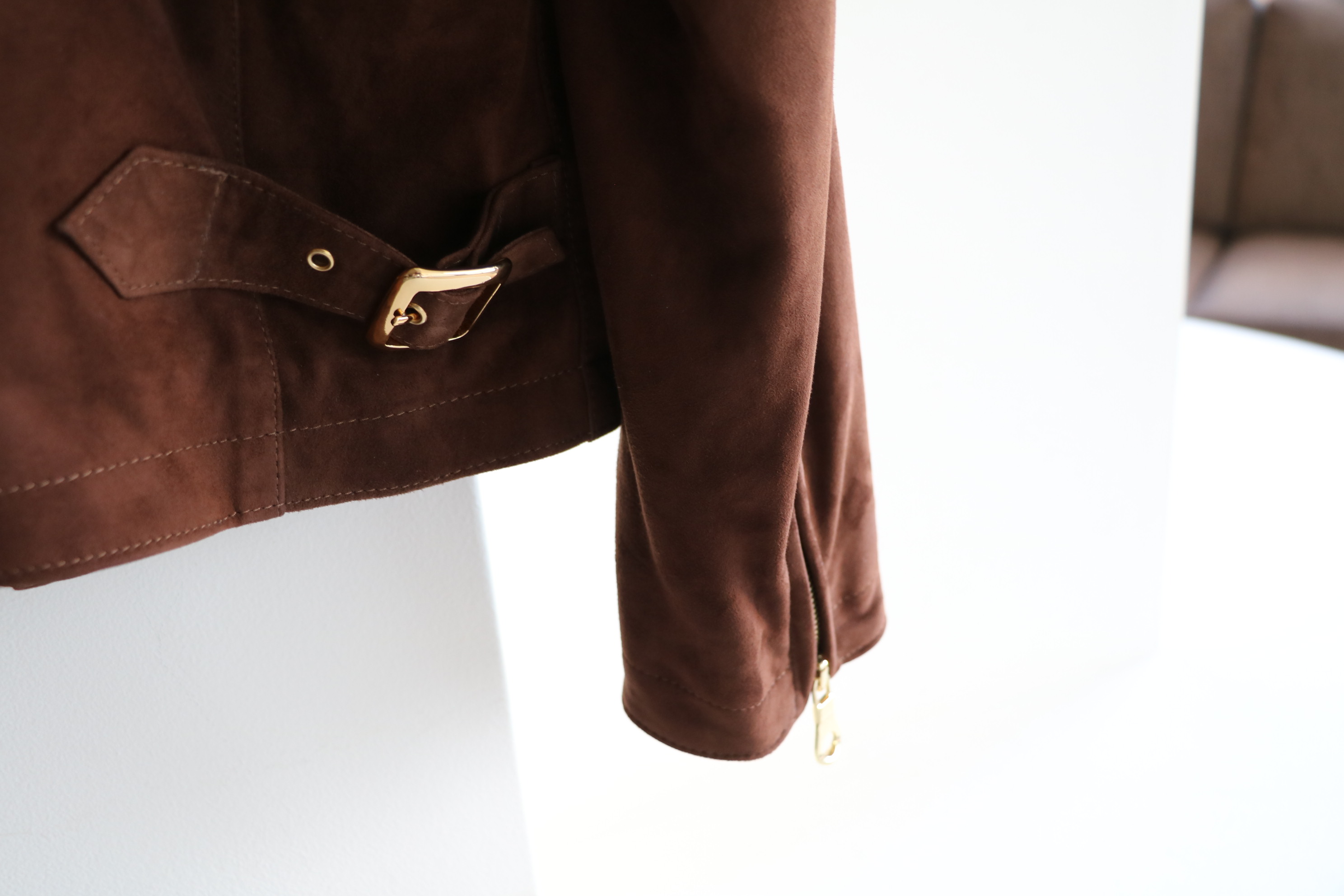 ゴート(山羊)スウェードは、カウハイド(牛革)に比べ、薄くても強度を保つことができます。日本に高温多湿の時期がなく、カラッとした天気であれば、シーズンレスで。ノースリーブのワンピース姿の横にレザー姿の2枚目は、かつて観た映画のワンシーンでした。セレクトカラーは、ダークブラウンと一言で言い表すことはできません。ごく暗い赤みのある黄がかった?そうチェスナットブラウンが適切です。ゴールドの金具と裏地が相まって、華やいだ艶のあるスエードのシングルライダースに仕上がりました。
