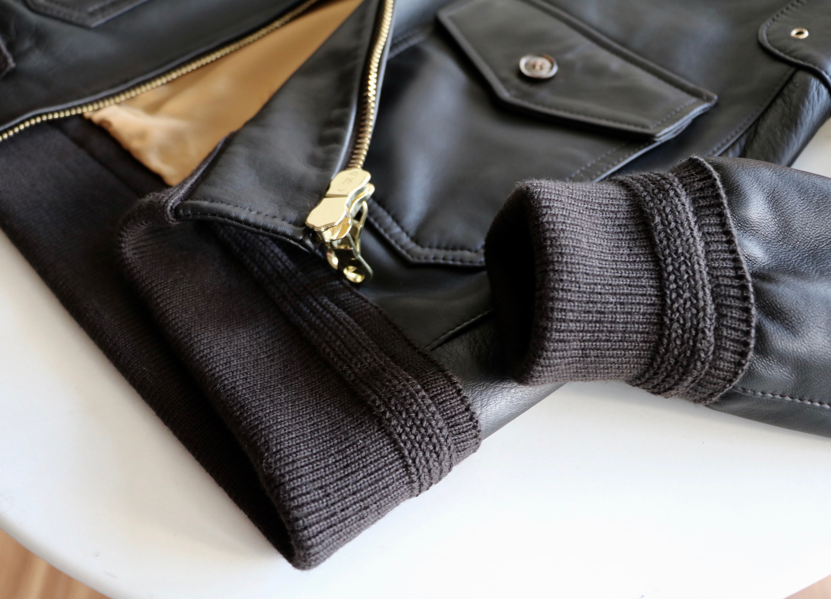 ブラックレザーをハードに見せないのは、ゴールドジップと黄金色に輝く裏地。さらに心を惹きつけたのが、ボアと袖裾のリブのコントラストをつけ過ぎないブラウンとのコンビ。実にさりげなく、優しさを含んだG1モデルに仕立てているんです。