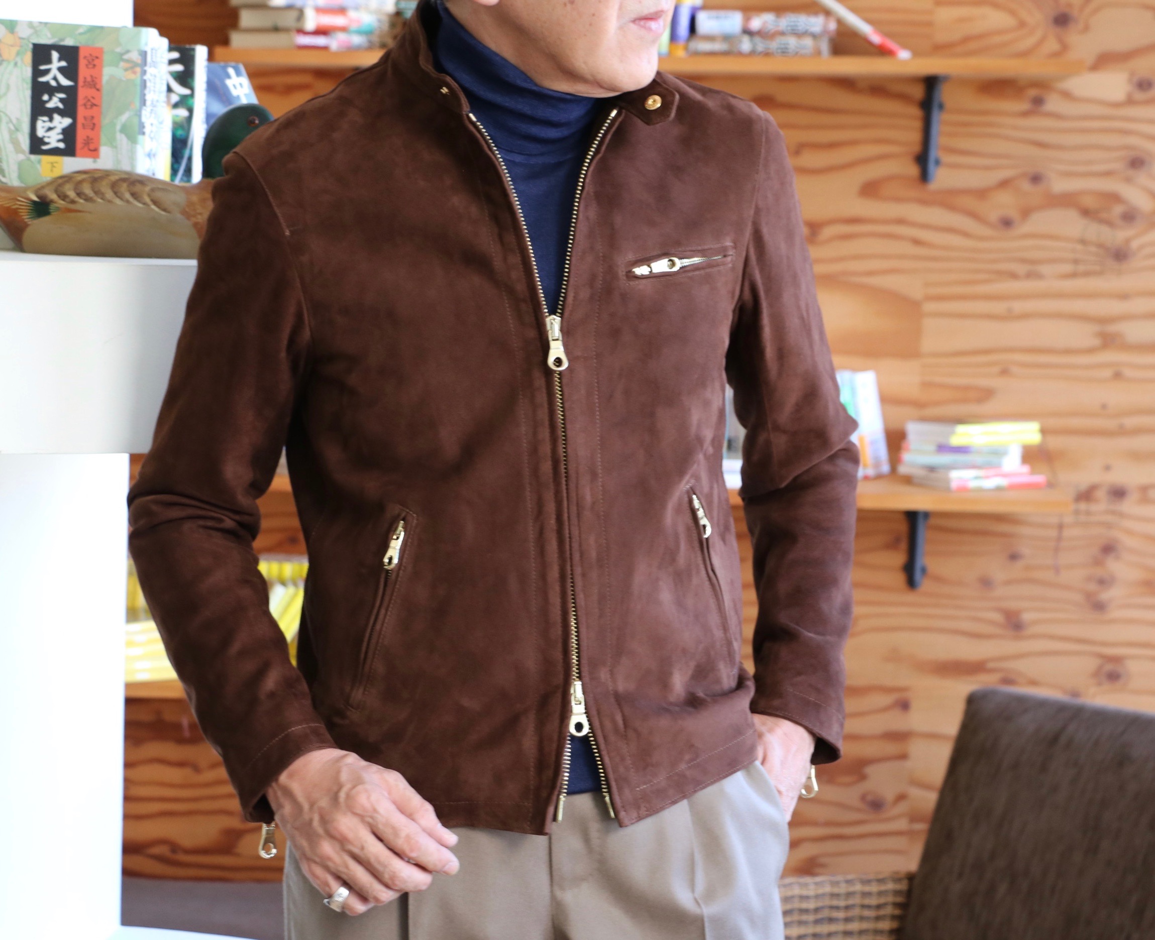 最初にご紹介するのは、ゴート(山羊)スエードのシングルライダース モデル「H-502」。やや遅い納期にやきもきしましたが、ようやく入荷してきました。SILENCE(サイレンス)同様、グローリーガイのレザー部門では欠かせないブランドだけに、ほっと安堵です。