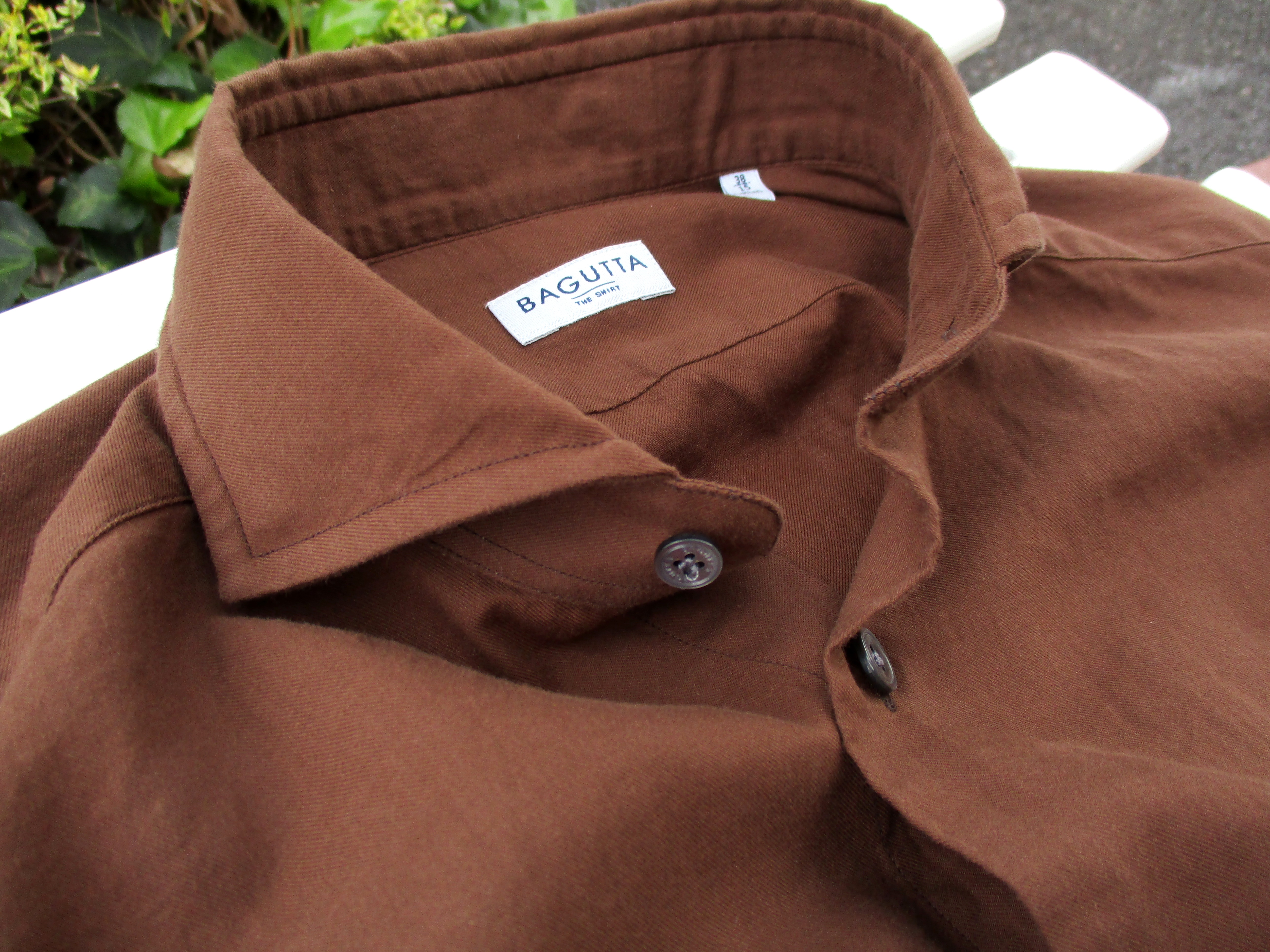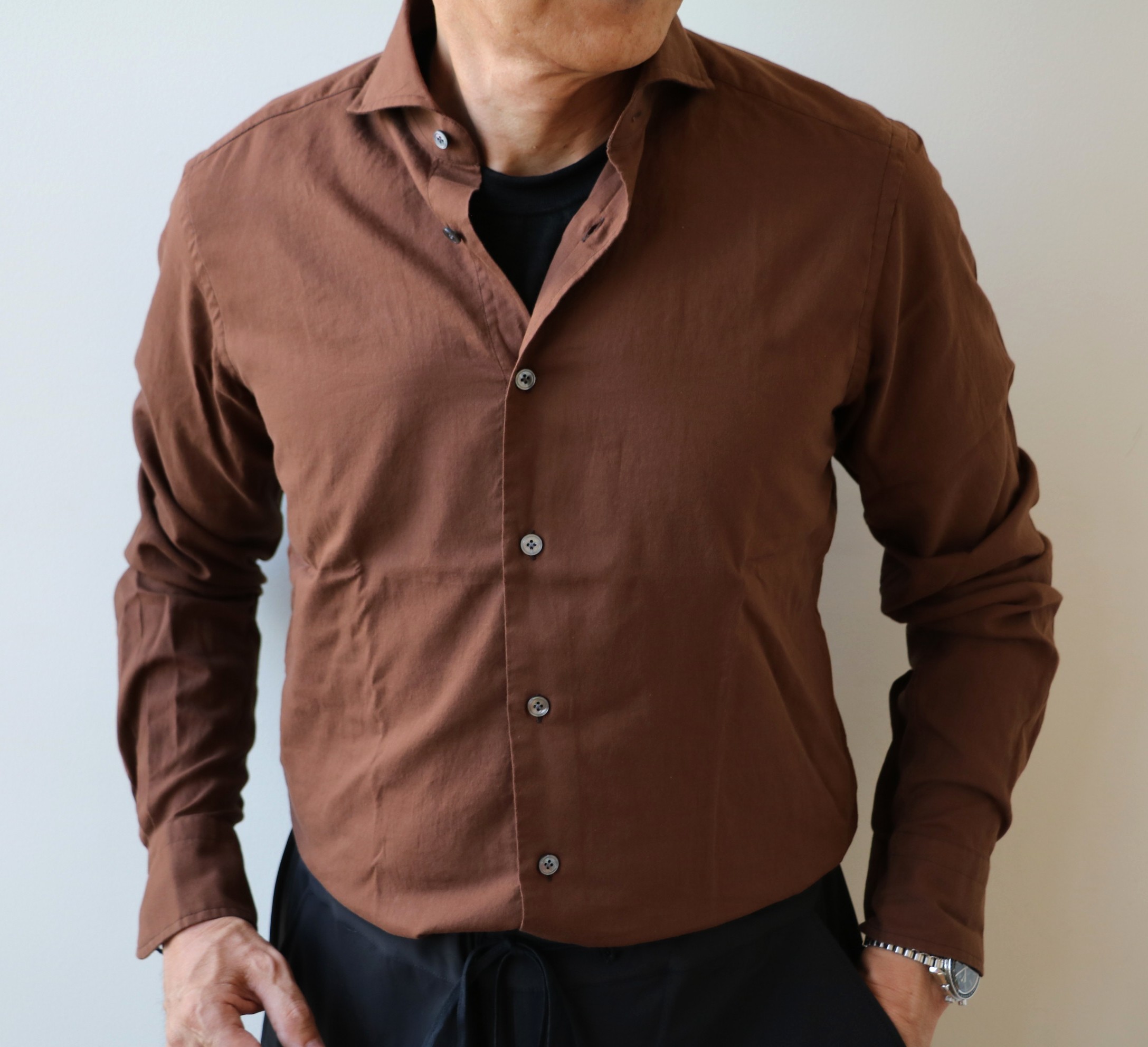 イタリア名門生地ブランド「Albini/アルビニ」社の生地を使ったシェンナブラウンの無地シャツ。ほんの少し起毛感があり、柔らかな着心地です。あまりの顔映りの良さに、「我先走了」してしまったシャツです。相変わらず、分かりづらい言葉で申し訳ございません。中国語で、意味は「お先に失礼します」。要するにご案内の前に購入してしまったということです。すいません!!