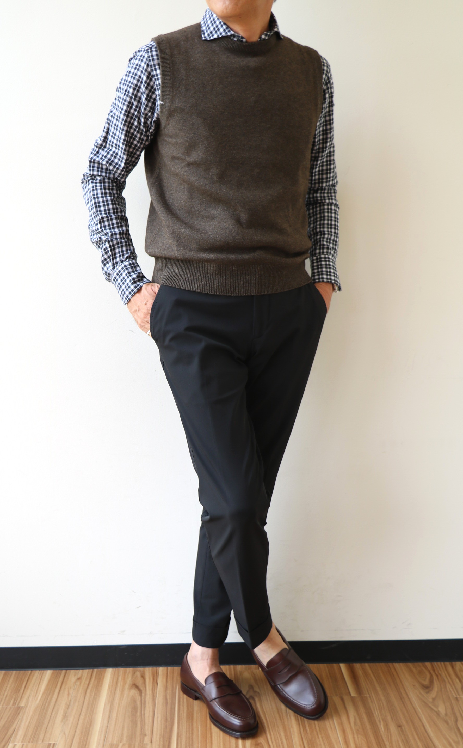 コーディネートで合わせたのは、Finamore(フィナモレ)のタブカラー。オックスフォードのブルーとも考えましたが、都会的に見せるためにブロードクロスのホワイトを選びました。ネクタイは、Holliday&Brown(ホリディ&ブラウン)。出世が英国だけに波長は合います。ニットベストは、Settefili Cashmere(セッフィーリ カシミア)の定番となっているダブルブレストのニットジレ。ブラックを差し込む事で、全体が引き締まり、モダンに見せます。近々のご案内です。ボトムは、INCOTEX(インコテックス)のサキソニートラウザース。チャコールグレイも合いますが、ここは円やかなブラウンを選んでおります。足元は、相変わらず代わり映えしませんが、私物のCROCETT&JONES(クロケット&ジョーンズ)です。休み明けに再入荷しますので、気になられる方は声をかけてください。