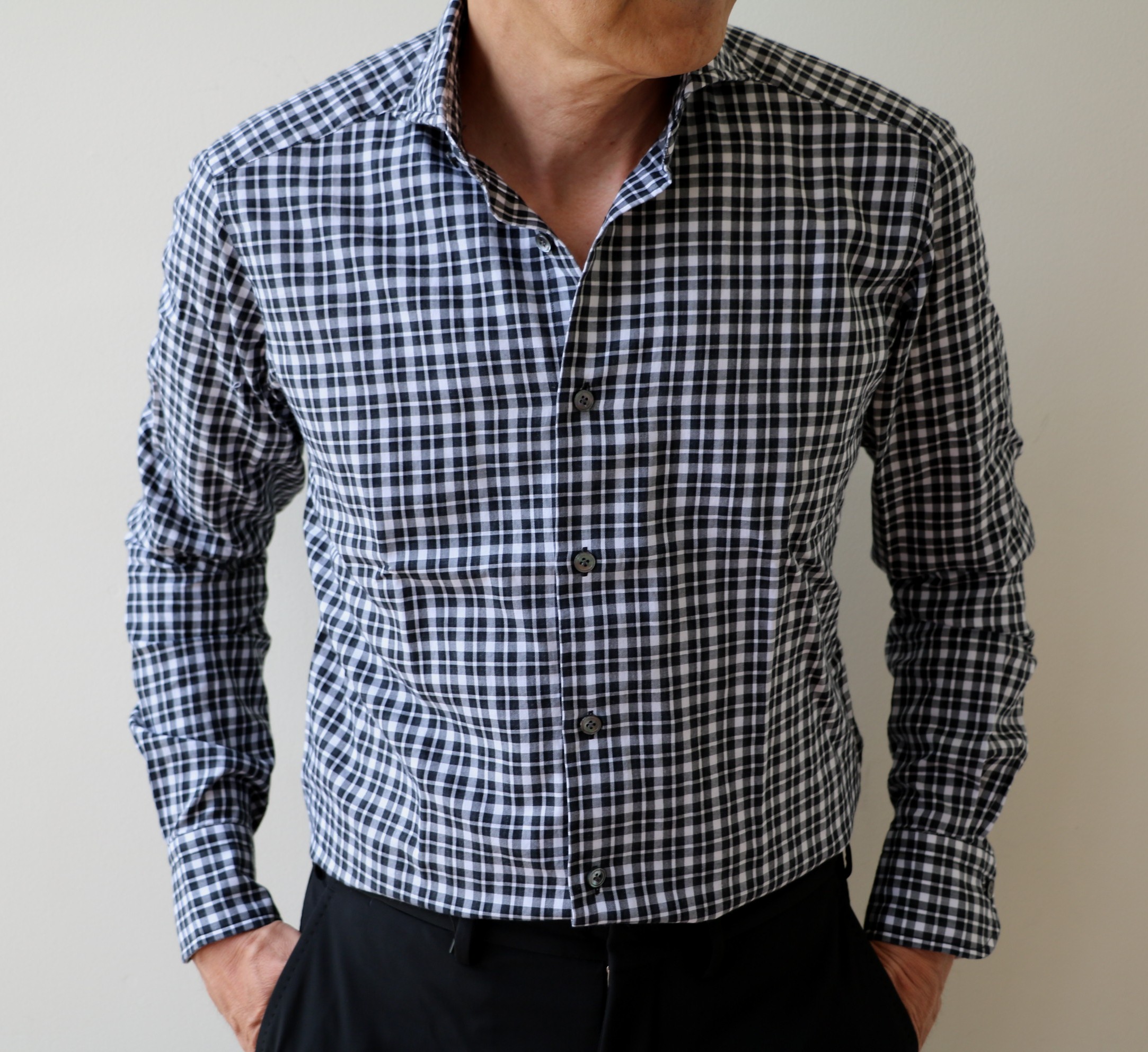 コットン100%のツイル地は、一目で質の良さを感じます。ギンガムチェックの単調さとは違い、大人の奥行きある柄行きに、モダンなブラックが乗ることで、どこか懐かしさと新鮮さが交差します。モデルは、日本人の体型にも程よく合う、英国顔のワイドスプレッド「SIENAK」で選んでおります。